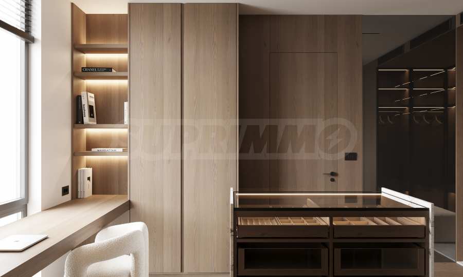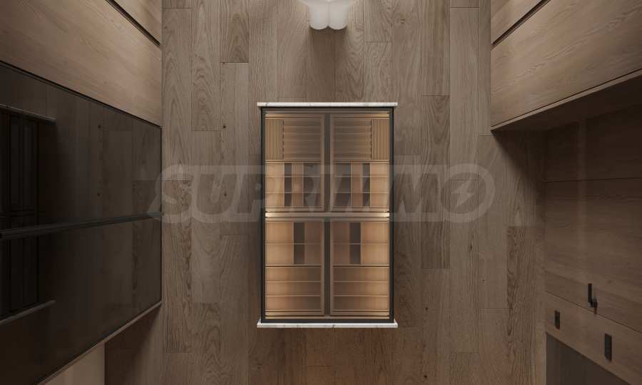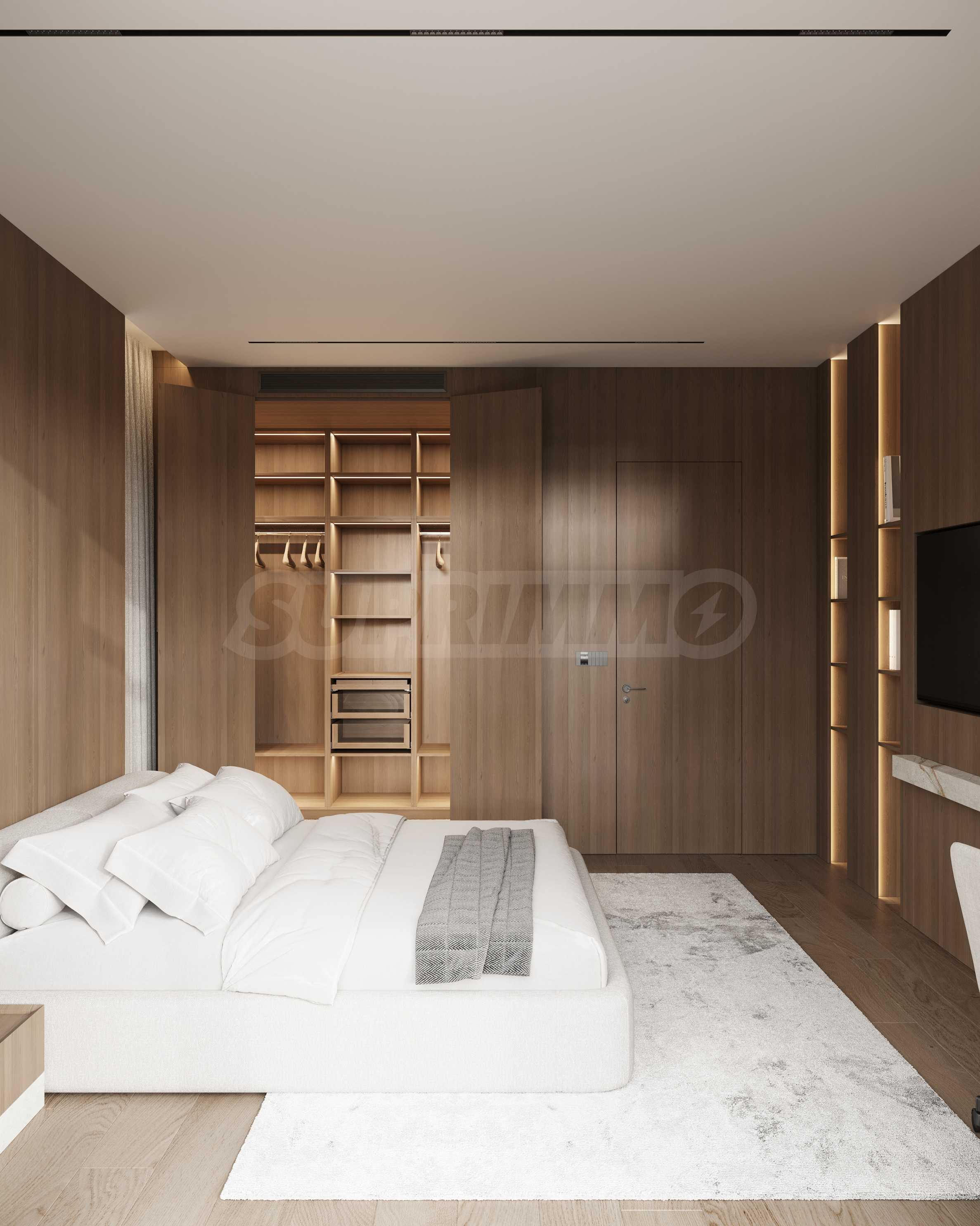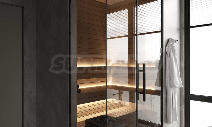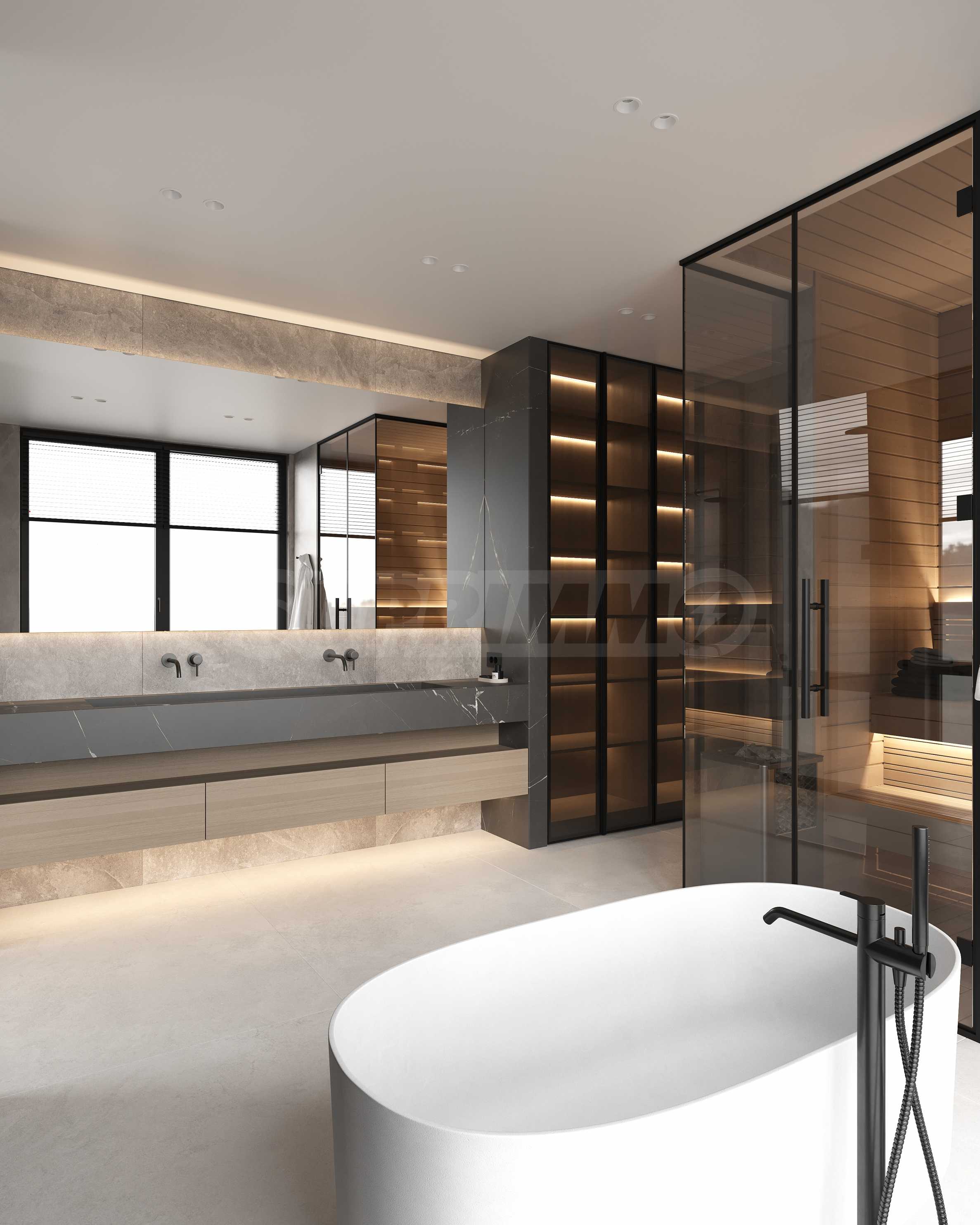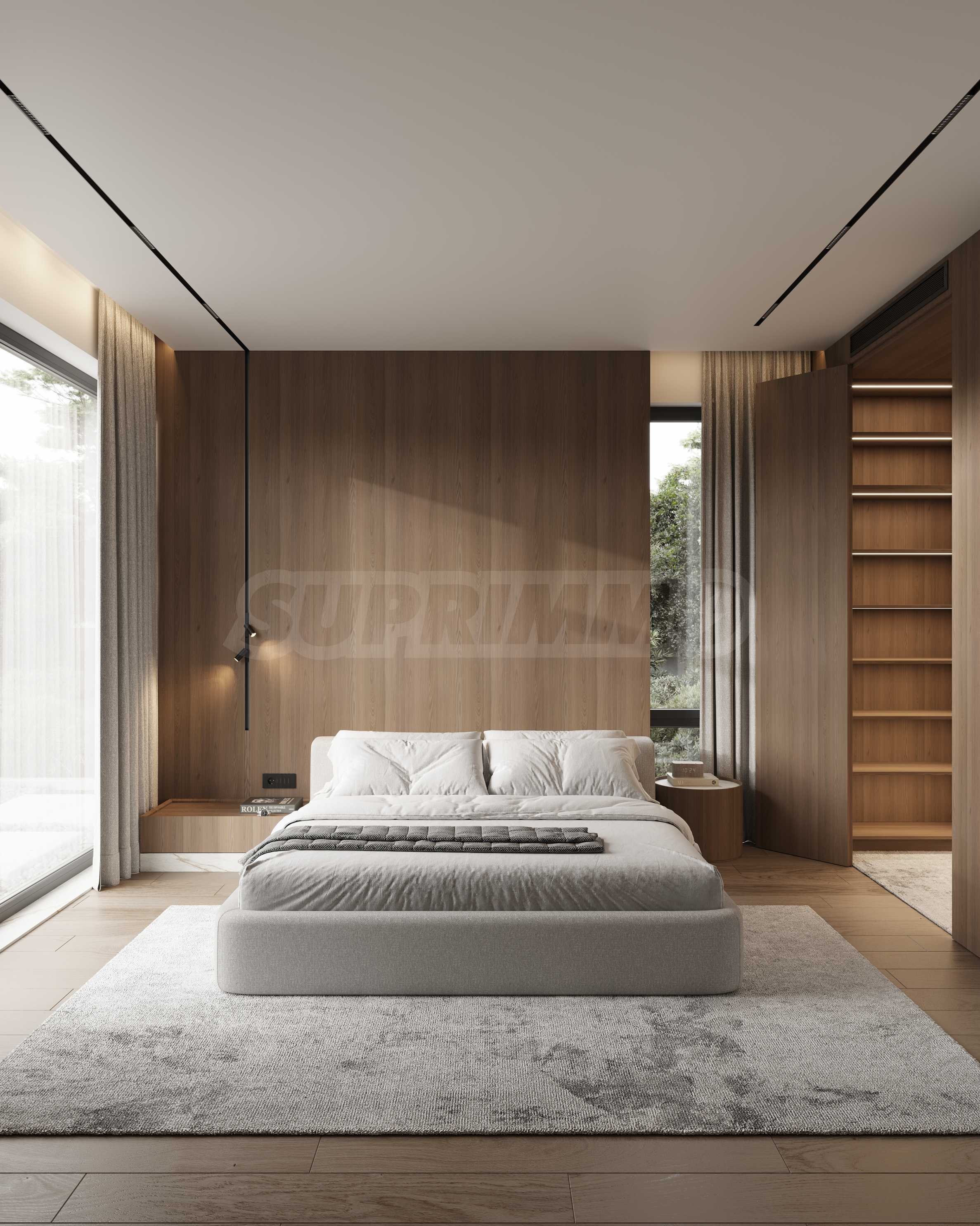 • Ebene 2: Hauptschlafzimmer (28,47 m²) mit großem Kleiderschrank (18,48 m²) und Badezimmer mit WC (15,91 m²) und Sauna, ein zweites Schlafzimmer mit Kleiderschrank und Badezimmer mit WC, ein drittes Schlafzimmer mit Badezimmer mit WC und eine Waschküche.