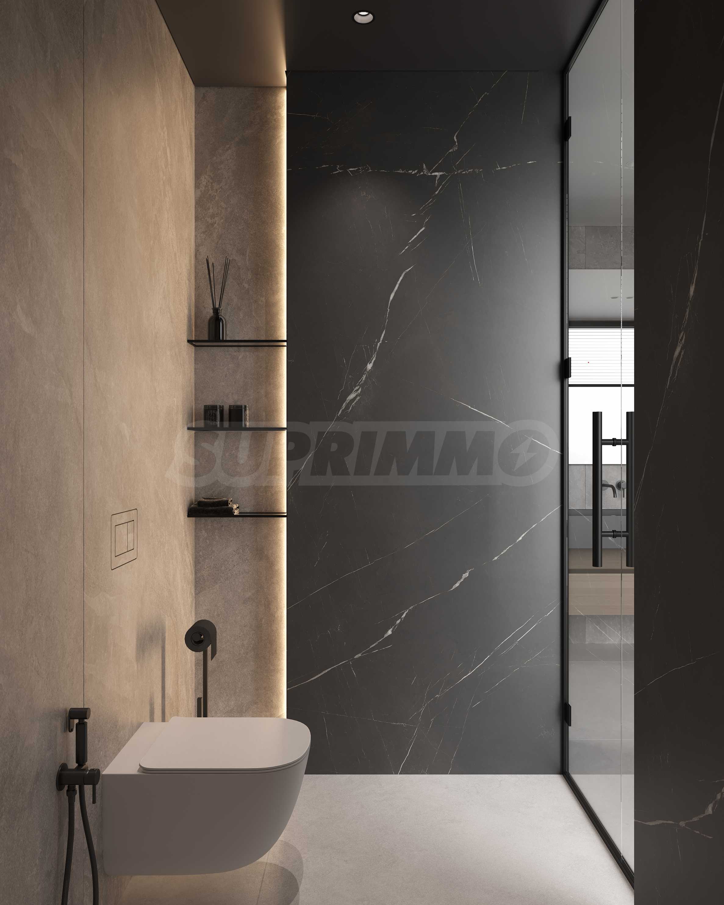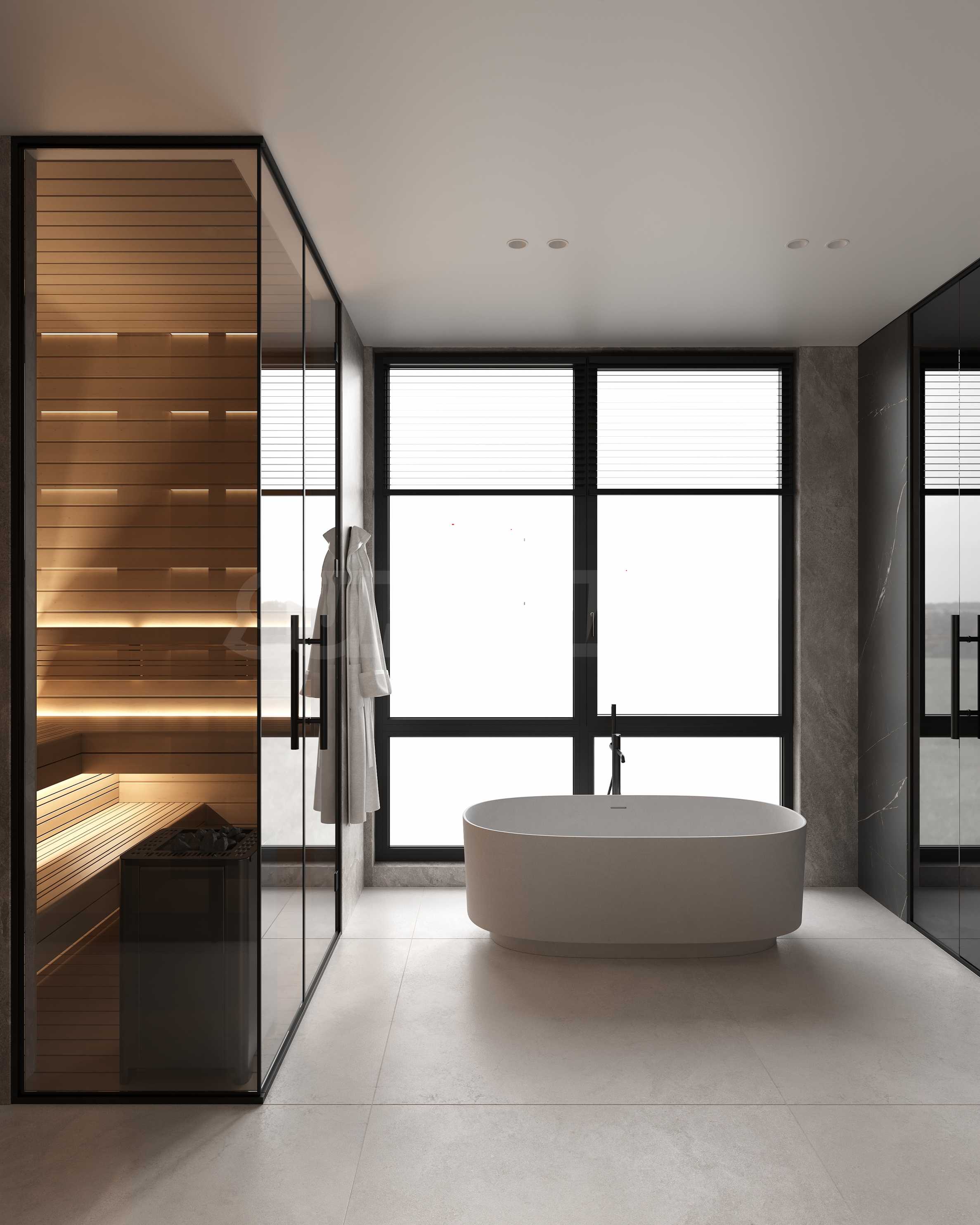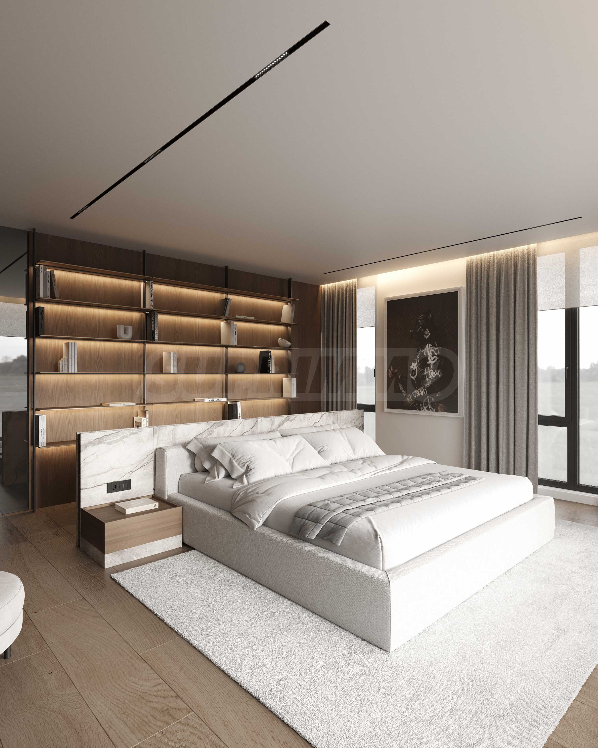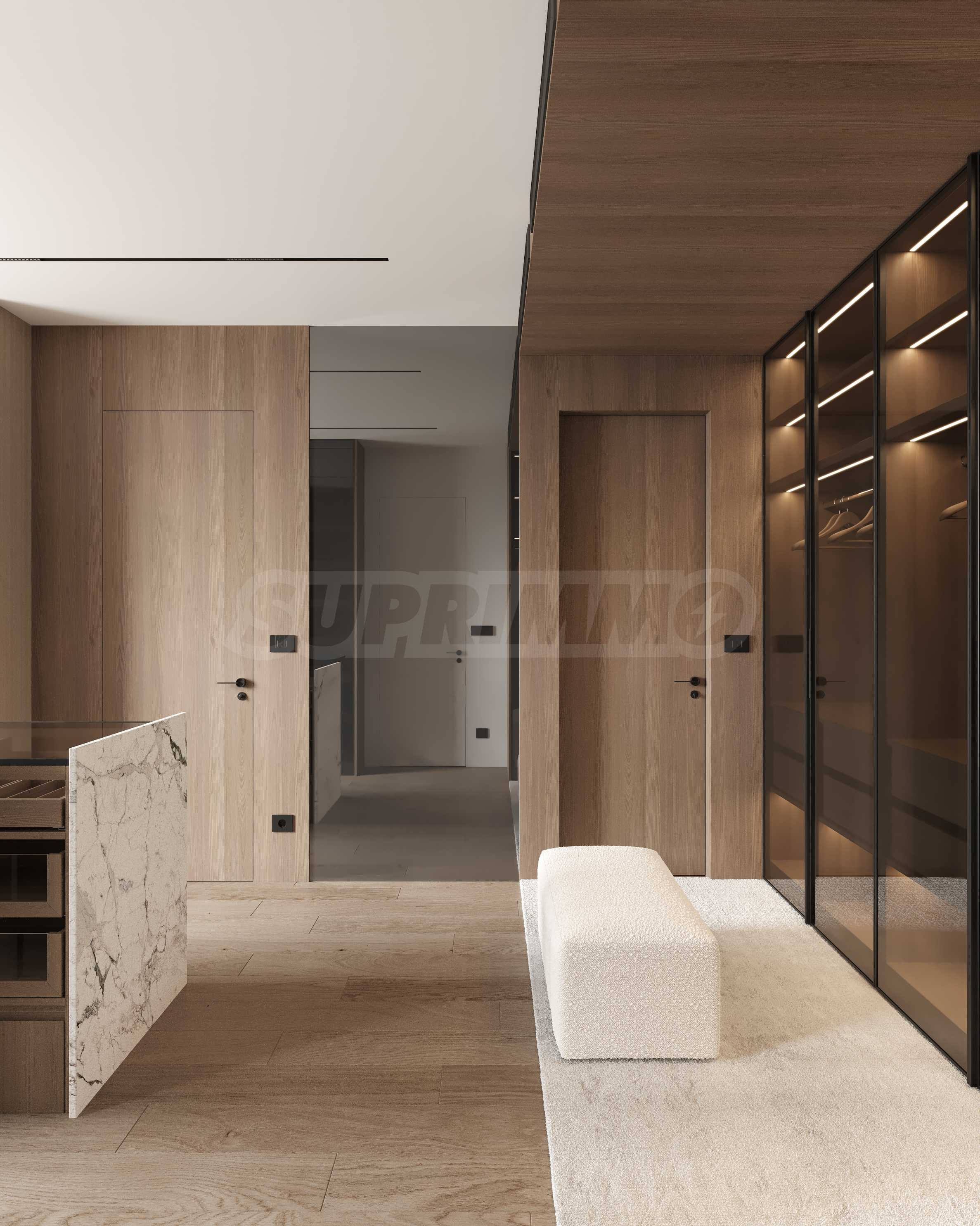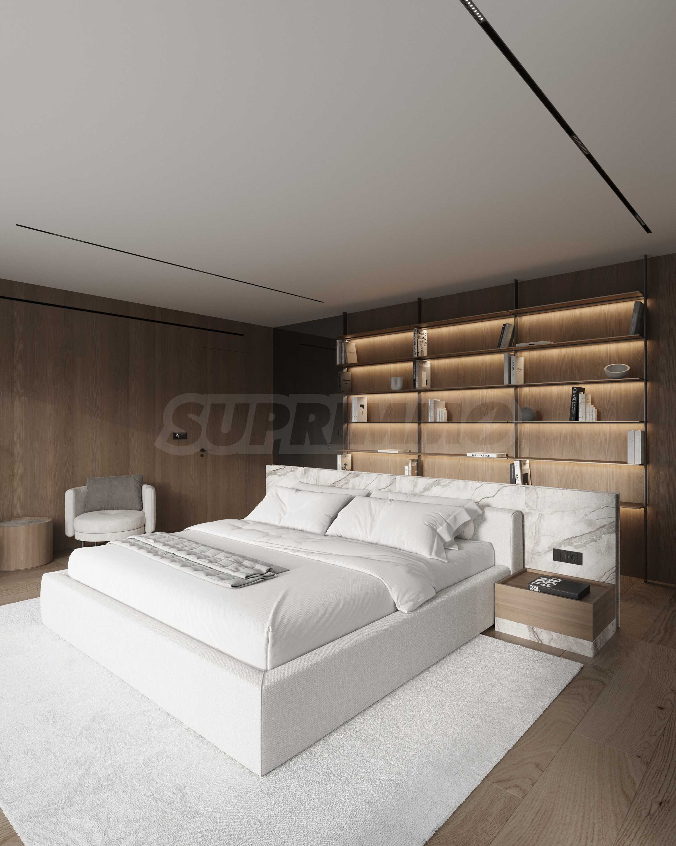• Ebene 2: Hauptschlafzimmer (28,47 m²) mit großem Kleiderschrank (18,48 m²) und Badezimmer mit WC (15,91 m²) und Sauna, ein zweites Schlafzimmer mit Kleiderschrank und Badezimmer mit WC, ein drittes Schlafzimmer mit Badezimmer mit WC und eine Waschküche.