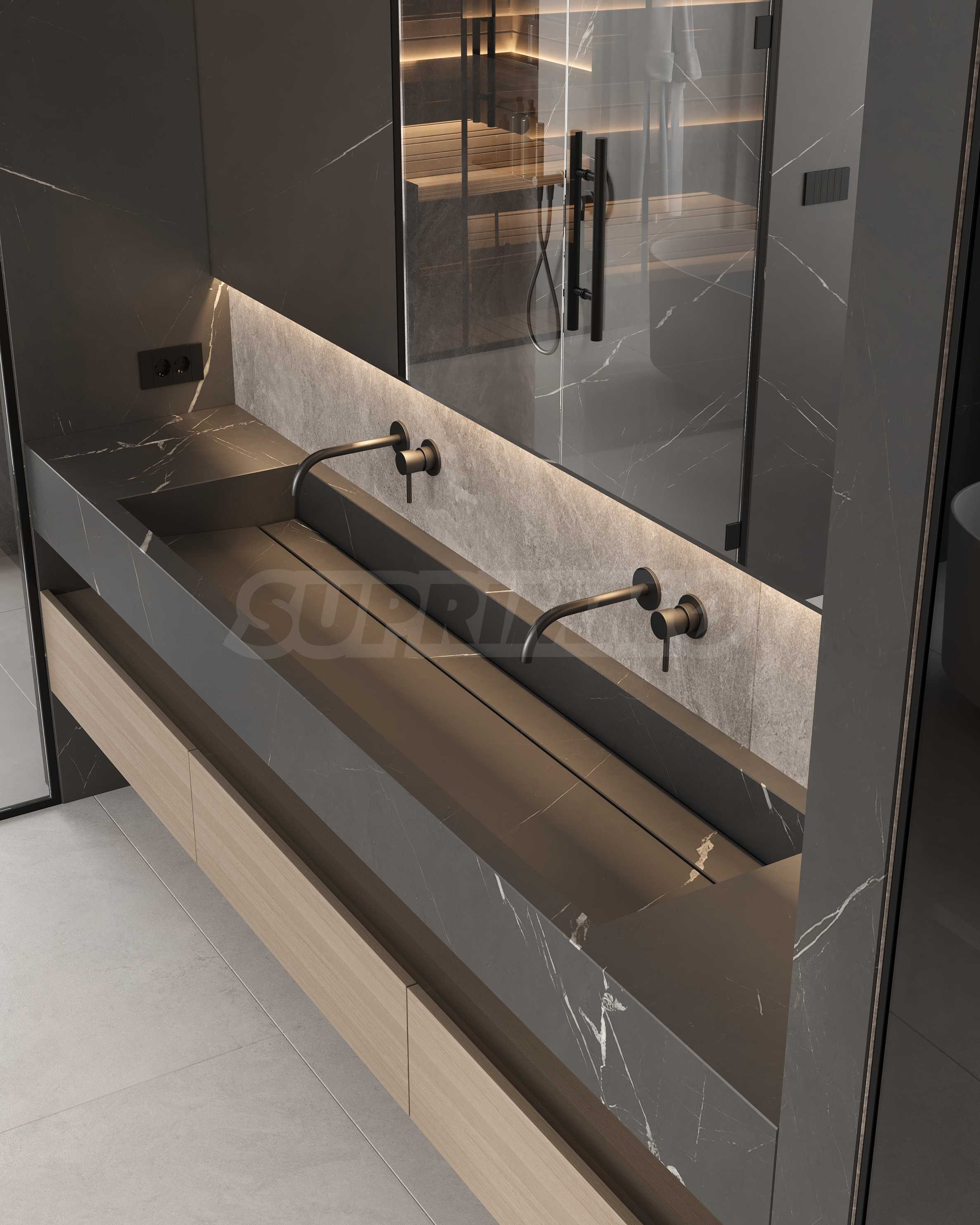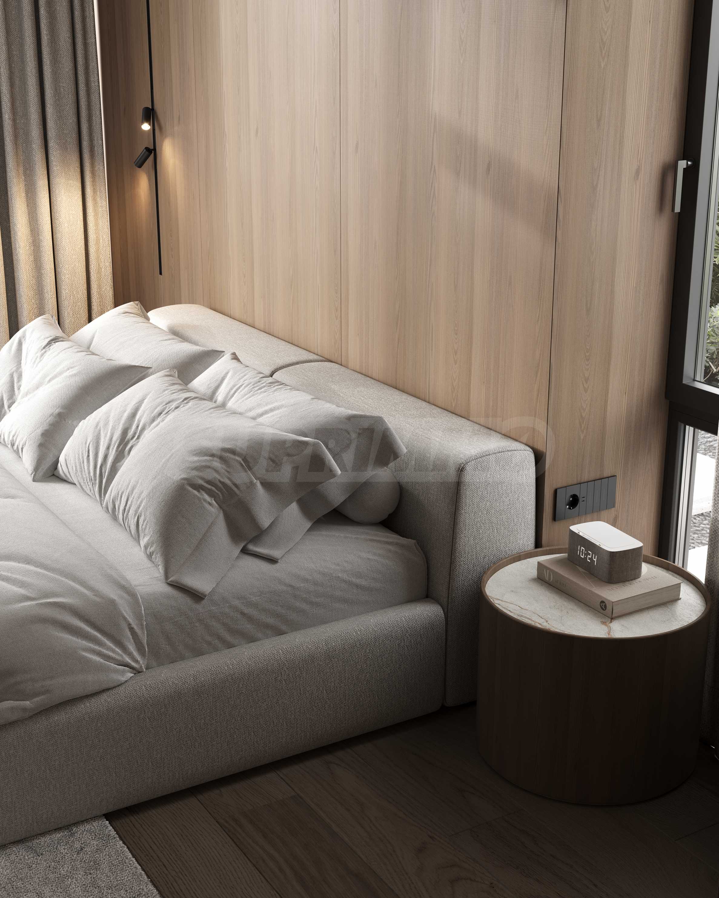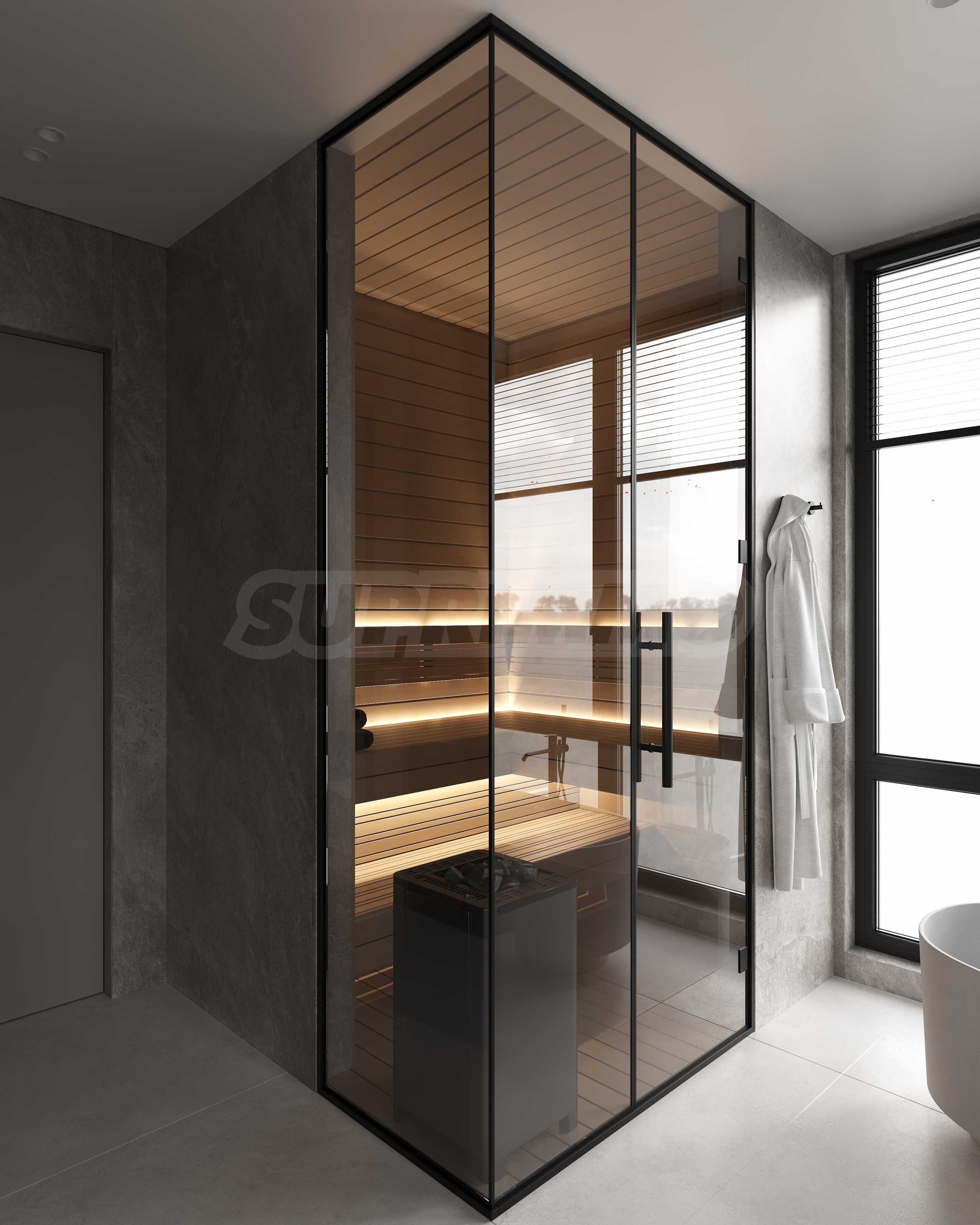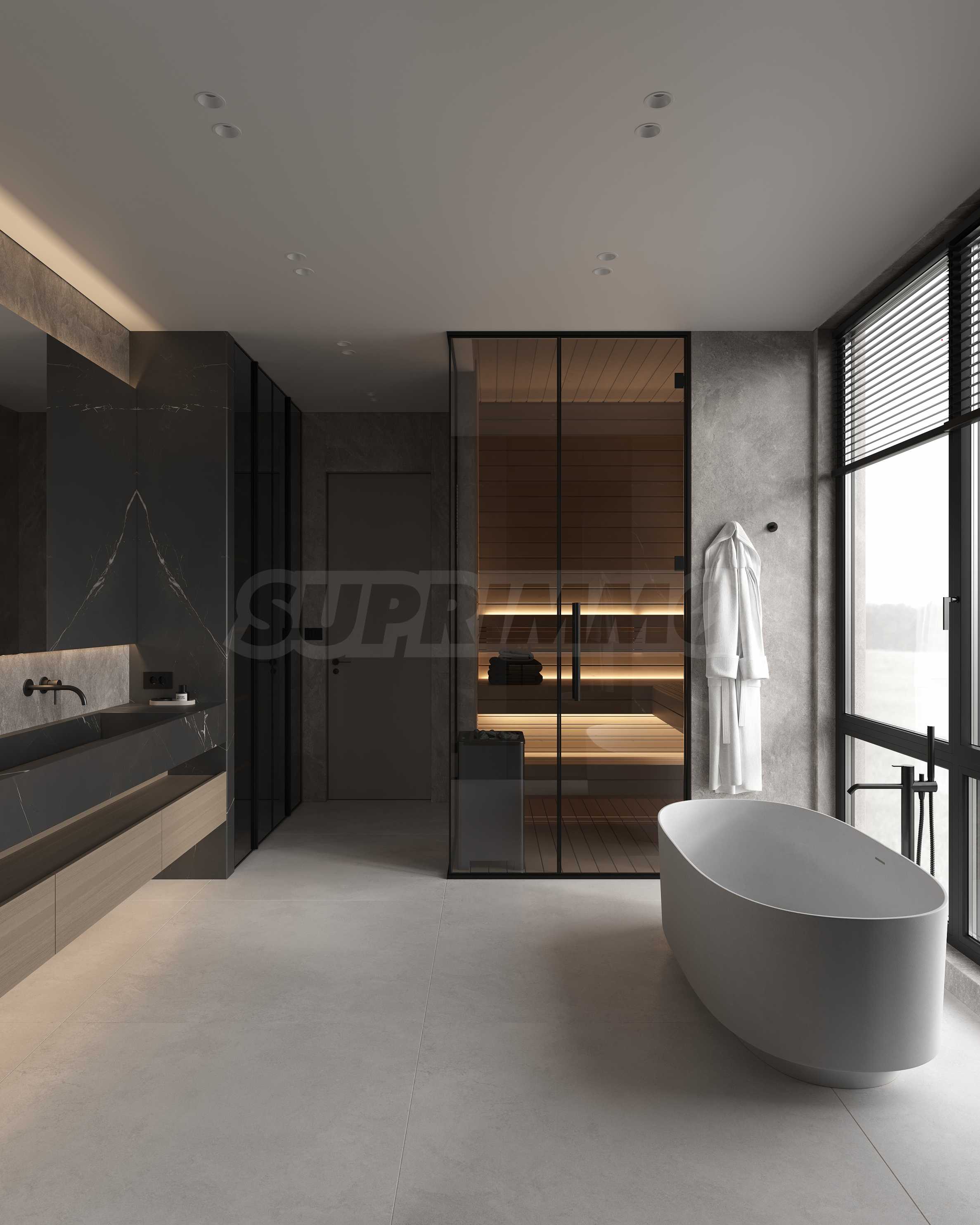 • Ebene 2: Hauptschlafzimmer (28,47 m²) mit großem Kleiderschrank (18,48 m²) und Badezimmer mit WC (15,91 m²) und Sauna, ein zweites Schlafzimmer mit Kleiderschrank und Badezimmer mit WC, ein drittes Schlafzimmer mit Badezimmer mit WC und eine Waschküche.