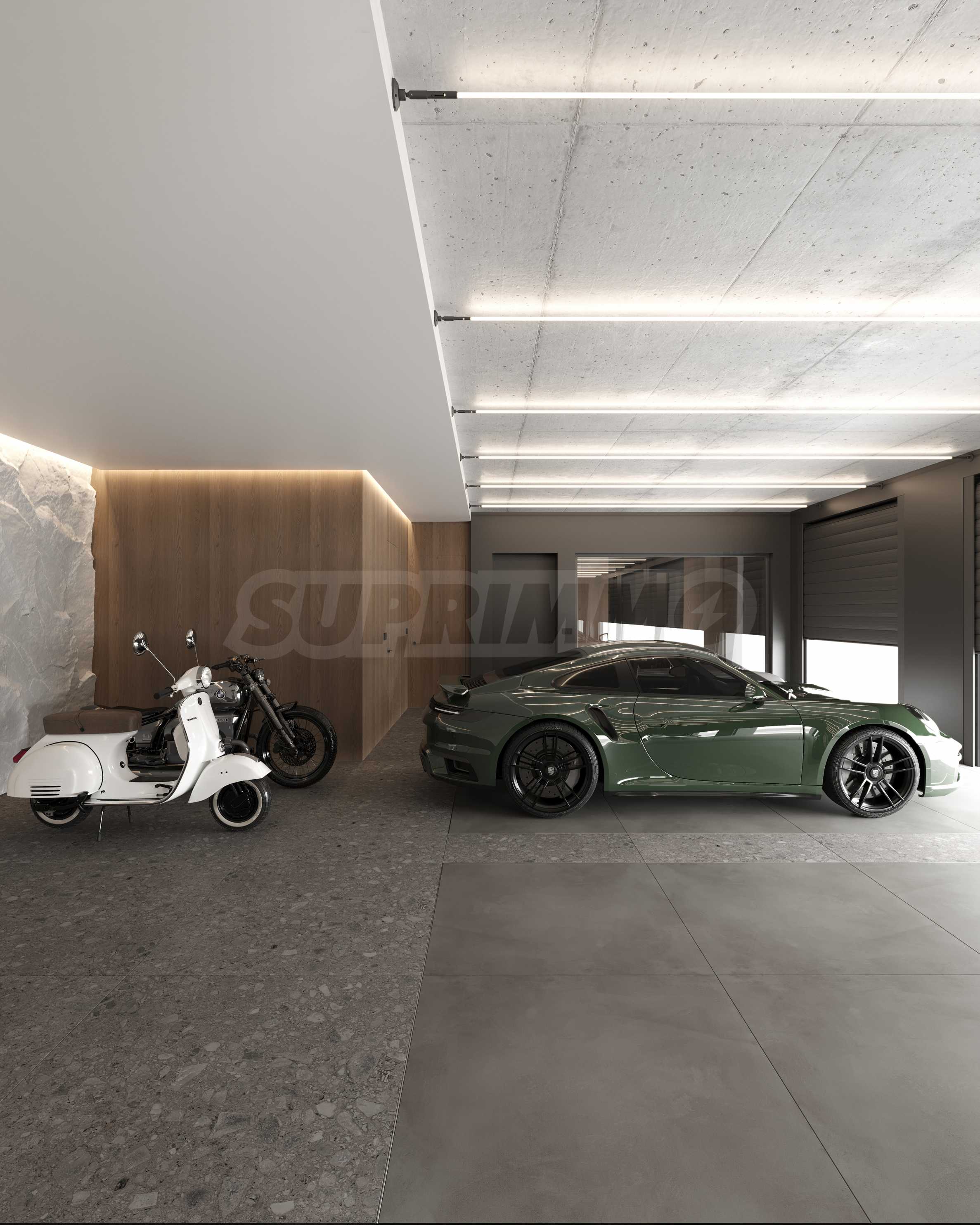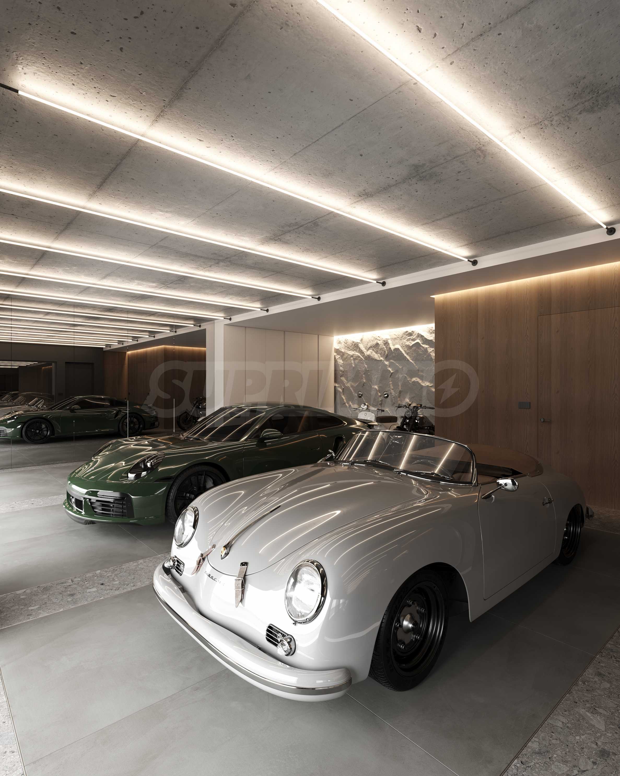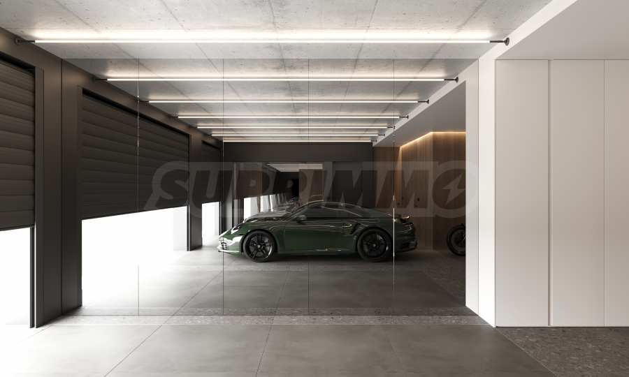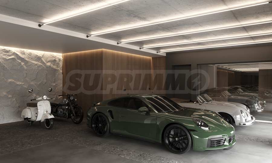 • Untergeschoss: Garage für drei Autos, Kinosaal, drei Abstellräume und eine Toilette;