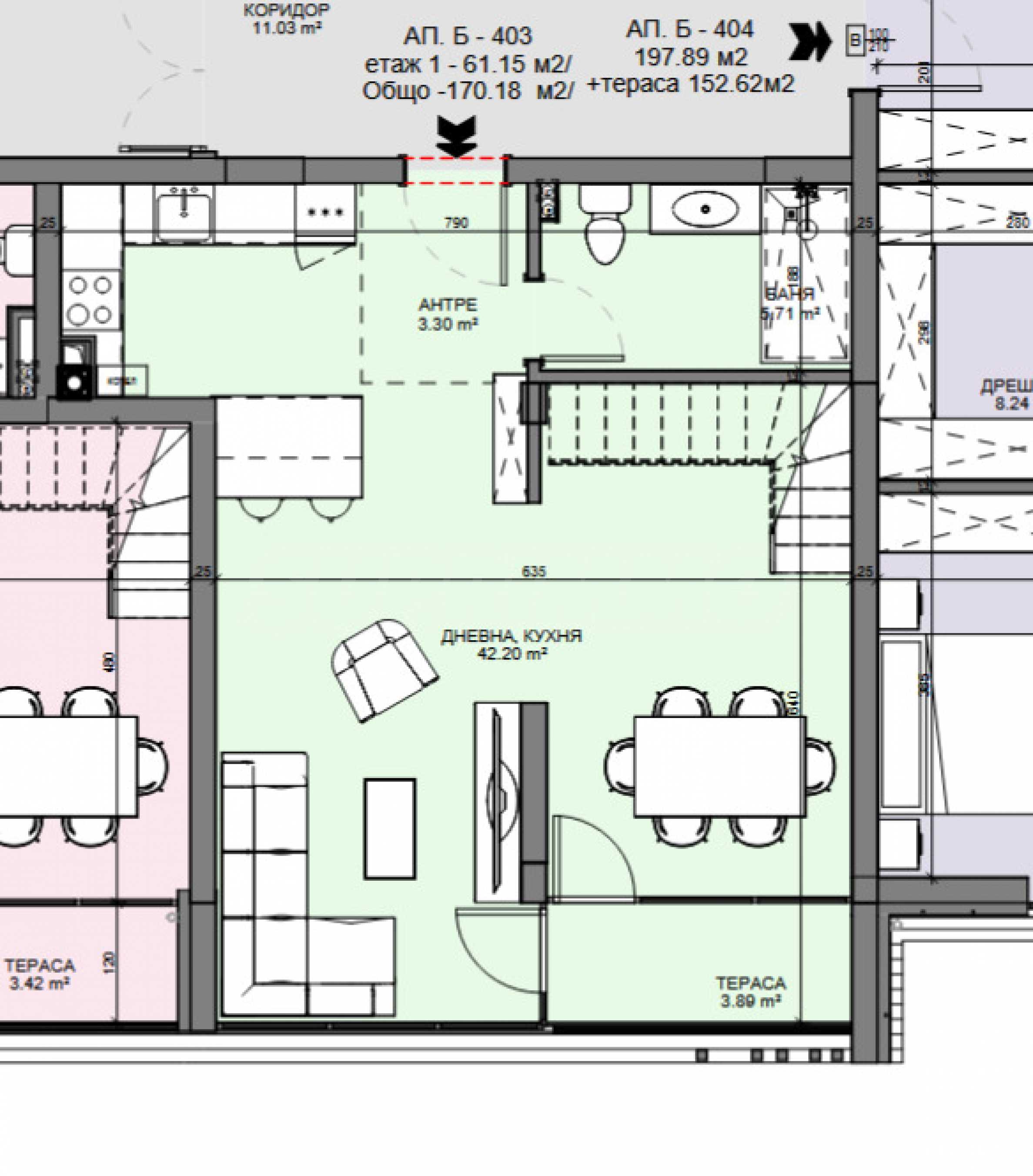 Der Komplex ist in drei Abschnitte gegliedert: zwei Wohngebäude und ein dazwischenliegendes Restaurant, das die beiden Bereiche harmonisch miteinander verbindet. Die Gebäudehöhen betragen 2,50–2,60 Meter für Gebäude B und über 3,20 Meter für Gebäude A. Geplant sind 58 Wohnungen, die sich zusammenlegen lassen – Studios sowie Apartments mit ein, zwei und drei Schlafzimmern, teils mit Gartenterrasse, teils als Maisonette-Wohnungen. Die Wohnungen sind auf höchsten Wohnkomfort ausgelegt, und die Panoramaverglasung des Gebäudes sorgt für viel Tageslicht und einen atemberaubenden Blick auf die umliegende Natur.