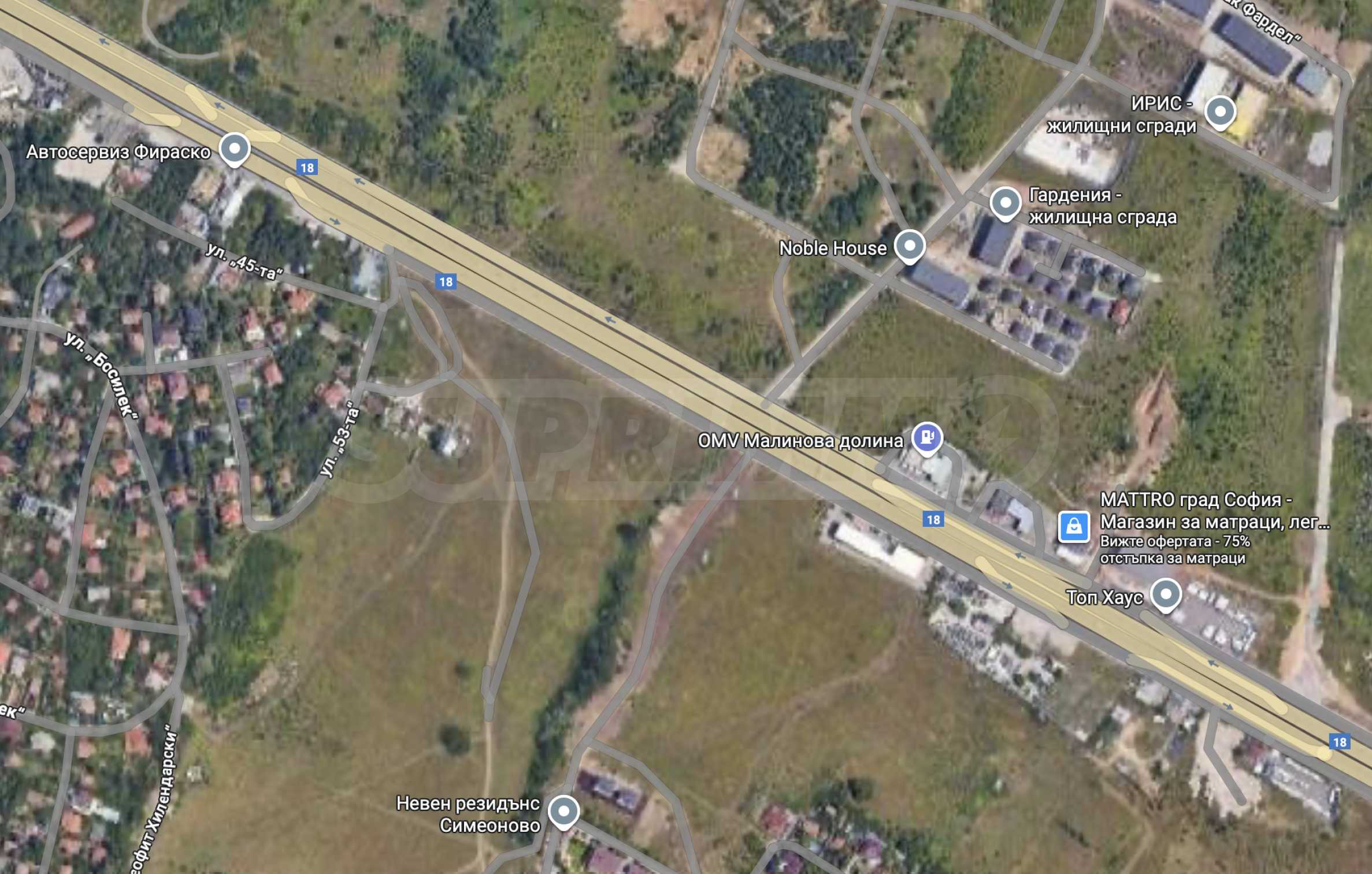 Das Grundstück ist hervorragend erreichbar, da sich alle Parzellen in bebauten Straßen befinden. Die wichtigsten Versorgungsleitungen sind in unmittelbarer Nähe: Wasser- und Stromanschluss in ca. 100 Metern Entfernung, Gas- und Glasfaseranschluss in ca. 200–250 Metern. Die Abwasserentsorgung ist in Planung; bis dahin ist eine temporäre lokale Lösung möglich. Das Gebiet zeichnet sich durch einen etablierten Wohncharakter und eine gut ausgebaute Infrastruktur aus und bietet eine gute Anbindung an Einkaufs- und Bildungszentren wie die Sofia Ring Mall, das Paradise Center und renommierte Privatschulen.