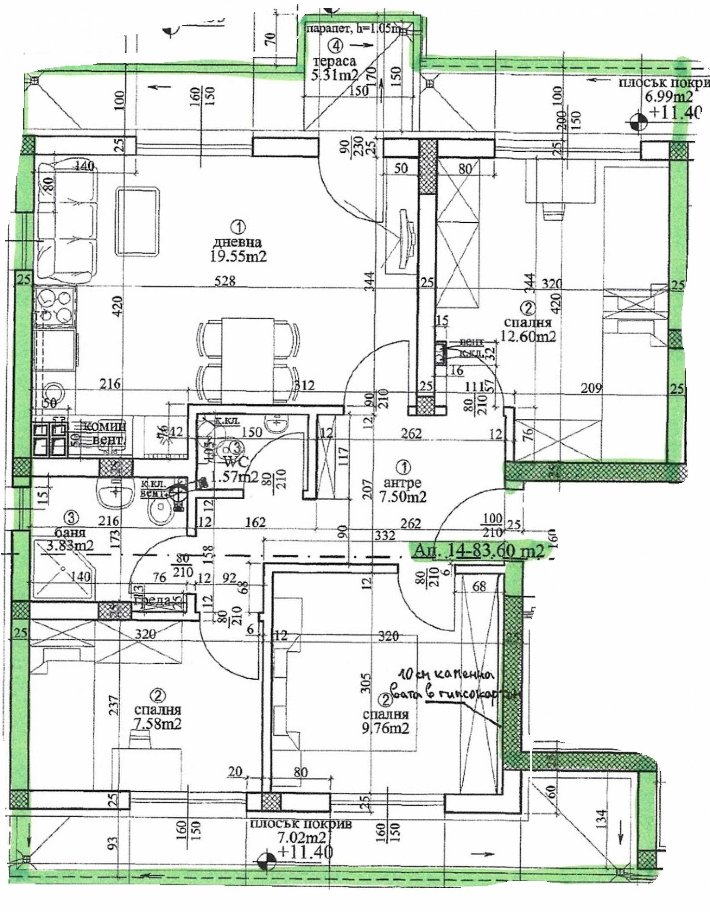 Die Wohnung wird gemäß den bulgarischen Baunormen im fertiggestellten Zustand mit Putz und Estrich übergeben.