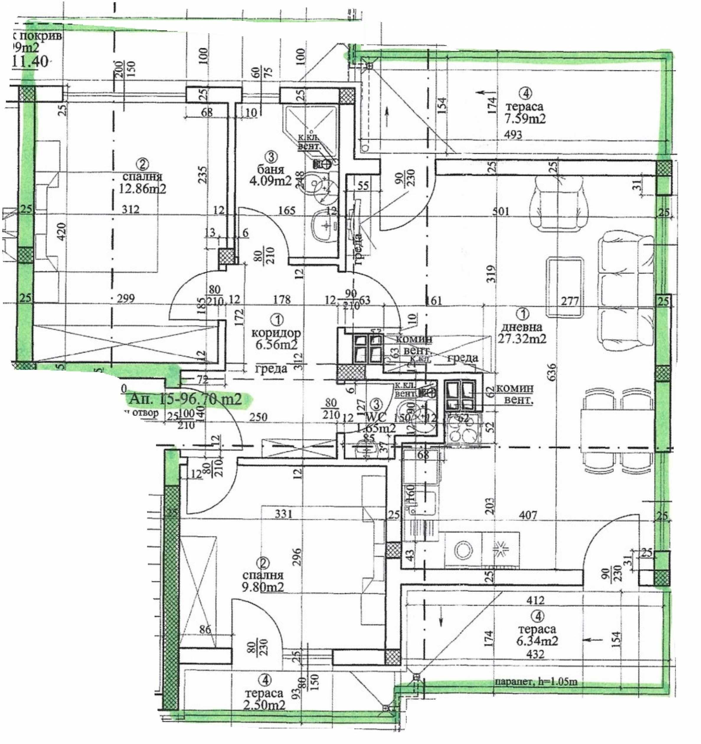 Die Wohnung wird gemäß den bulgarischen Baunormen im fertiggestellten Zustand mit Putz und Estrich übergeben.