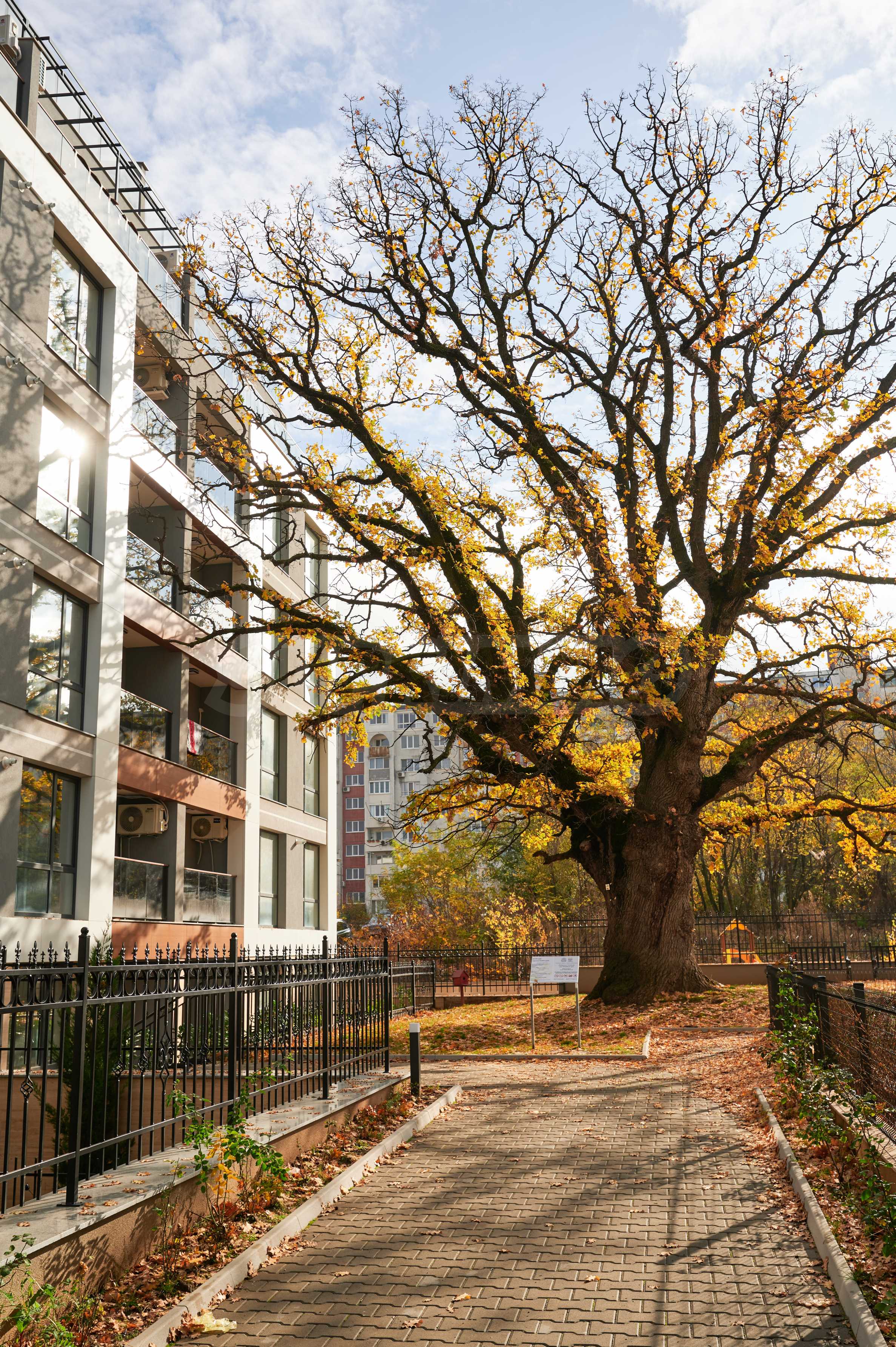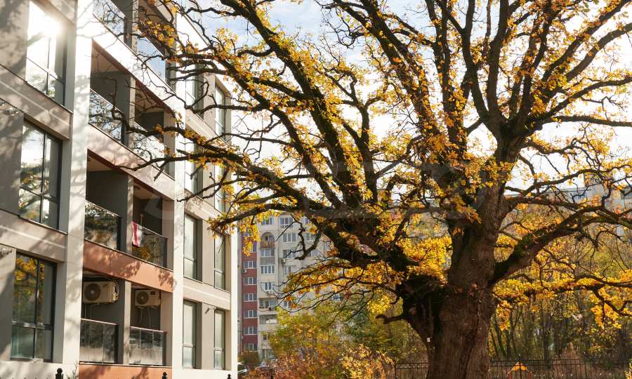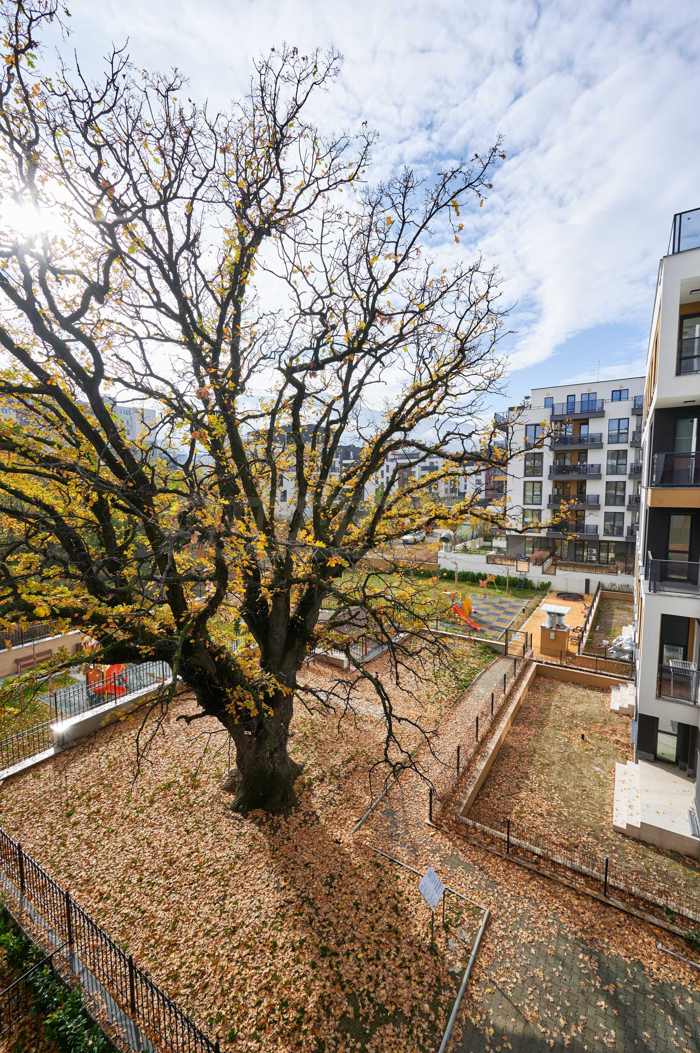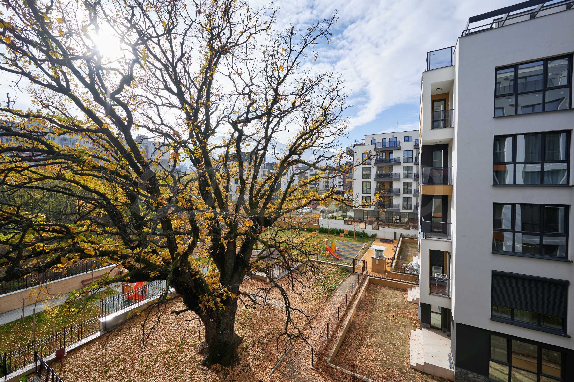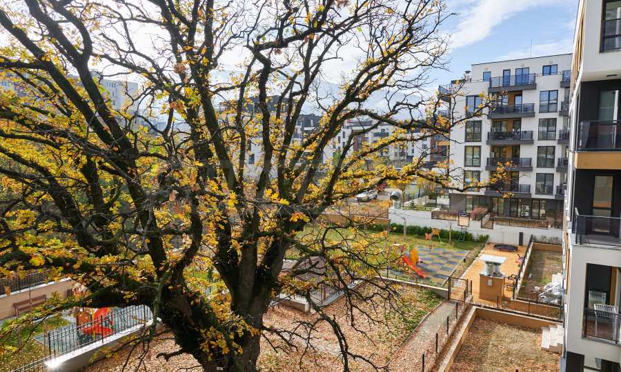 Die Wohnung ist nach Westen ausgerichtet und befindet sich im 3. Stock eines 7-stöckigen Gebäudes. Das Gebäude besticht durch ein stilvolles Erscheinungsbild und luxuriöse Gemeinschaftsbereiche, einen begrünten Innenhof mit Ecken zum Entspannen und Spielen, direkt neben der majestätischen, jahrhundertealten Eiche, die ein Wahrzeichen der Gegend ist.