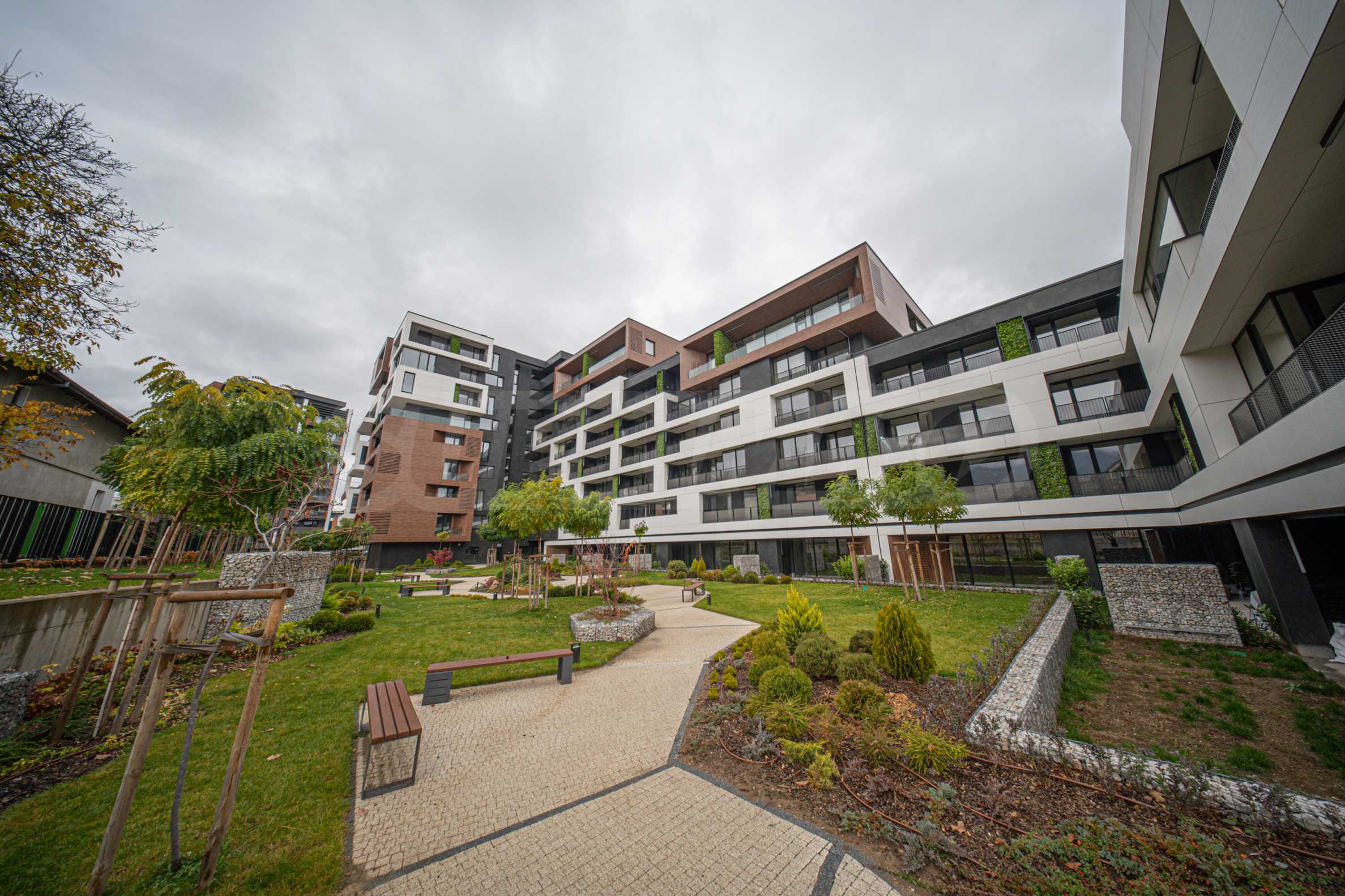 Gebäude mit moderner Architektur und gepflegten Gemeinschaftsbereichen;