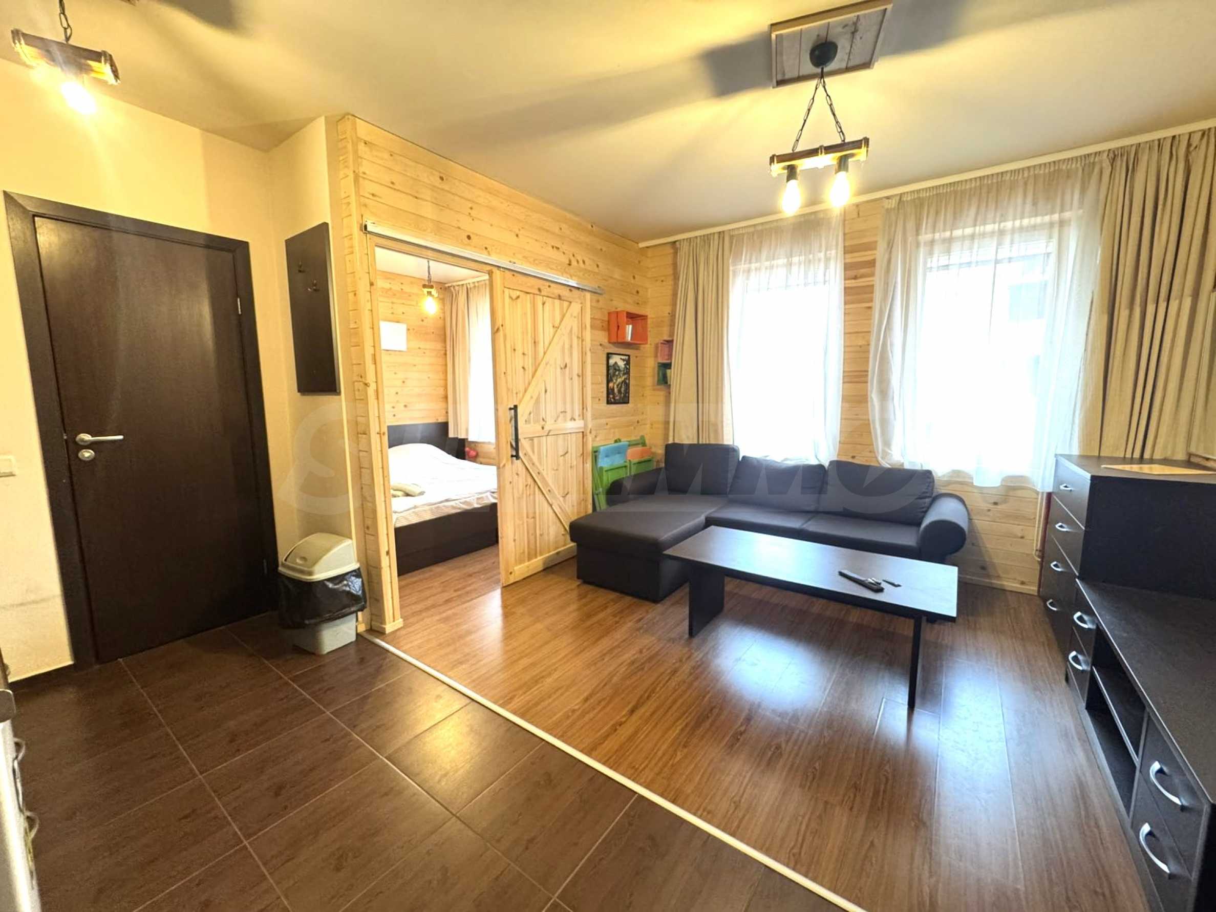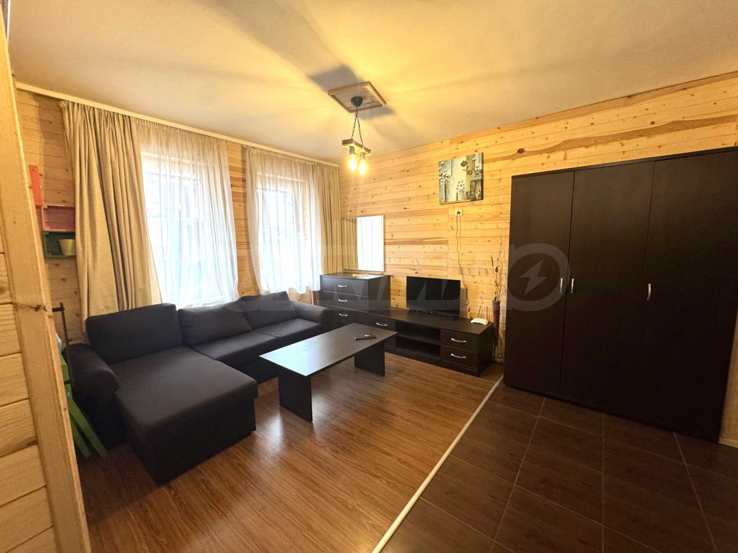 Der Innenraum ist mit hochwertigen Holzvertäfelungen versehen, wie sie typisch für Berghäuser in Bansko sind.