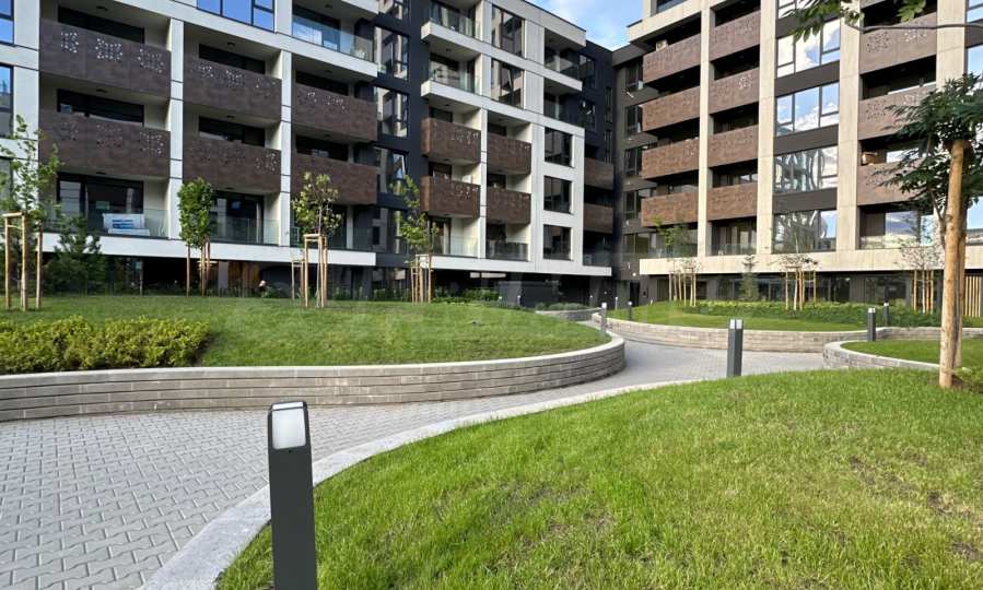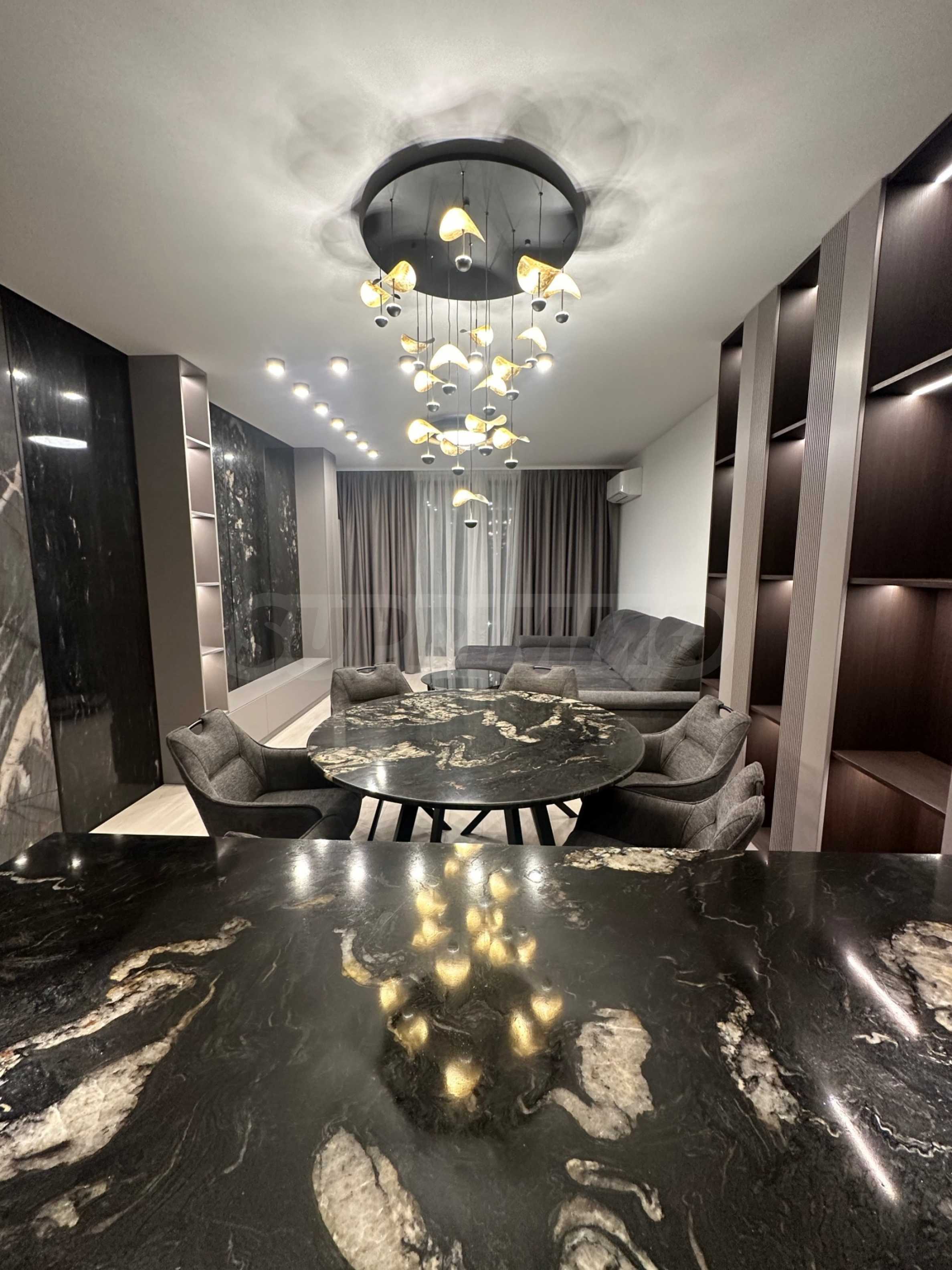 Die Wohnung ist Teil eines modernen Komplexes am Fuße des Vitosha-Gebirges und besticht durch eine beeindruckende Architektur mit klaren Linien und einer freitragenden Fassade aus großformatigen Laminam-Platten.