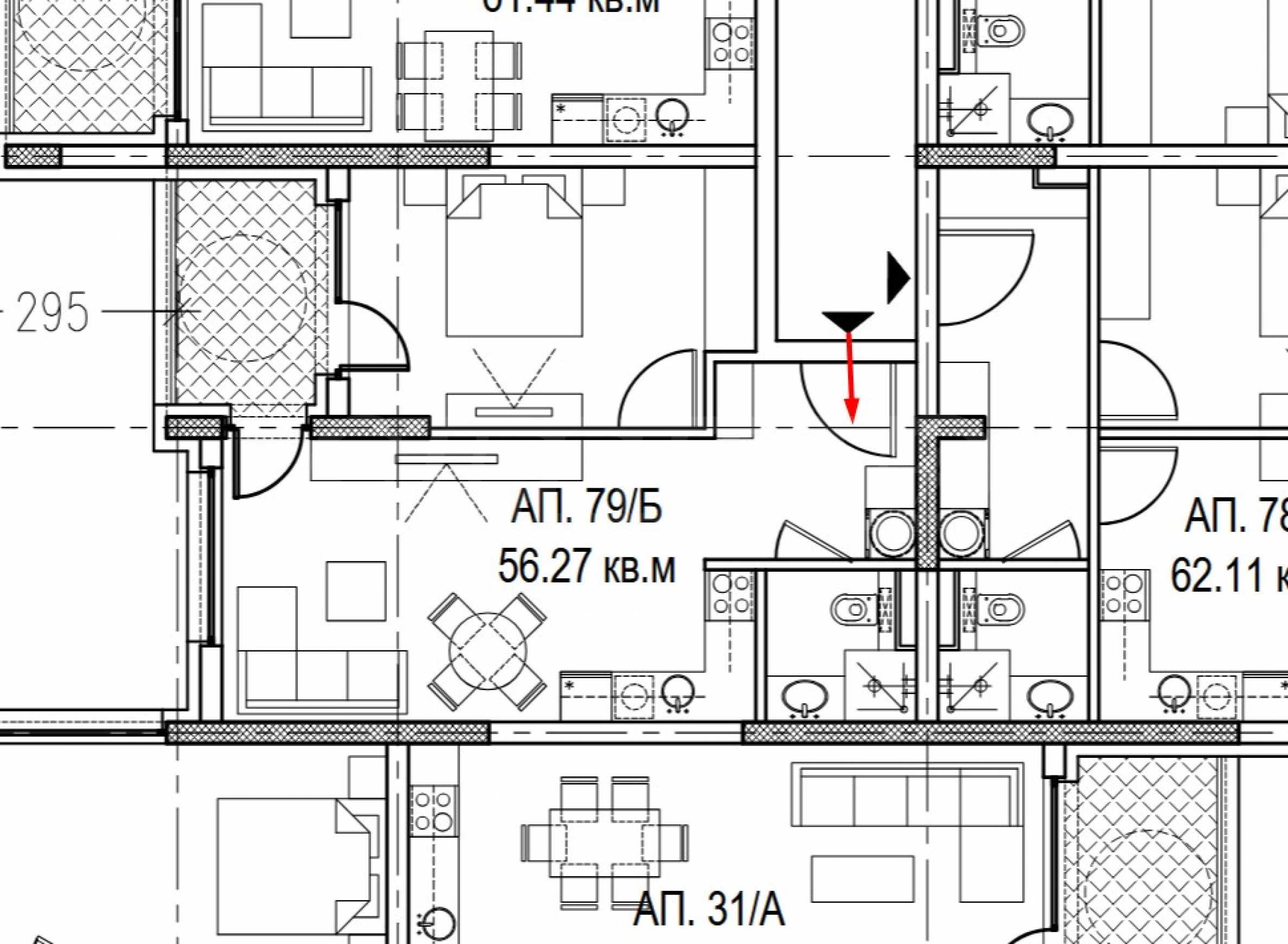 Die Wohnung befindet sich im 8. Obergeschoss und hat eine Gesamtfläche von 65,01 m², die Nettofläche beträgt 56,27 m². Sie verteilt sich auf Eingangsbereich, Badezimmer mit WC, Wohnzimmer mit Küche, Terrasse und ein Schlafzimmer. Die Wohnung wird nach bulgarischen Standards ausgebaut vermietet und verfügt über Fünfkammer-PVC-Fenster von Rehau, Dreifachverglasung und eine Sicherheitseingangstür.
