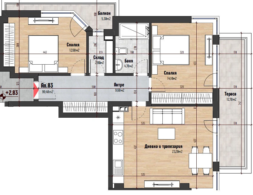 Das konkrete Angebot betrifft eine Dreizimmerwohnung im 2. Obergeschoss mit einer Gesamtfläche von 116,08 m², aufgeteilt in eine Eingangshalle, ein geräumiges Wohnzimmer mit Kochnische, zwei Schlafzimmer, ein Badezimmer mit WC und eine Terrasse.