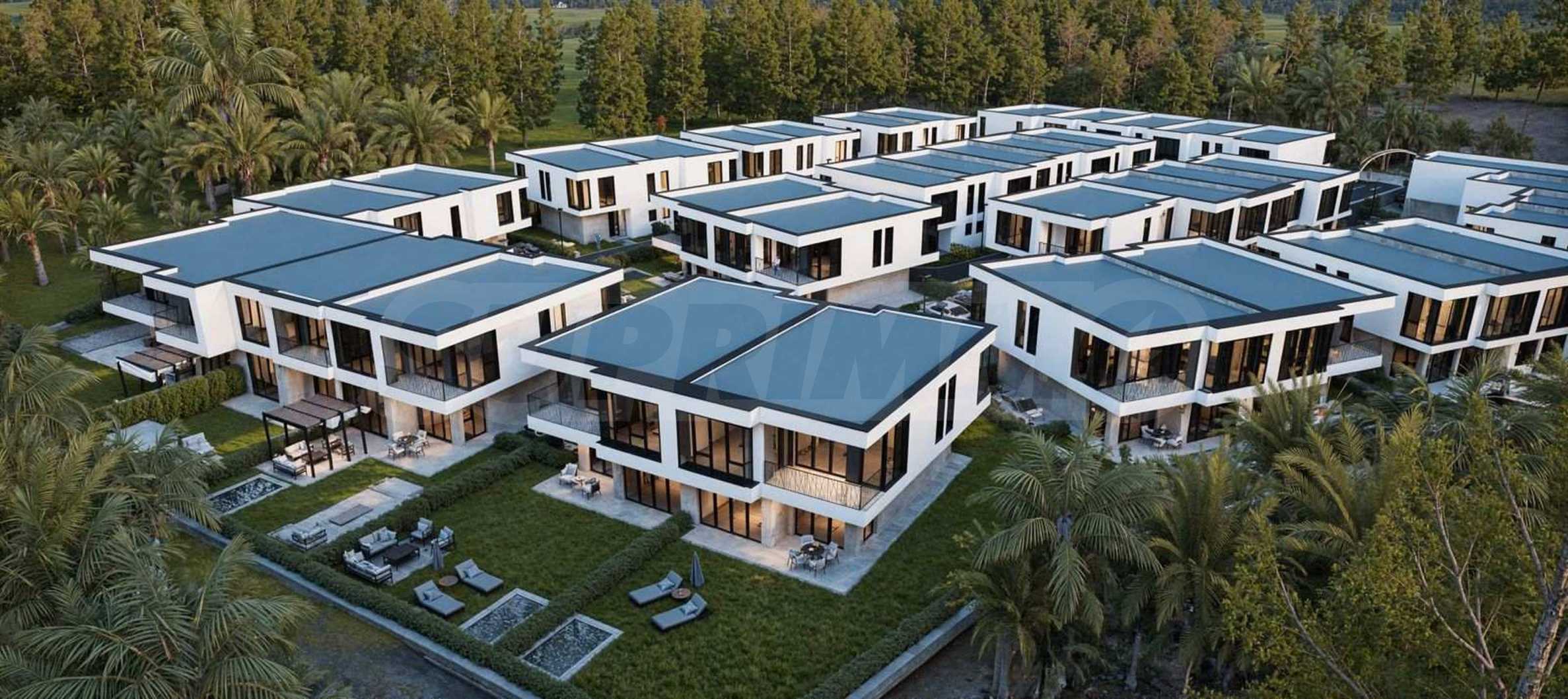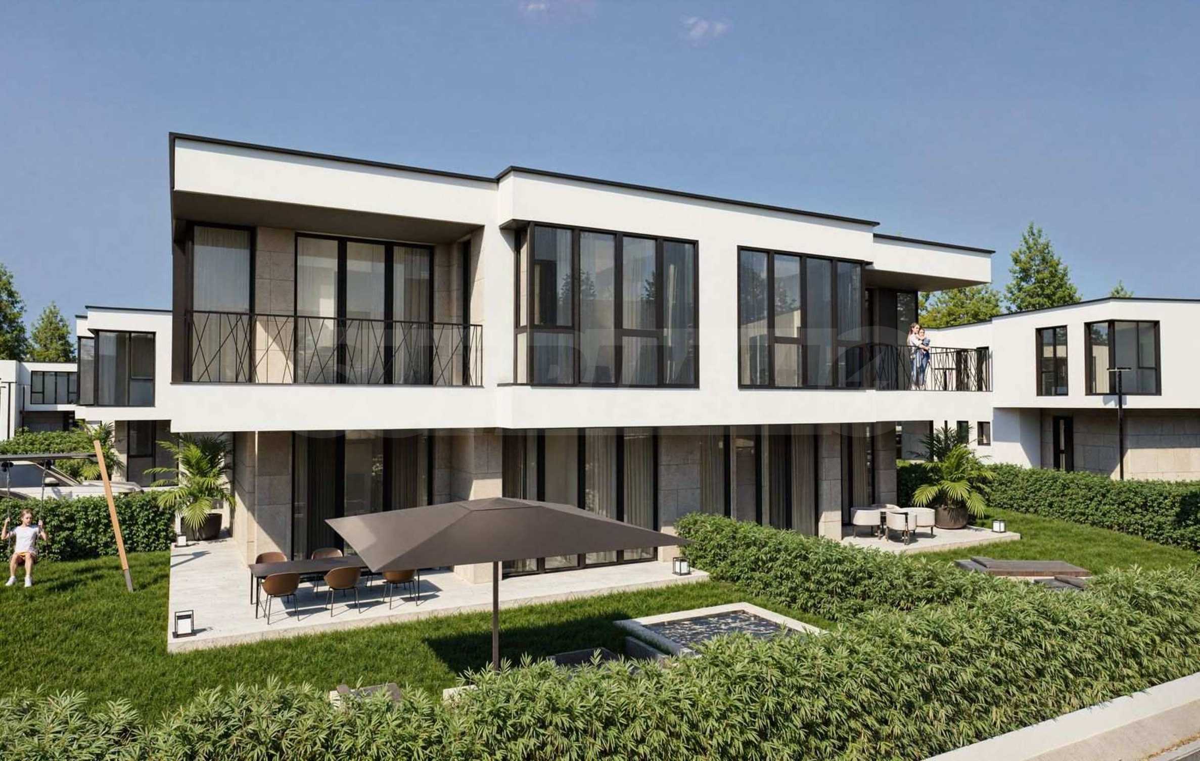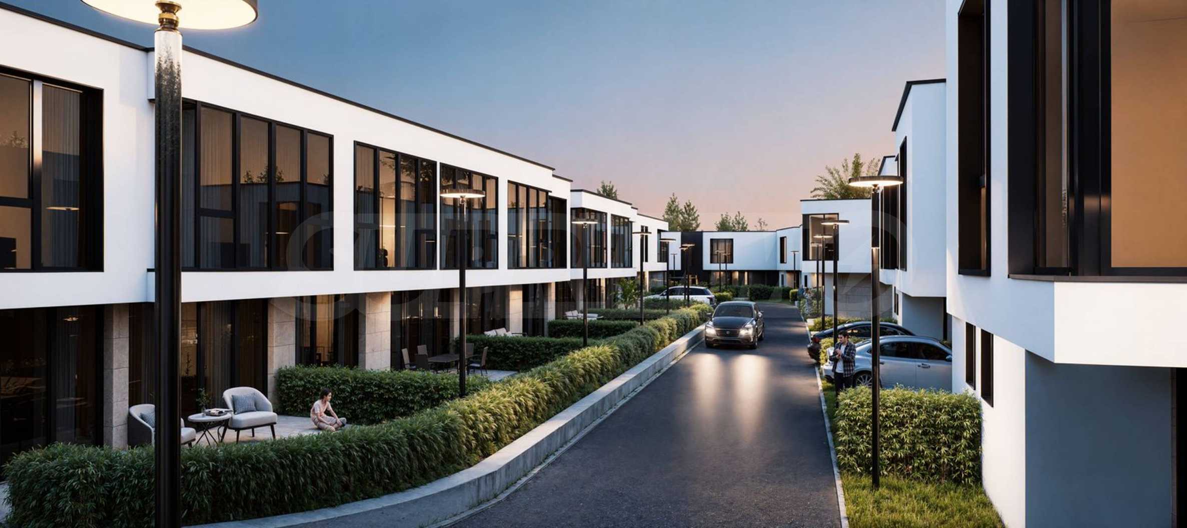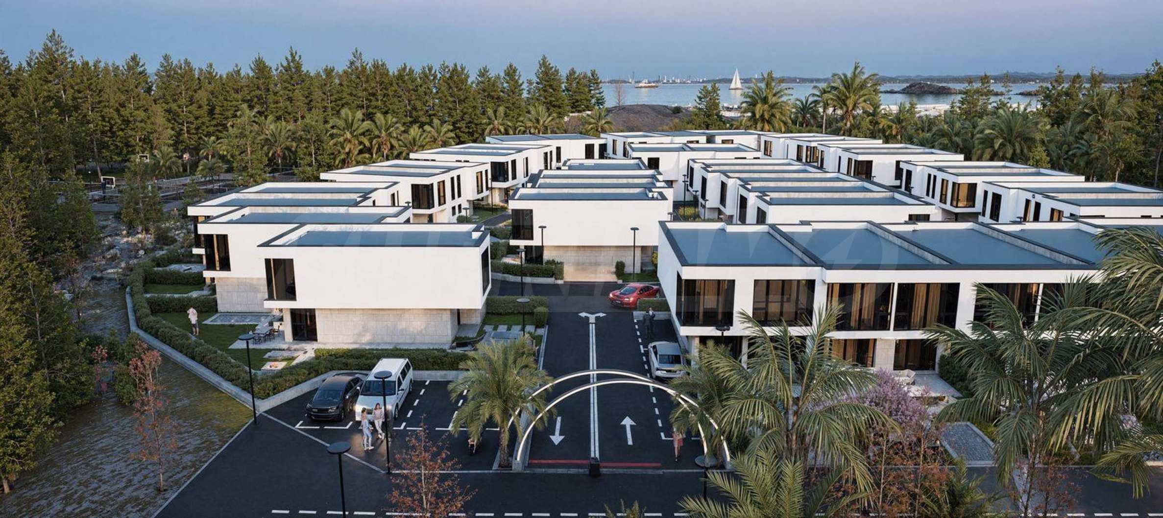 Der Komplex besteht aus 39 zweistöckigen Häusern mit einer Gesamtfläche von 165 m² bis 204 m² und einem privaten Garten von 175 m² bis 211 m². Die Infrastruktur auf dem Gelände ist vollständig ausgebaut: asphaltierte Straßen, Gehwege und Straßenbeleuchtung, Videoüberwachung der Gemeinschaftsbereiche sowie ein Internetmodul zur Fernzugriffskontrolle mit individuellem Zugangscode für jeden Eigentümer.