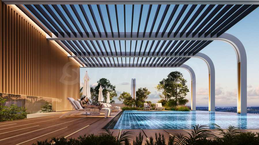 Wir bieten eine funktionale und gut geschnittene Dreizimmerwohnung im sechsten Obergeschoss mit einer Gesamtfläche von 213 m², inklusive einer großzügigen Terrasse von 122 m². Die Wohnung verfügt über einen hellen Wohnbereich mit Küche und Essbereich, zwei separate Schlafzimmer mit jeweils eigenem Bad, ein separates Gäste-WC und eine große Terrasse. Die Räume vereinen modernen Komfort, Eleganz und Funktionalität. Hohe Decken und bodentiefe Fenster sorgen für viel Tageslicht und ein luftiges, großzügiges Raumgefühl.