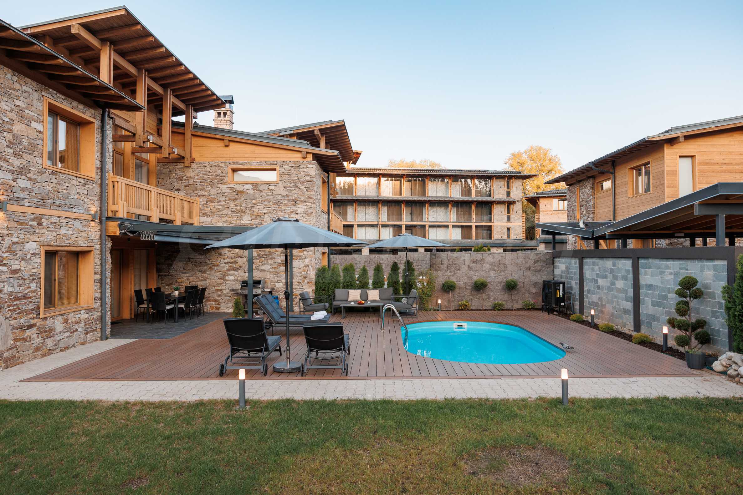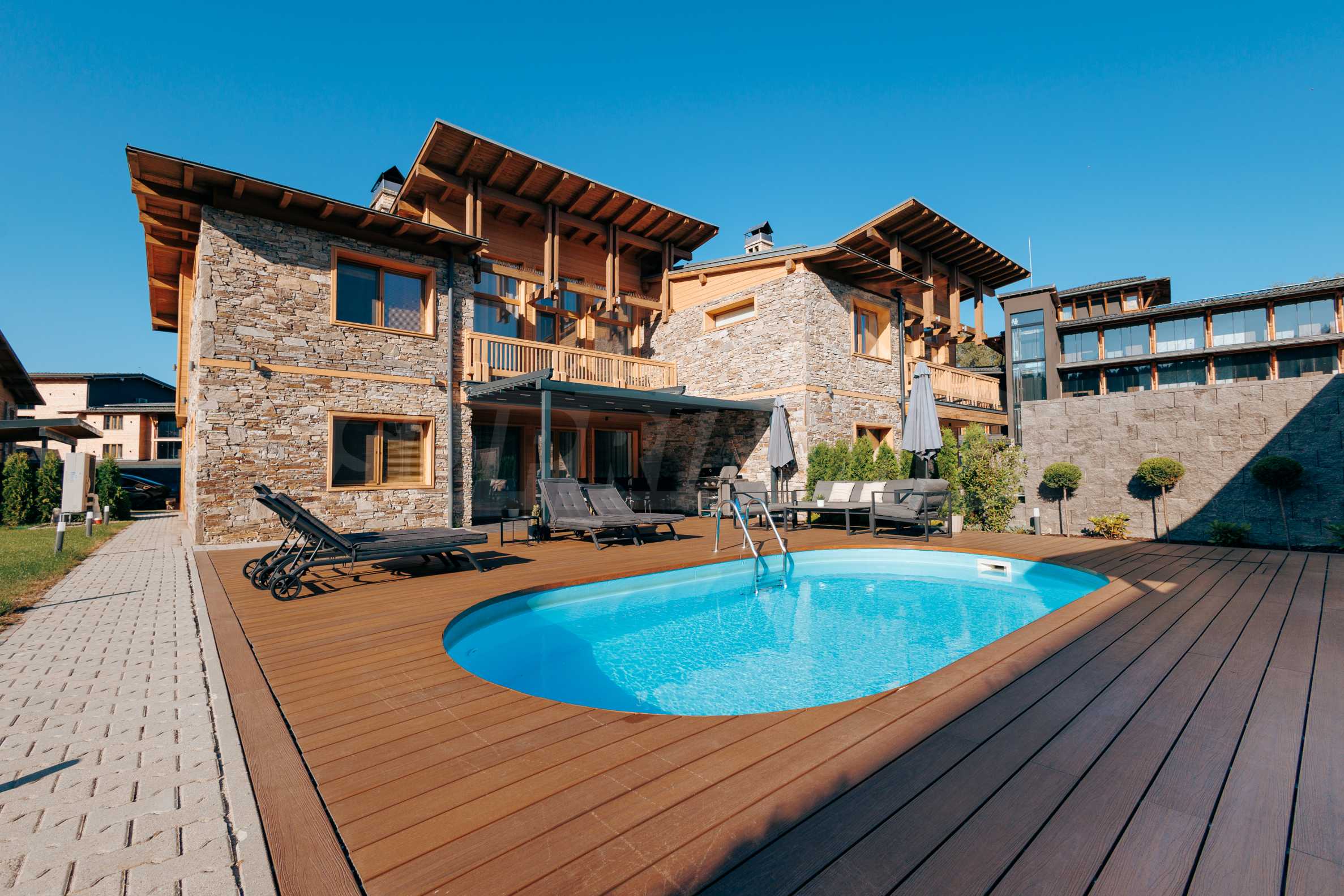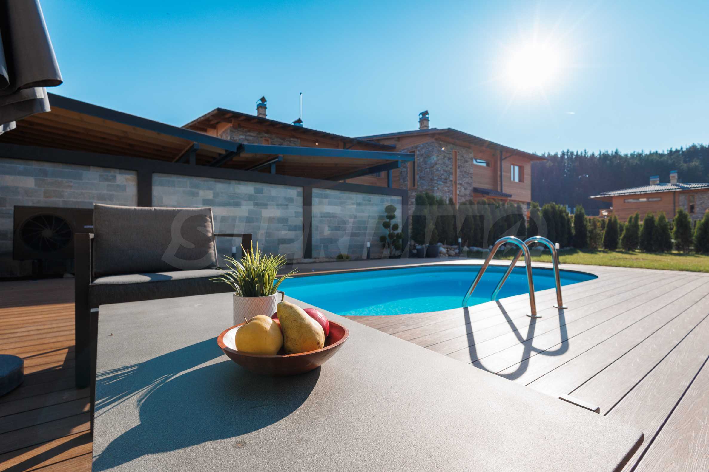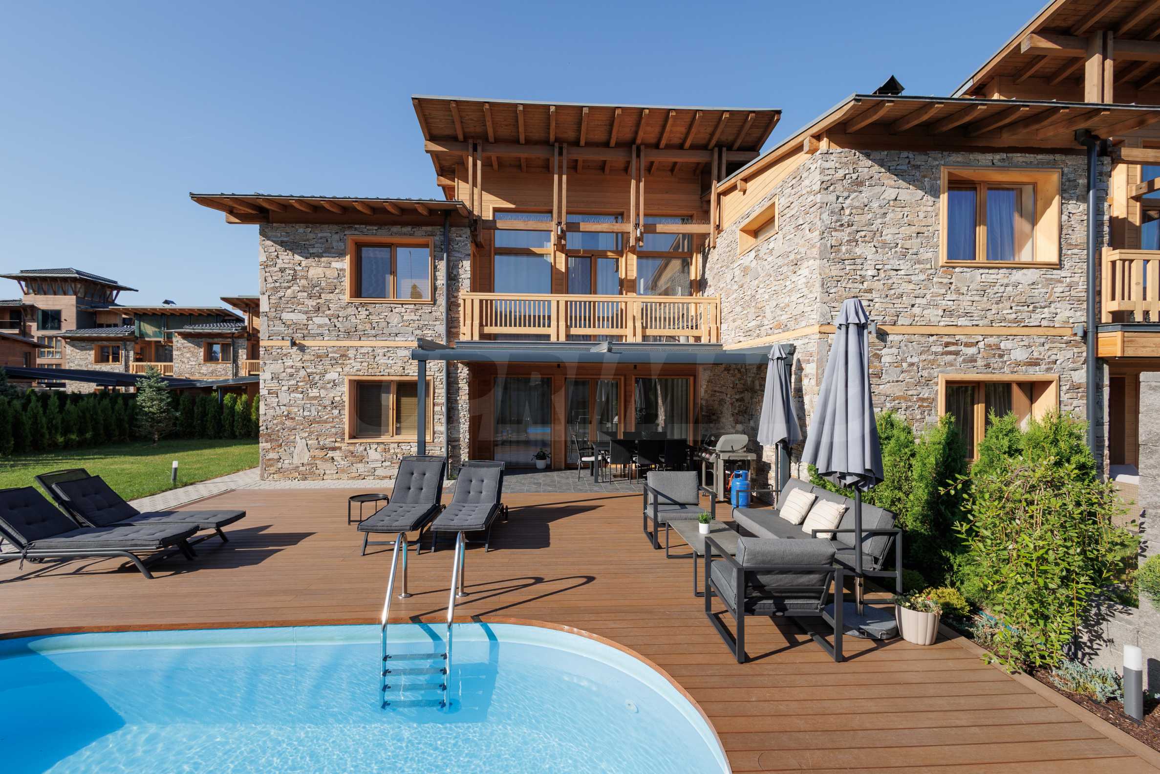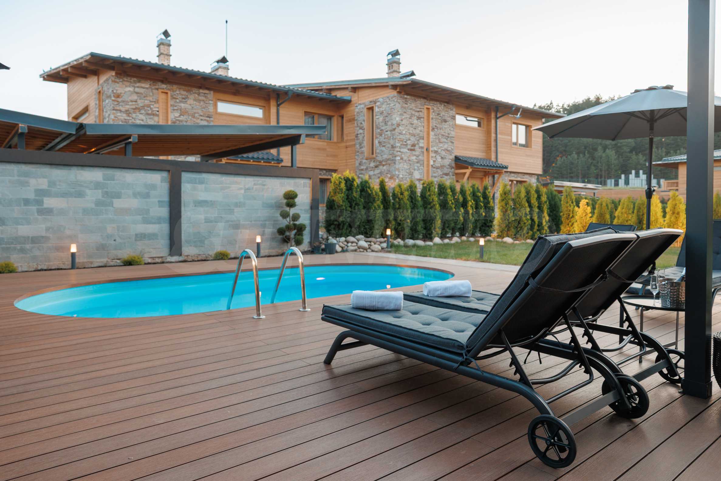 Wir präsentieren Ihnen exklusiv zum Verkauf eine äußerst attraktive Immobilie im Dorf Banya – ein freistehendes, möbliertes Haus mit eigenem Landschaftsgarten und Mineralwasserpool, Teil einer gepflegten und beliebten Ferienanlage mit Toranlage, nur wenige Autominuten vom Skigebiet Bansko entfernt.