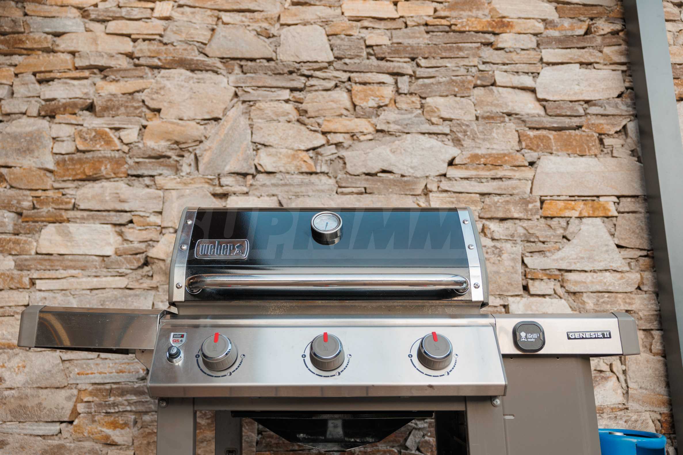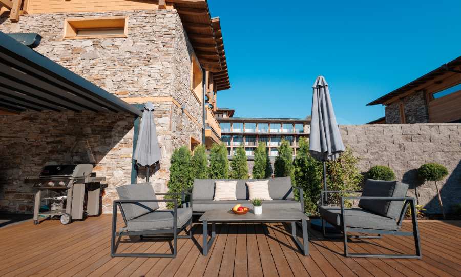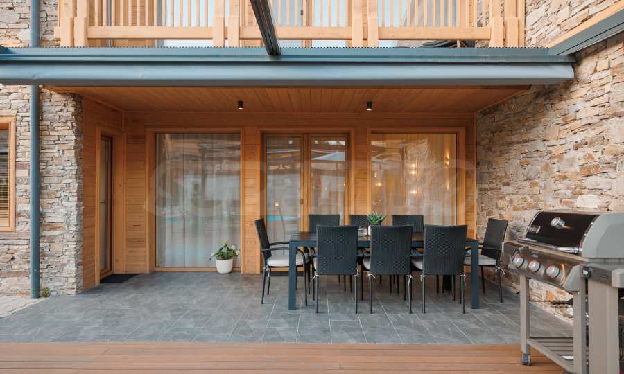 Das Haus verfügt über einen 456 m² großen, gärtnerisch gestalteten Garten mit einem Mineralwasserpool. Vor dem Haus befinden sich ein separater Grillplatz mit Terrasse und überdachte Parkplätze für zwei Autos.