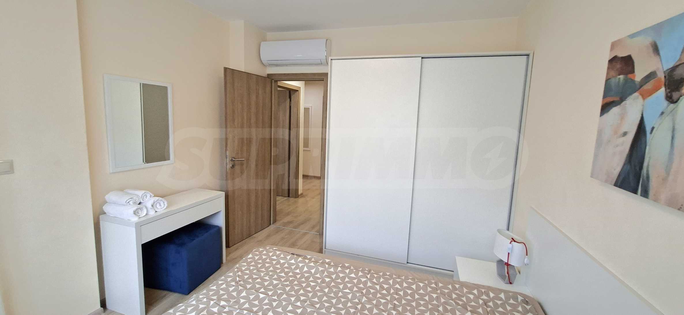 Wir präsentieren Ihnen eine Zweizimmerwohnung zur Miete in der prestigeträchtigen, geschlossenen Wohnanlage, die sich in erster Reihe zum Meer, nur wenige Schritte vom Strand entfernt und innerhalb der Stadt Varna befindet – eine einzigartige Anlage mit solch einer Lage!