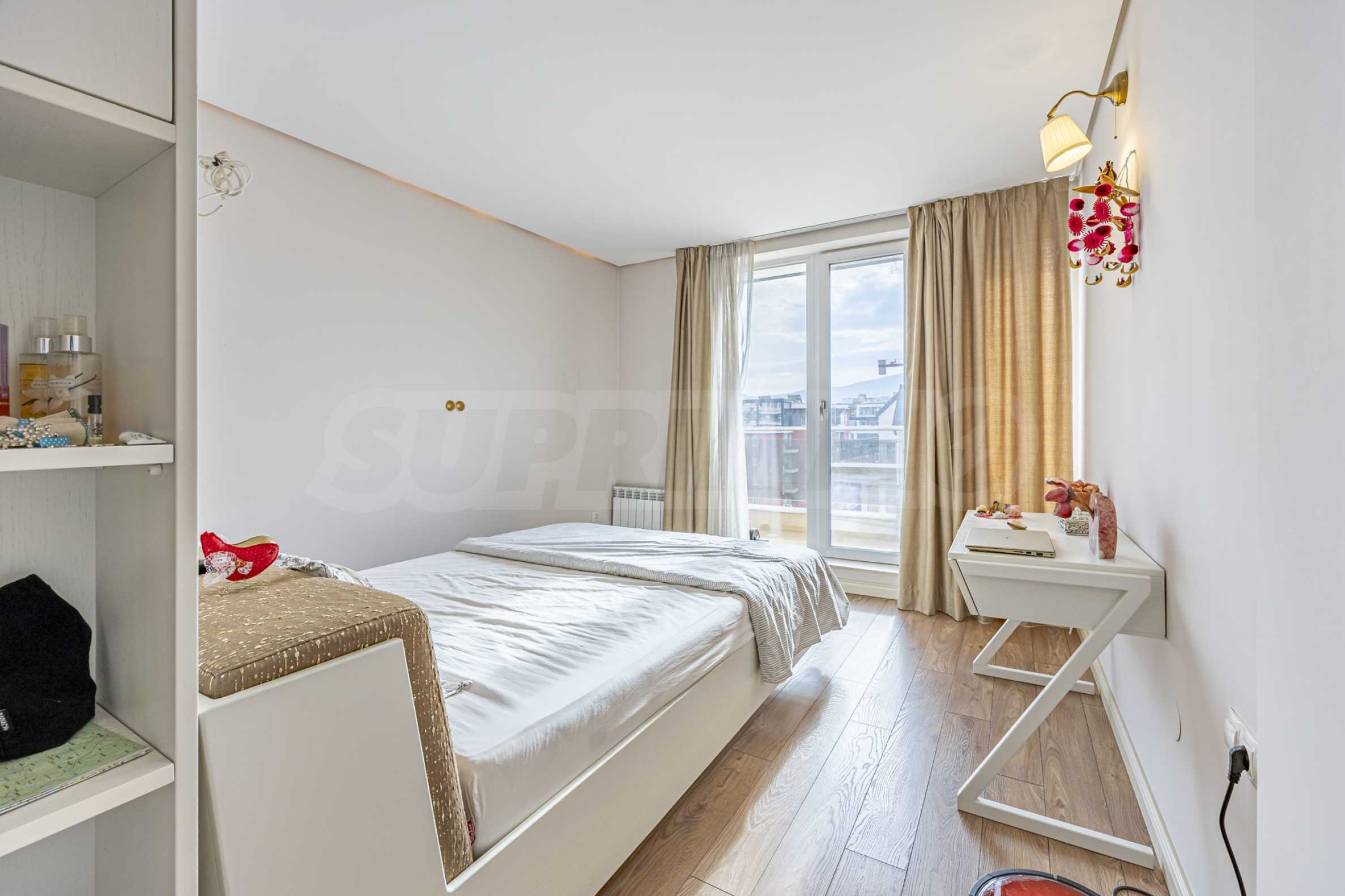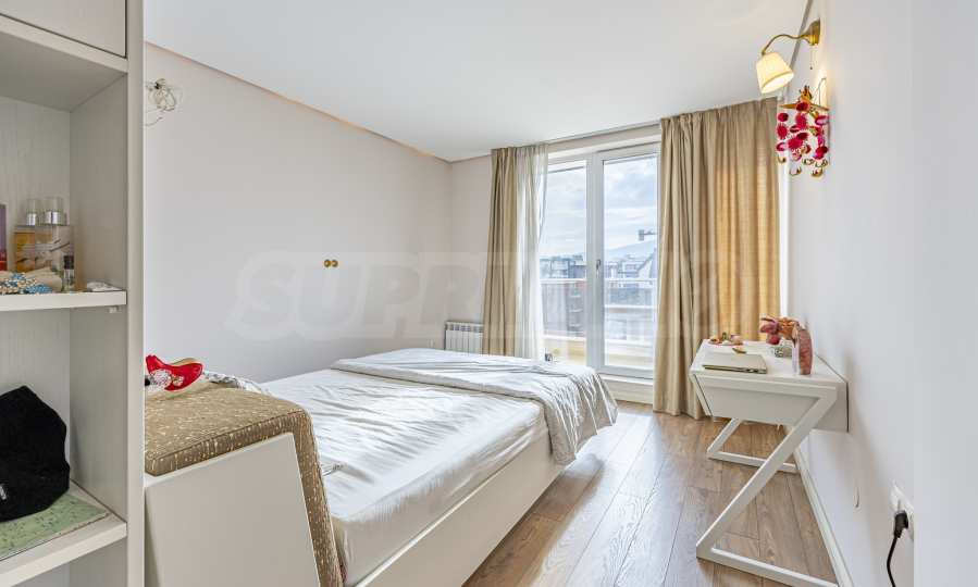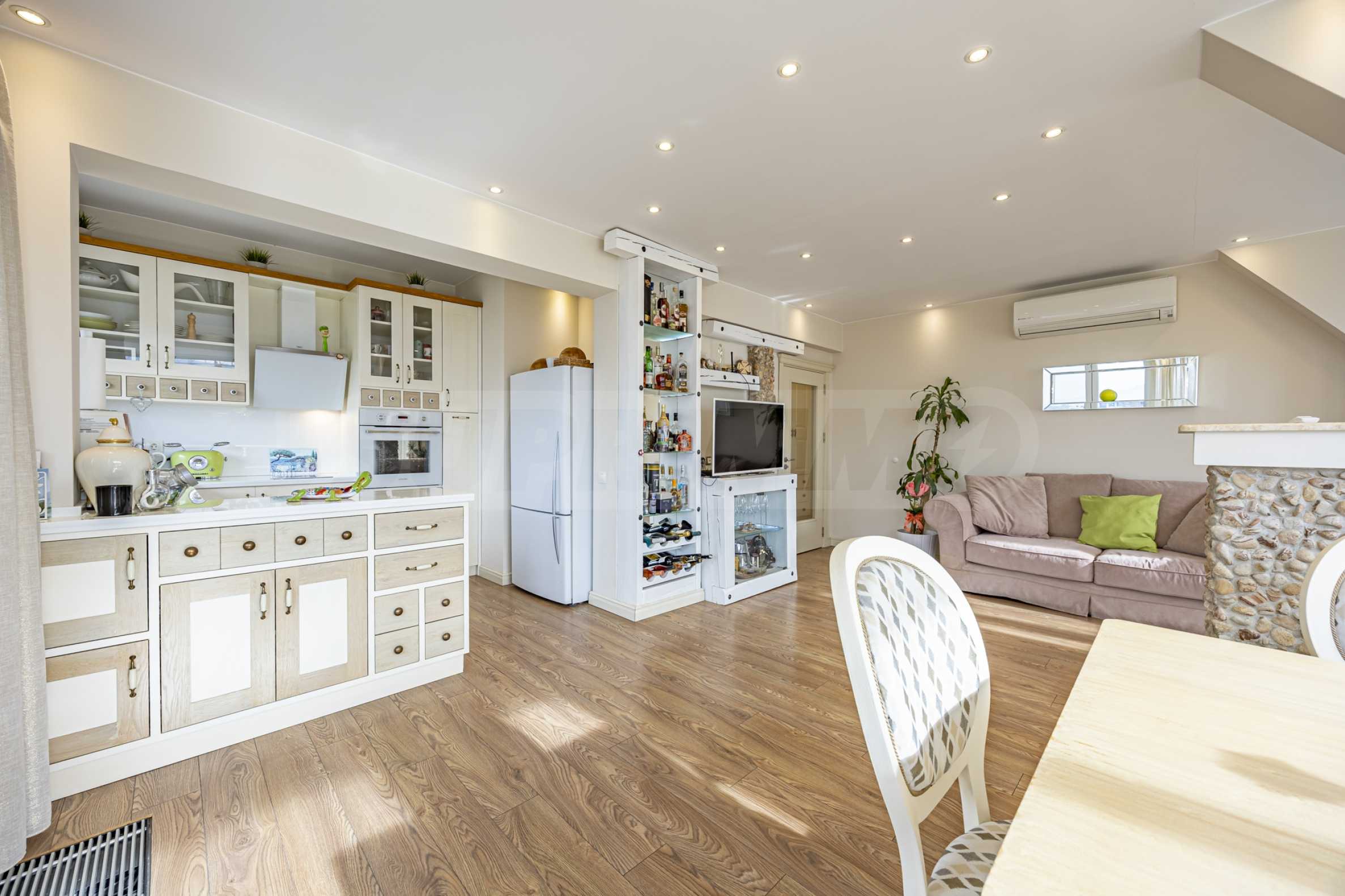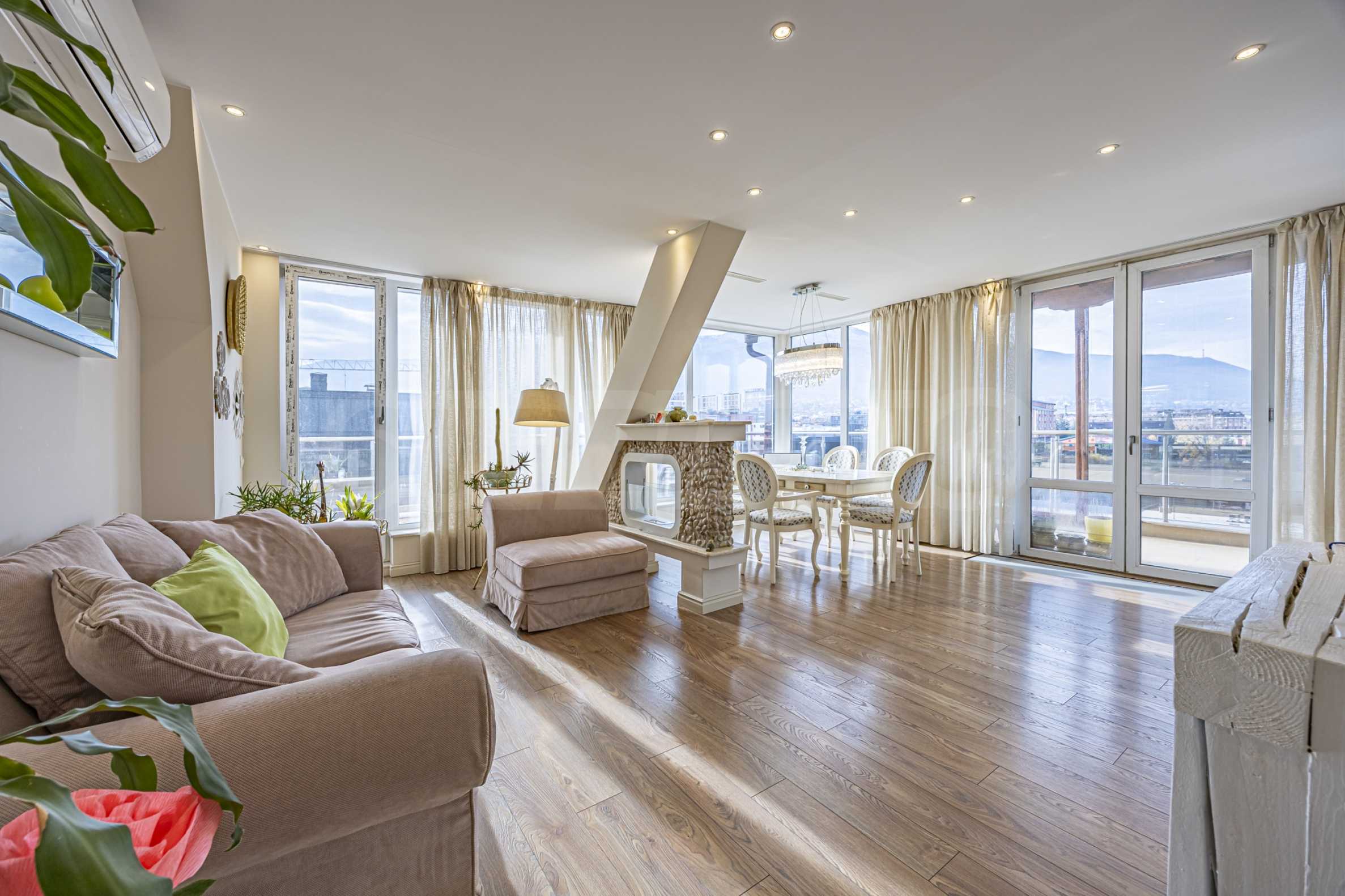 Der großzügige Wohnbereich mit Süd- und Westausrichtung ist den ganzen Tag über lichtdurchflutet. Er bietet eine große Küchenzeile, einen Essbereich, einen Bioethanol-Kamin sowie elegante und gemütliche Möbel in hellen Farbtönen. Die große Panoramaterrasse umgibt die gesamte Wohnung und bietet einen unverbauten Blick auf das Witoscha-Gebirge und die Stadt.