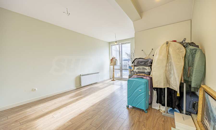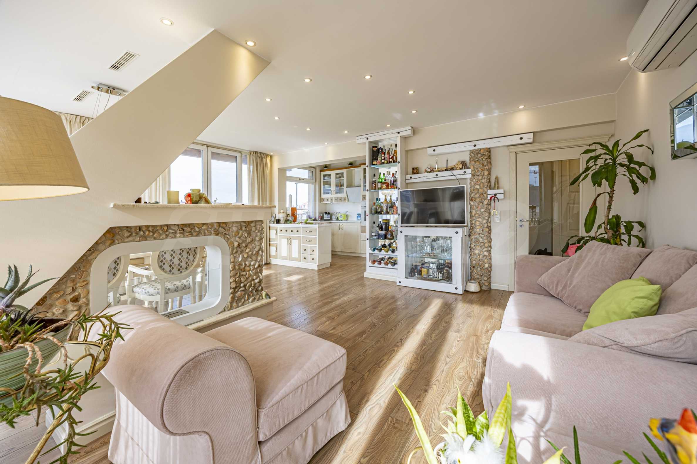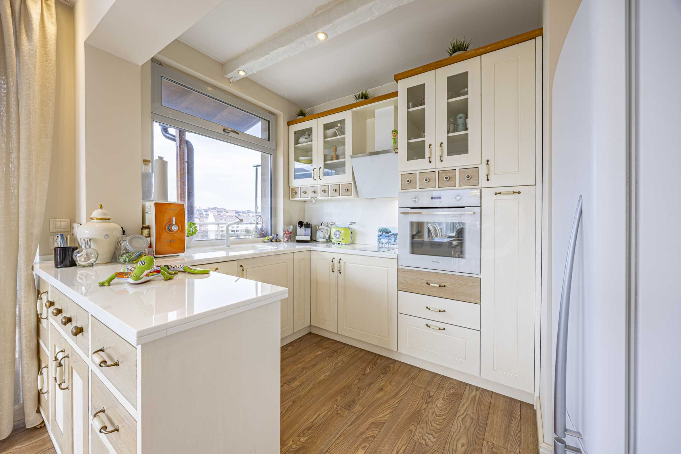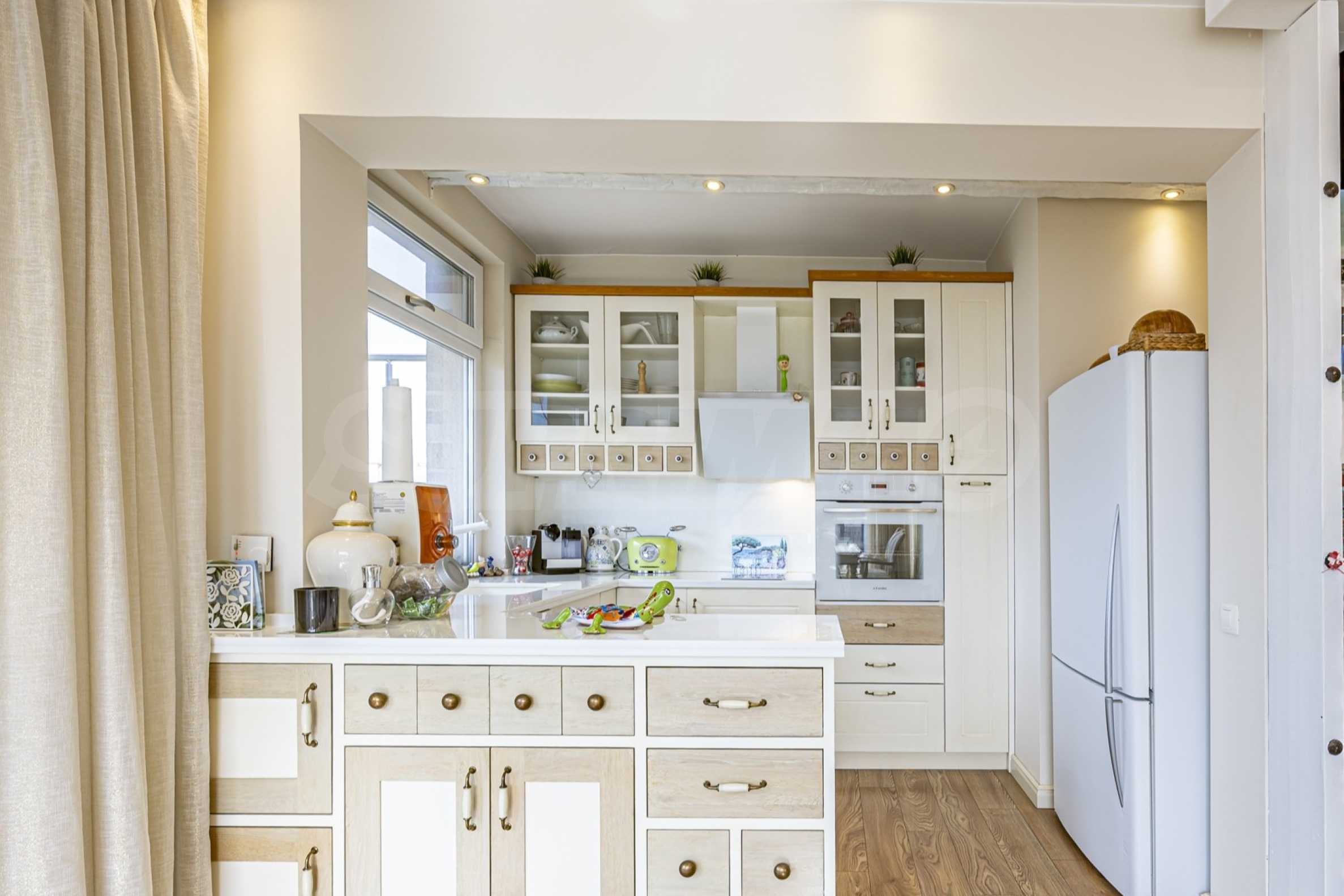 Der großzügige Wohnbereich mit Süd- und Westausrichtung ist den ganzen Tag über lichtdurchflutet. Er bietet eine große Küchenzeile, einen Essbereich, einen Bioethanol-Kamin sowie elegante und gemütliche Möbel in hellen Farbtönen. Die große Panoramaterrasse umgibt die gesamte Wohnung und bietet einen unverbauten Blick auf das Witoscha-Gebirge und die Stadt.