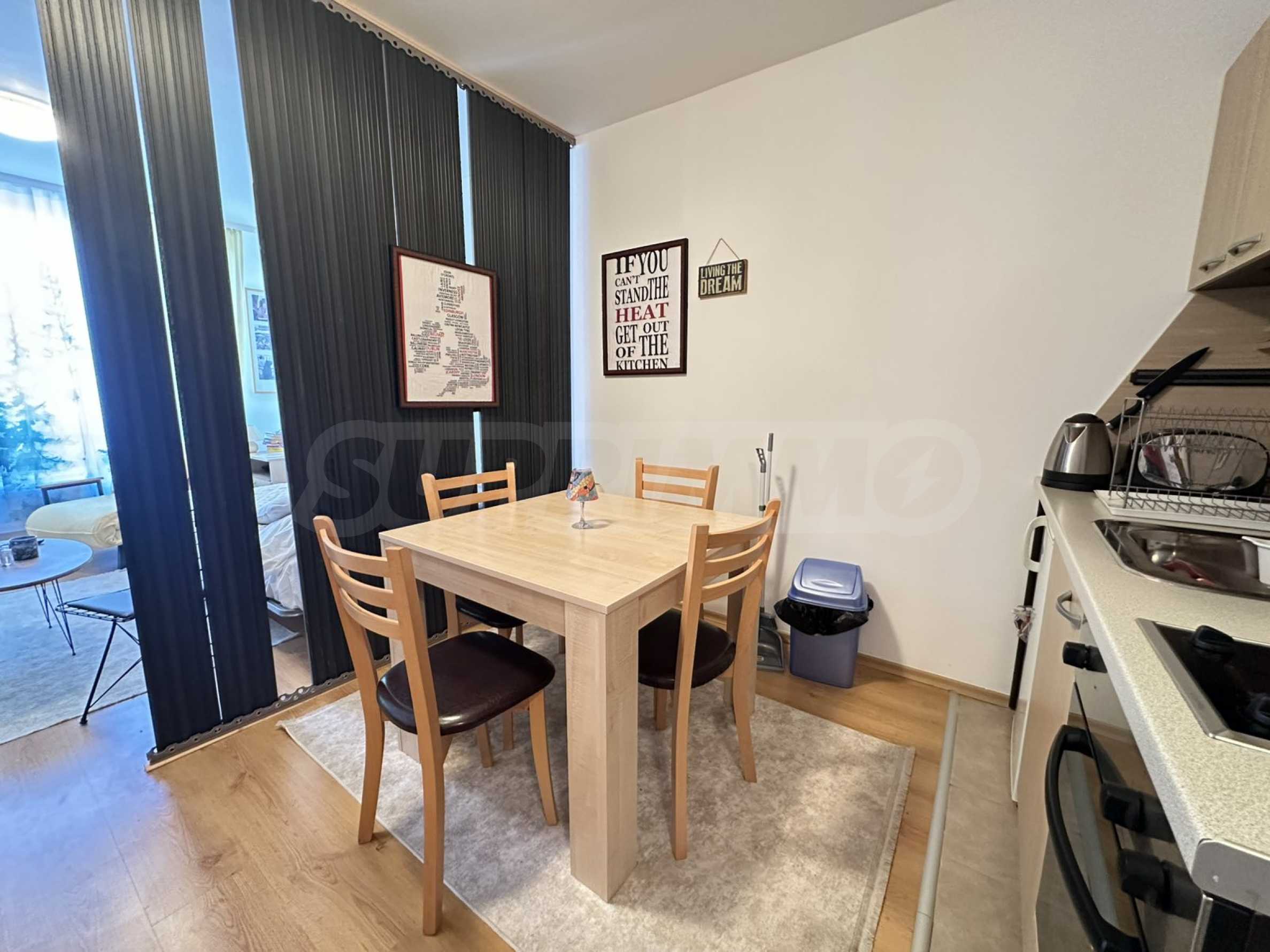 •Der Wohn- und Küchenbereich sind durch eine dekorative Wand optisch voneinander getrennt, was dem Raum Stil verleiht und eine klare Abgrenzung zwischen den Bereichen schafft.