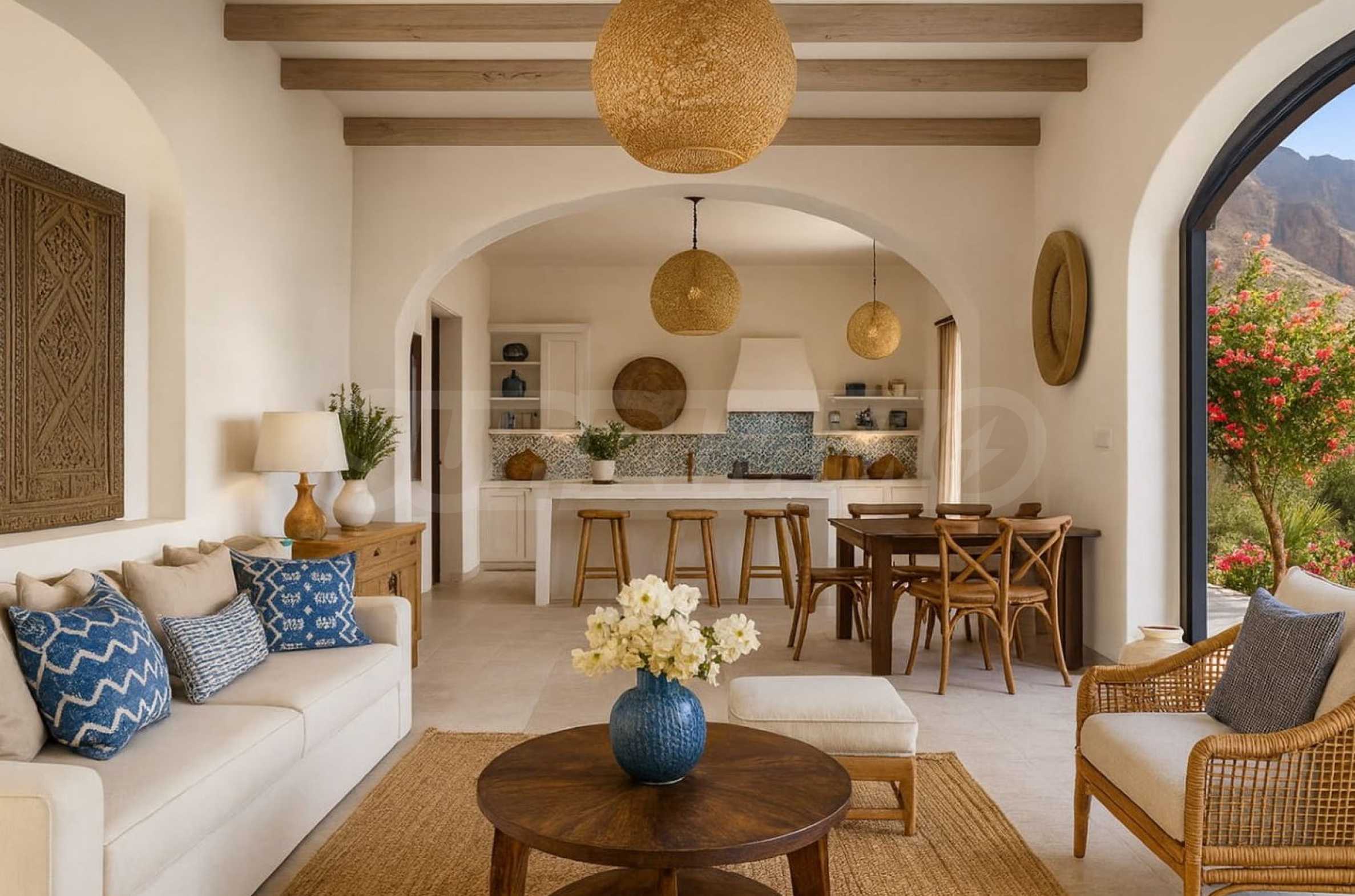 Große Fenster durchfluten die Innenräume mit natürlichem Licht und eröffnen malerische Ausblicke auf die angelegten Gärten oder die charakteristische Felslandschaft, die den Komplex umgibt. Dadurch entsteht ein Gefühl von Weite und Harmonie mit der Natur.