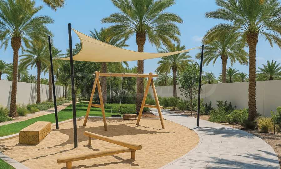 Die Gemeinschaftsgärten der Anlage verfügen über einen Spielplatz und ein speziell dafür vorgesehenes Wasserbecken mit Attraktionen, in dem die jüngsten Bewohner in einer sicheren und geschützten Umgebung Spaß haben und sich abkühlen können, während die Eltern die Ruhe und den Komfort der Gemeinschaftsräume genießen.