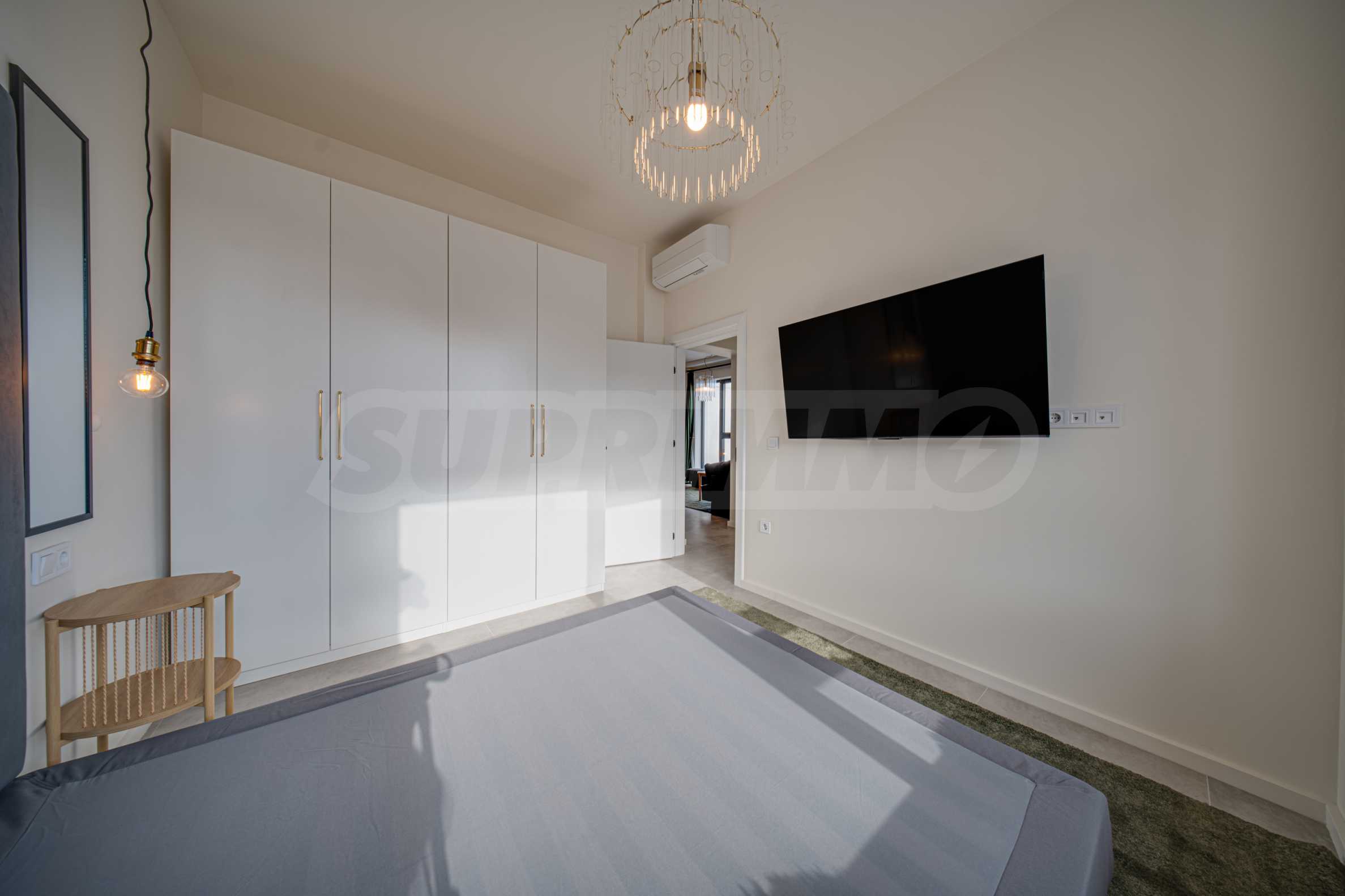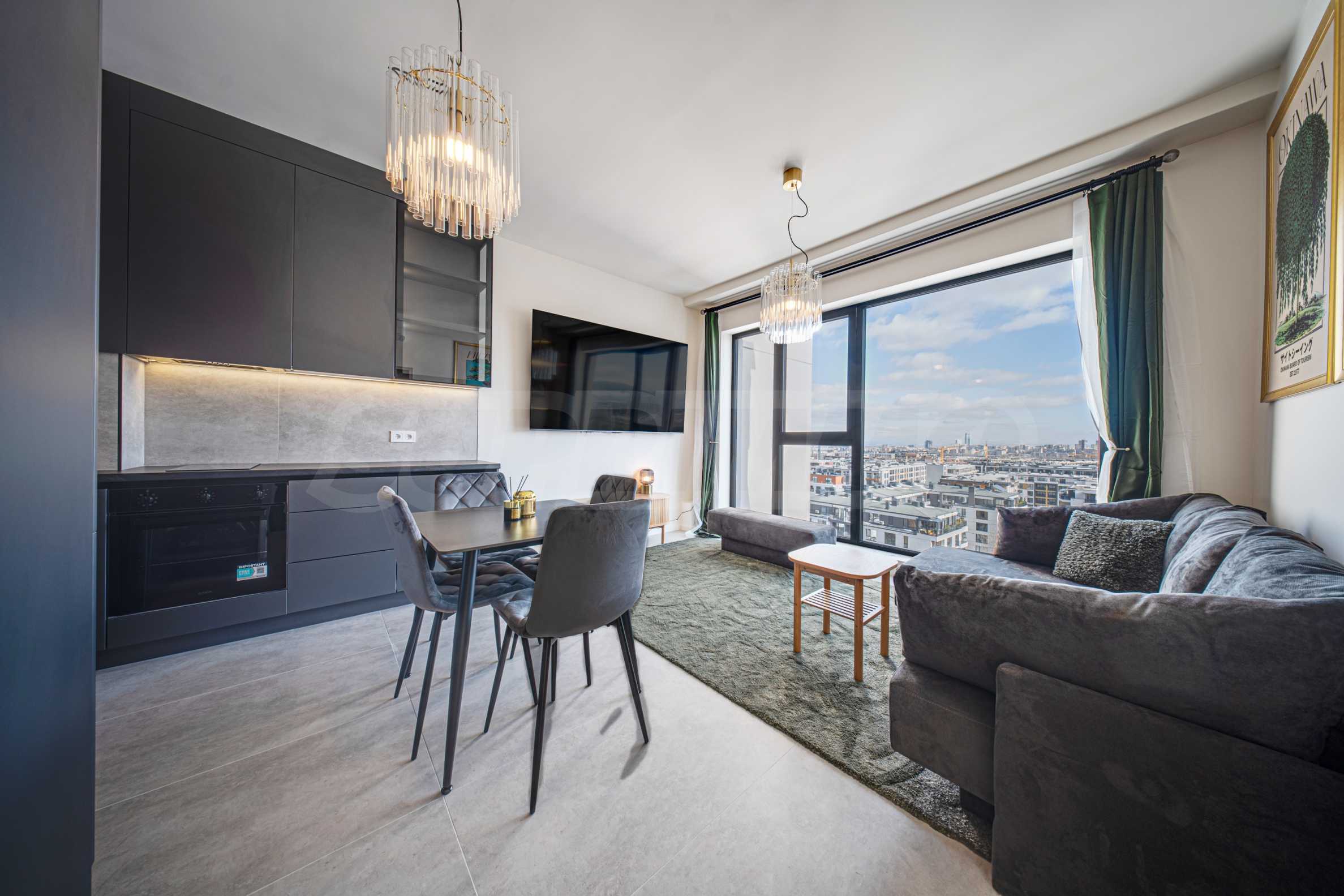 Die Wohnung befindet sich im 8. Stock und wird komplett möbliert und mit hochwertigen schwarzen und weißen Haushaltsgeräten ausgestattet angeboten: