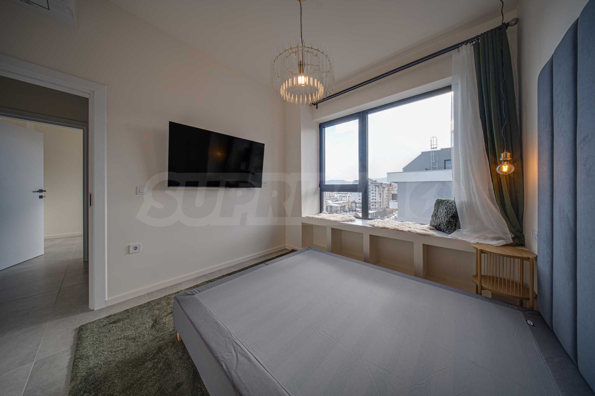 Mit einem modernen und künstlerischen Design besticht das Apartment durch Gemütlichkeit und Komfort, ausgewählte stilvolle Möbel, lichtdurchflutete Räume und ein herrliches Stadtpanorama.