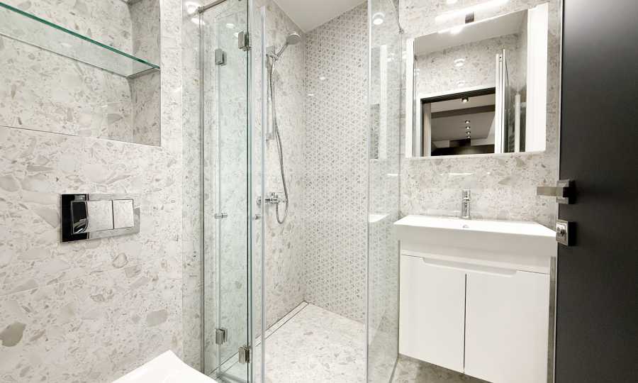 • Das Badezimmer ist mit hochwertigen und stilvollen Sanitäreinrichtungen ausgestattet, darunter Toilette, Waschbecken und Duschkabine.