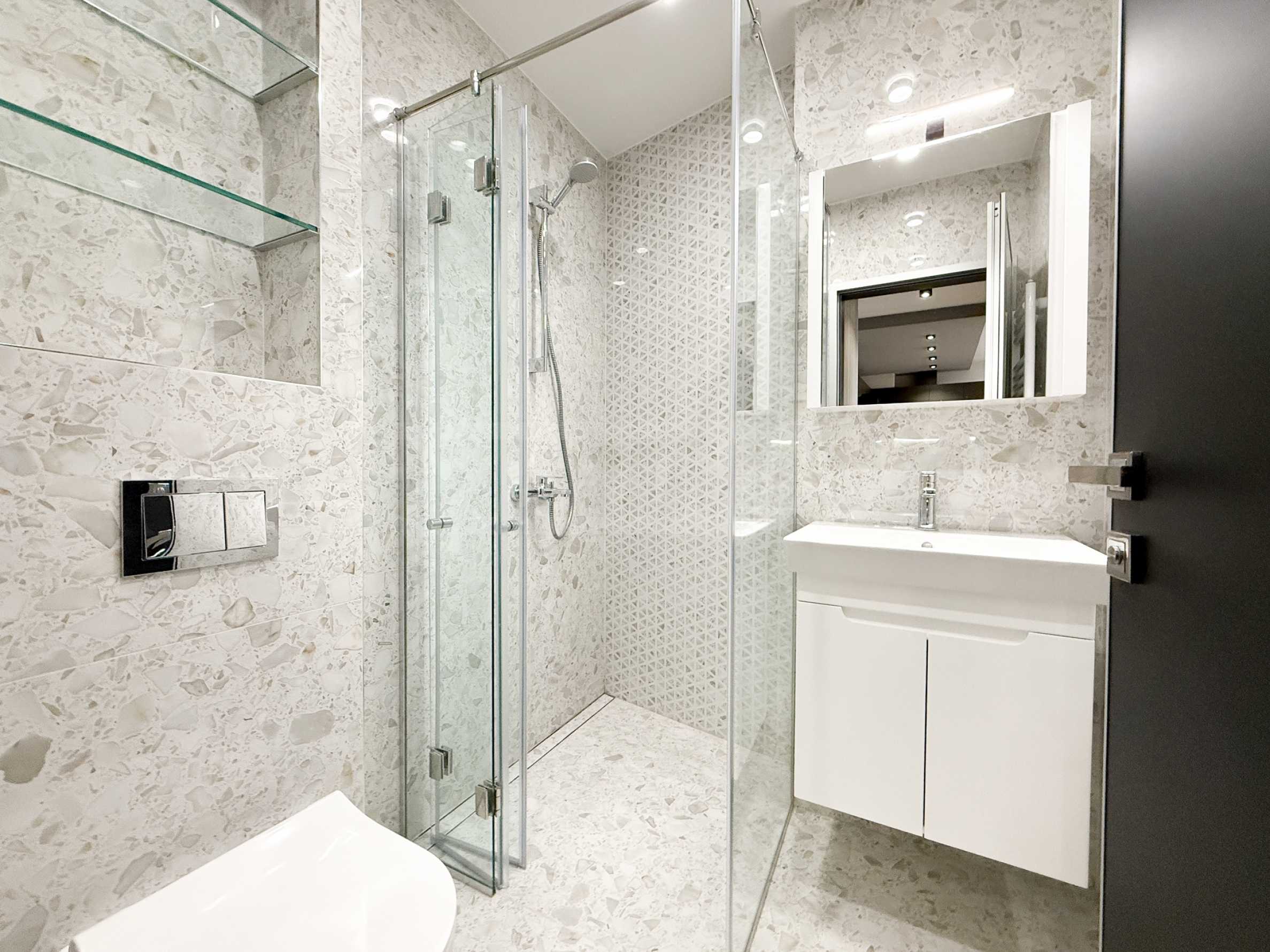 • Das Badezimmer ist mit hochwertigen und stilvollen Sanitäreinrichtungen ausgestattet, darunter Toilette, Waschbecken und Duschkabine.