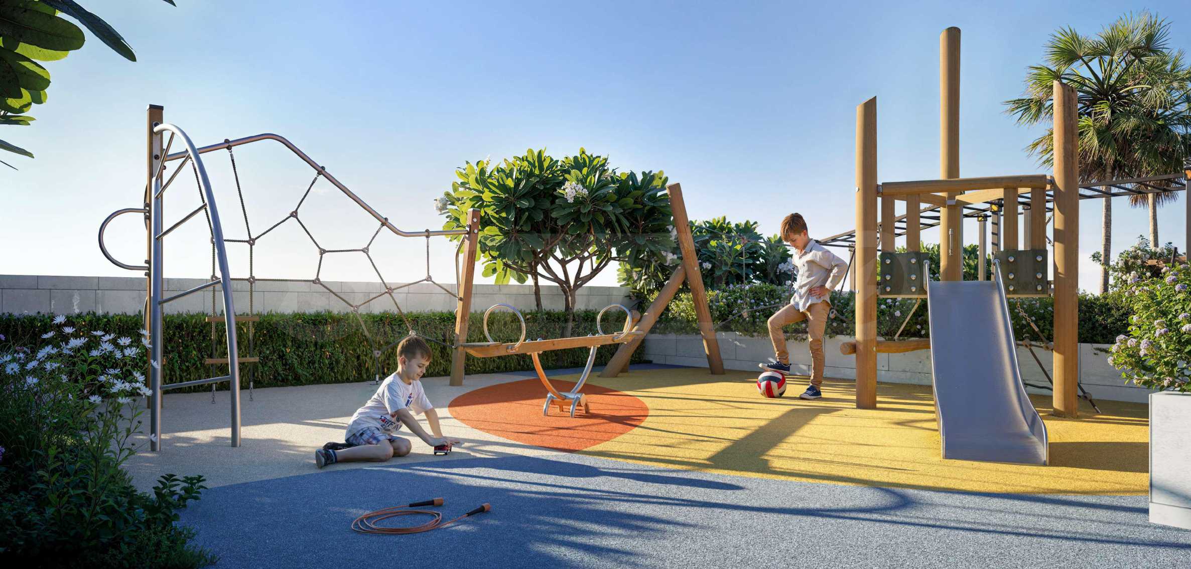 Das Projekt ist als komplettes Wohnumfeld konzipiert, in dem die Bewohner nicht nur den Komfort ihres Zuhauses, sondern auch eine gut organisierte Freizeitgestaltung genießen können. Der Komplex verfügt über einen Swimmingpool für Erwachsene und ein separates Kinderbecken, die von verschiedenen Bereichen zum Entspannen und Erholen umgeben sind. Es gibt ein voll ausgestattetes Fitnessstudio sowie eine stilvolle Lounge, in der man Freunde und Nachbarn treffen kann. Für die Kleinen stehen ein Außenspielplatz und ein Indoor-Spielzimmer zur Verfügung, die eine sichere und anregende Umgebung zum Spielen und Toben bieten. Auf der Dachterrasse befinden sich ein Grillplatz und Fitnessgeräte – der ideale Ort für entspannte Wochenenden und gemeinsame Momente mit der Familie.