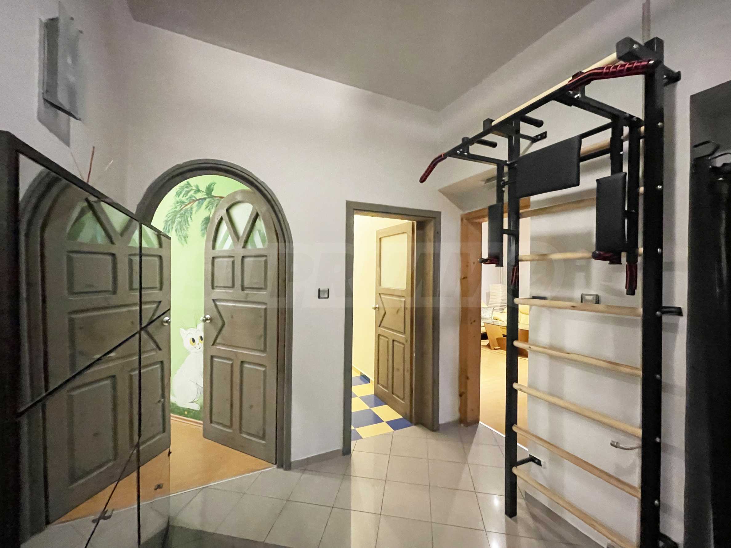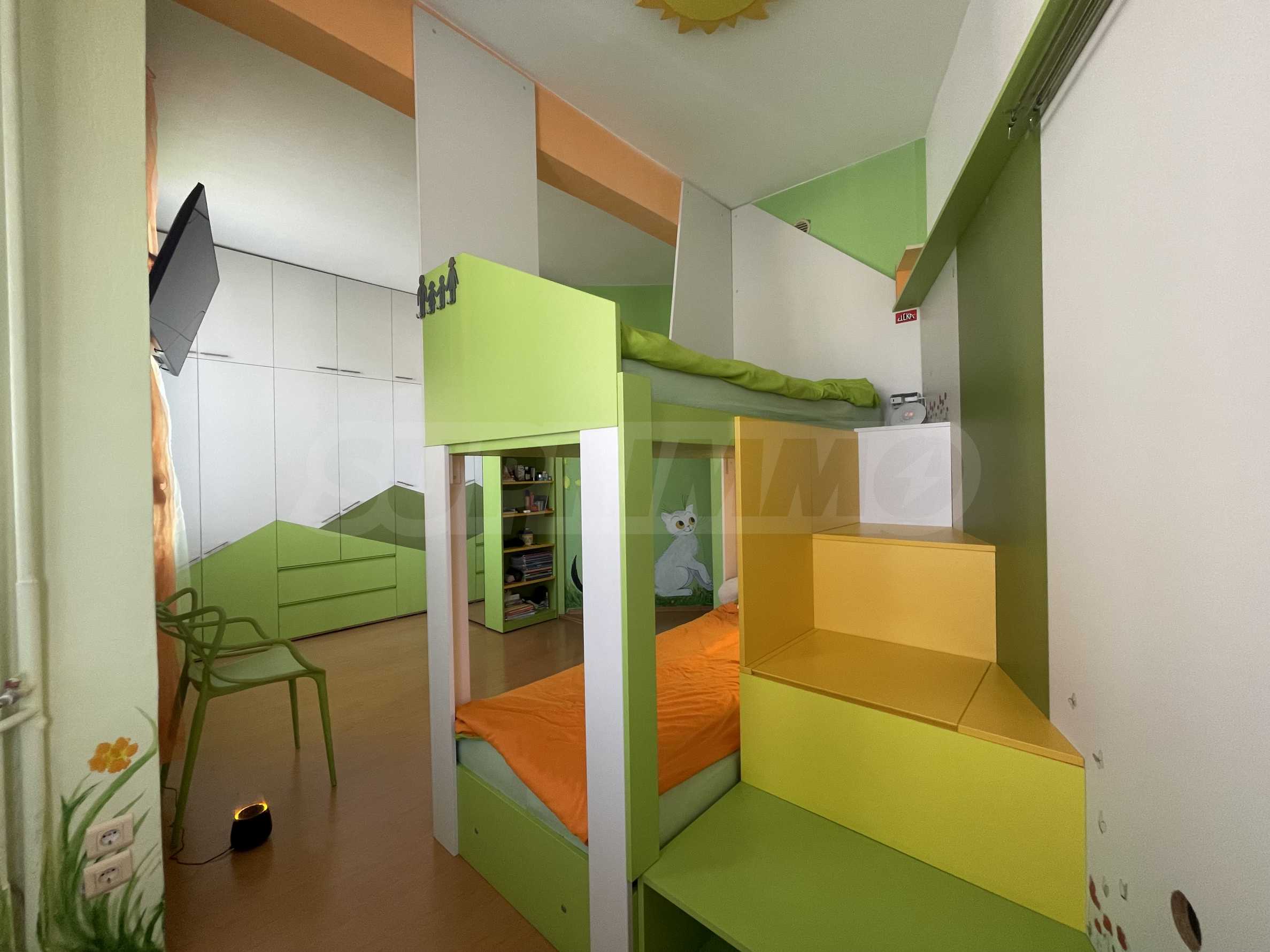 Die separate Küche ist geräumig und komplett ausgestattet. Ein Schlafzimmer eignet sich ideal als Kinderzimmer und verfügt über ein Etagenbett sowie individuell gestaltete Designermöbel. Das Badezimmer ist großzügig geschnitten und funktional. Zusätzlich gibt es einen Abstellraum mit praktischem Stauraum. Im Gemeinschaftsbereich befindet sich außerdem eine Sportecke mit einem Klettersimulator und einer Klimmzugstange.