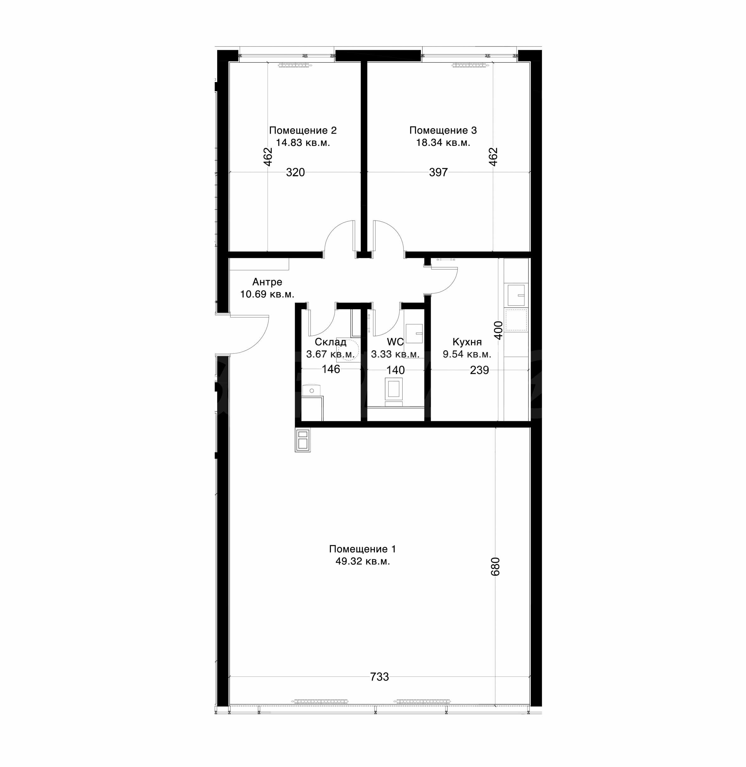 • Zustand: mit verlegten Fußböden, gestrichenen Wänden und installierter Beleuchtung in den drei Arbeitsbereichen sowie einer fertiggestellten Küche und Toilette.