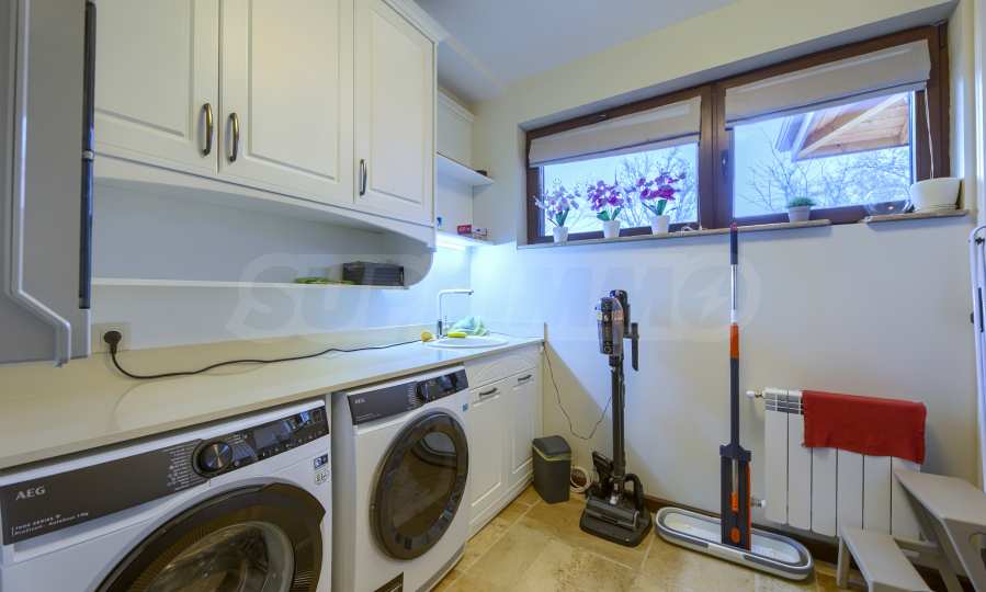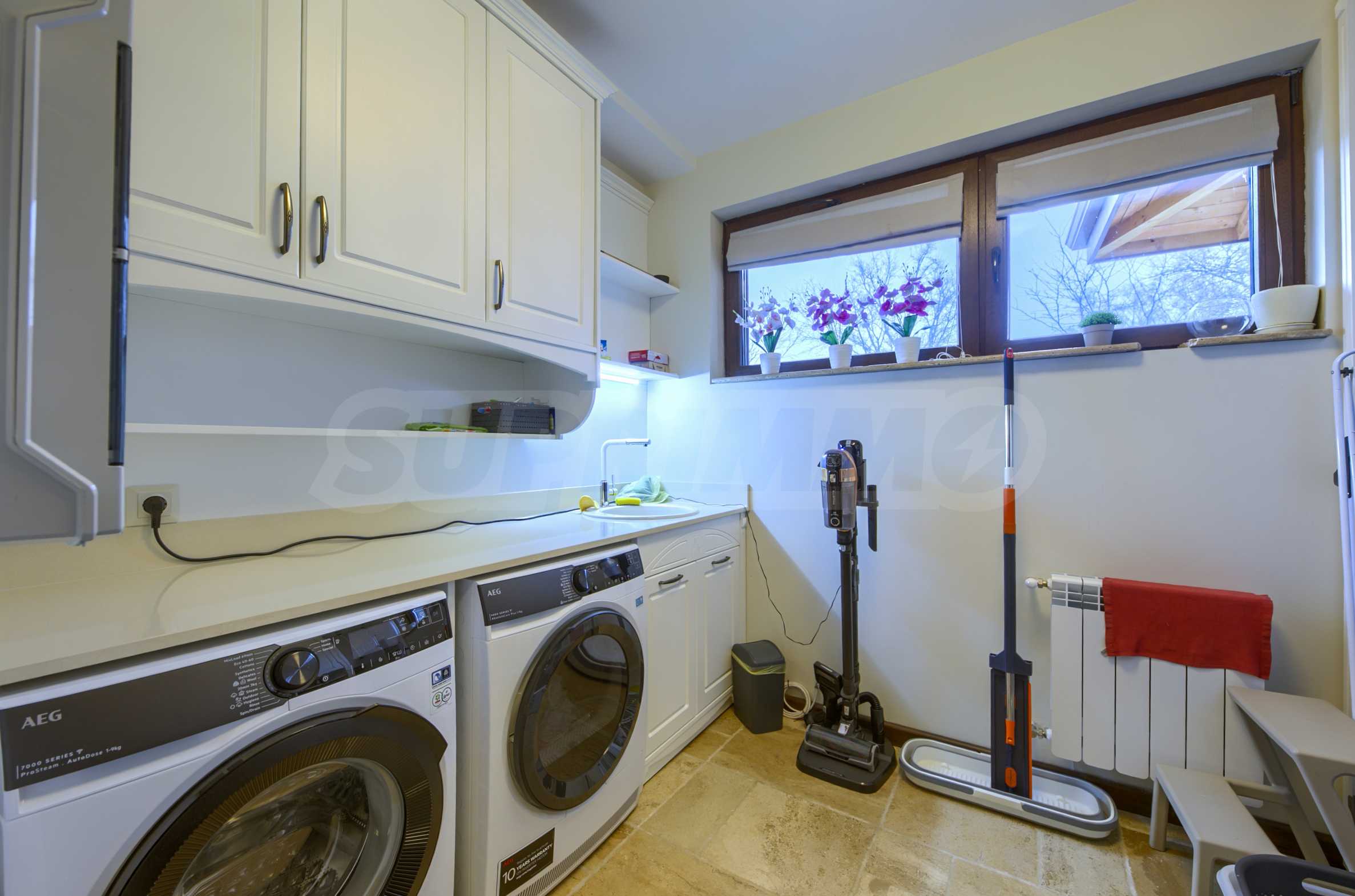 Die Böden bestehen aus Naturmaterialien – Parkett und Granitfliesen. Es gibt drei Abstellräume, einen Hauswirtschaftsraum und eine Waschküche mit hochwertigen Geräten, darunter eine Waschmaschine und ein Trockner von AEG.