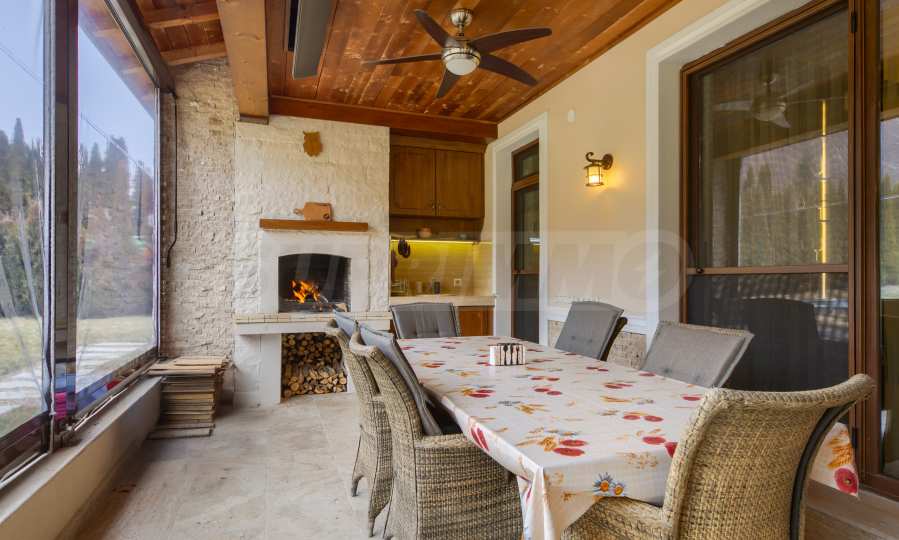 Vom Wohnbereich aus gelangt man direkt auf eine geräumige Veranda , wo eine gemütliche Ecke mit Kamin, Grill und Spüle eingerichtet wurde, die zusätzlichen Komfort bietet und vielfältige Möglichkeiten zur Erholung im Freien eröffnet.
