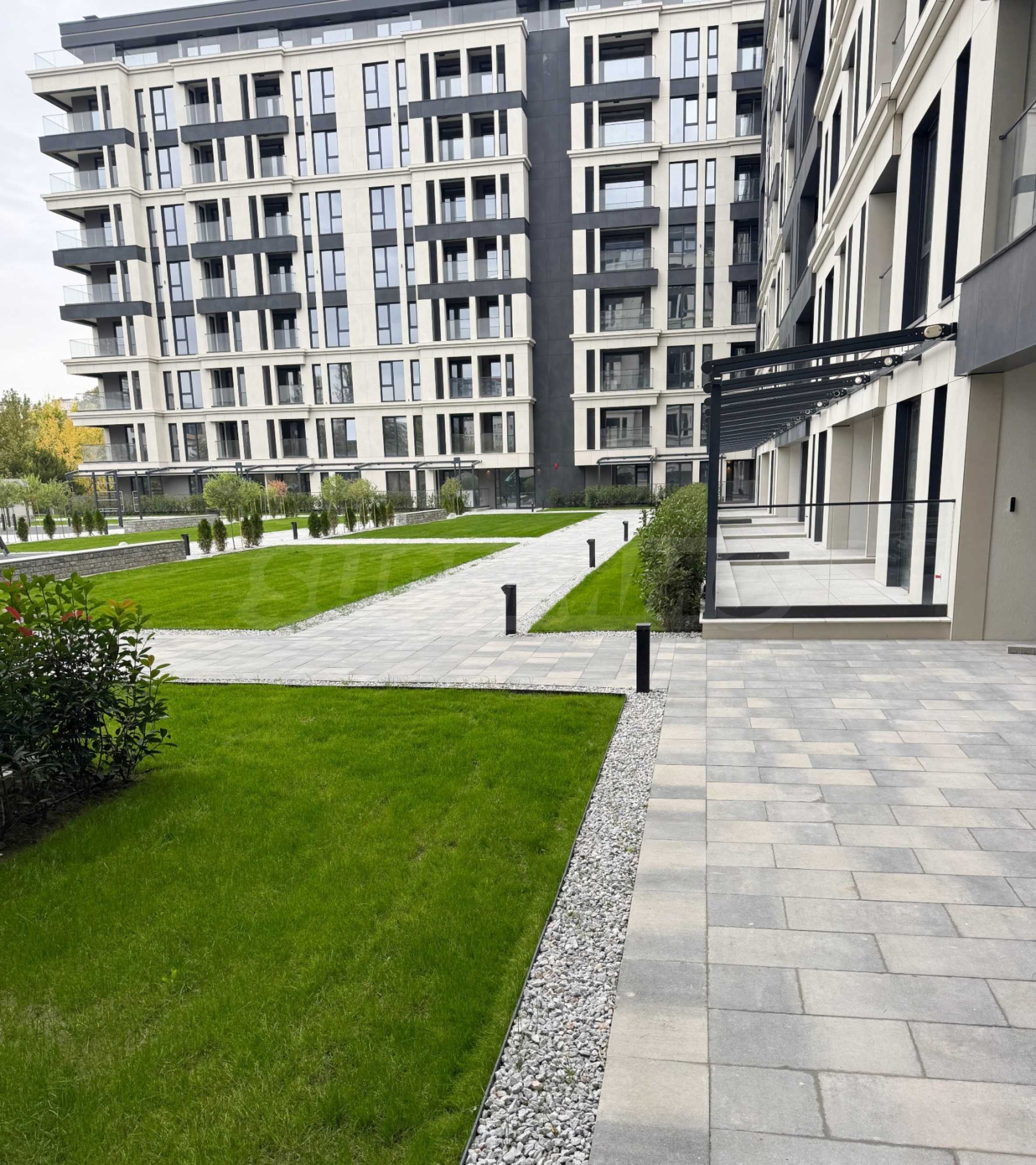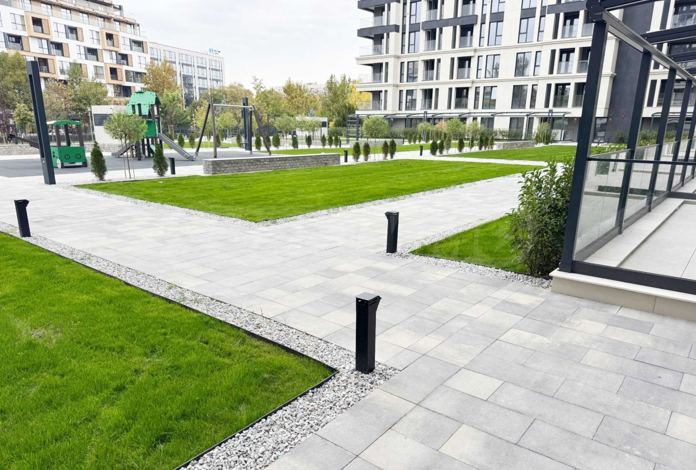 Der Komplex verfügt über eine Parkanlage/einen Innenhof (2500 qm) – eine stilvoll gestaltete Parkanlage mit Gartenbeleuchtung, Zierblumen und Weidelgras, die ganzjährig gepflegt werden – sowie einen geräumigen und modernen Kinderspielplatz.