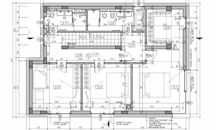 • ein zweites Badezimmer mit Toilette, das den beiden übrigen Schlafzimmern dient.