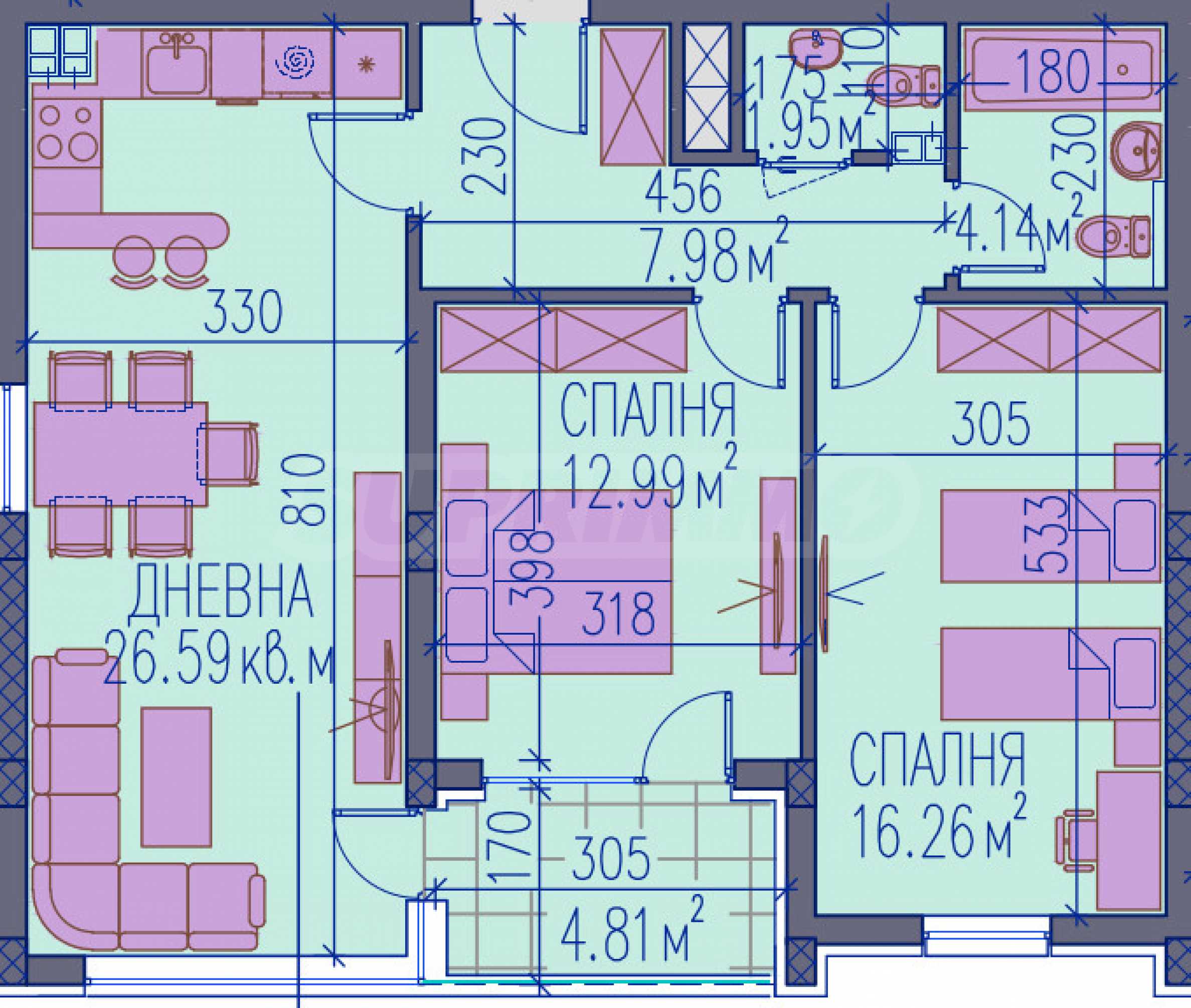Die Wohnung wird im Zustand der Fertigstellung gemäß bulgarischen Baustandards, mit Putz und Estrich, verkauft.
