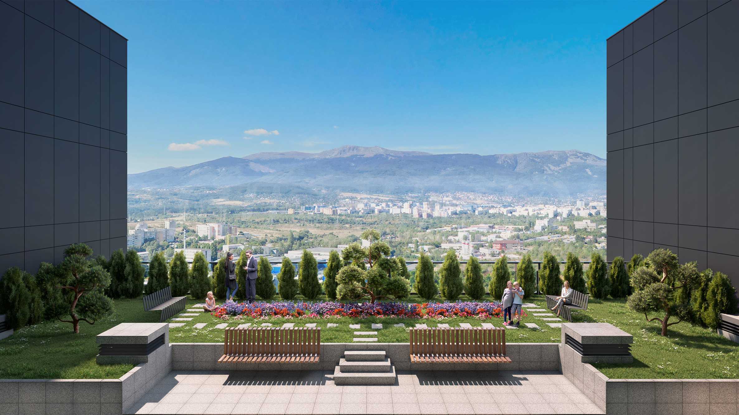 • CITY-Gebäude – Südwestausrichtung mit Blick auf das Vitosha-Gebirge, die Stadt und die Wolkenkratzer.