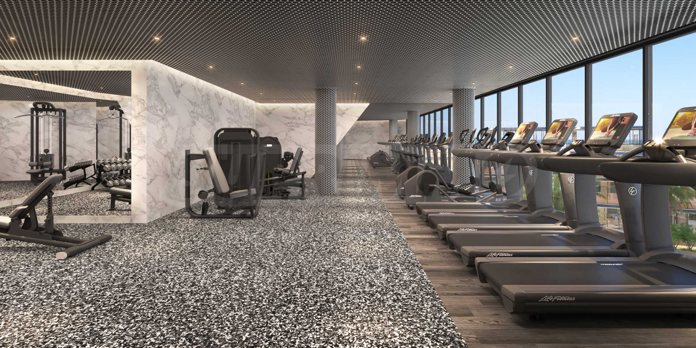 Die Anlage bietet zwei beeindruckende Poolbereiche: einen Panorama-Pool auf dem Dach und einen zweiten, der sich durch den Innenhof schlängelt und vom Lazy-River-Konzept inspiriert ist. Für Kinder gibt es separate Bereiche, die Eltern Ruhe und Unterhaltung bieten. Die Bereiche rund um die Pools laden zum Entspannen und Sonnenbaden ein, und die nahegelegene Bar rundet die Resort-Atmosphäre mit erfrischenden Getränken ab.