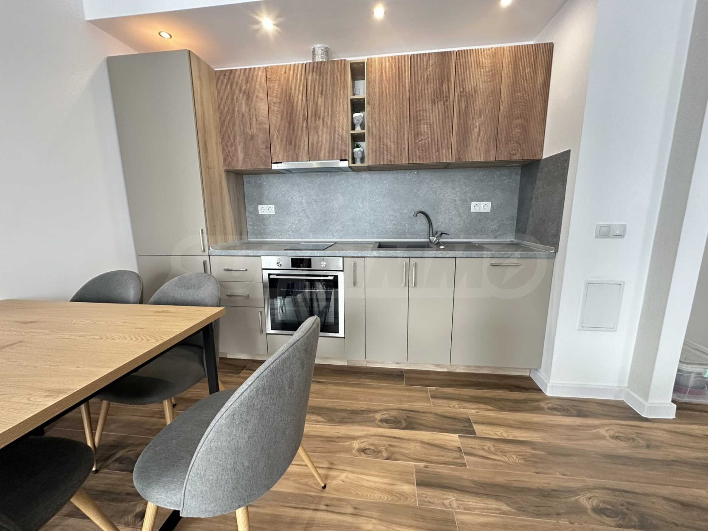 Die Wohnung verfügt über neue Möbel, und im Interieur wurden hochwertige und natürliche Materialien verwendet.