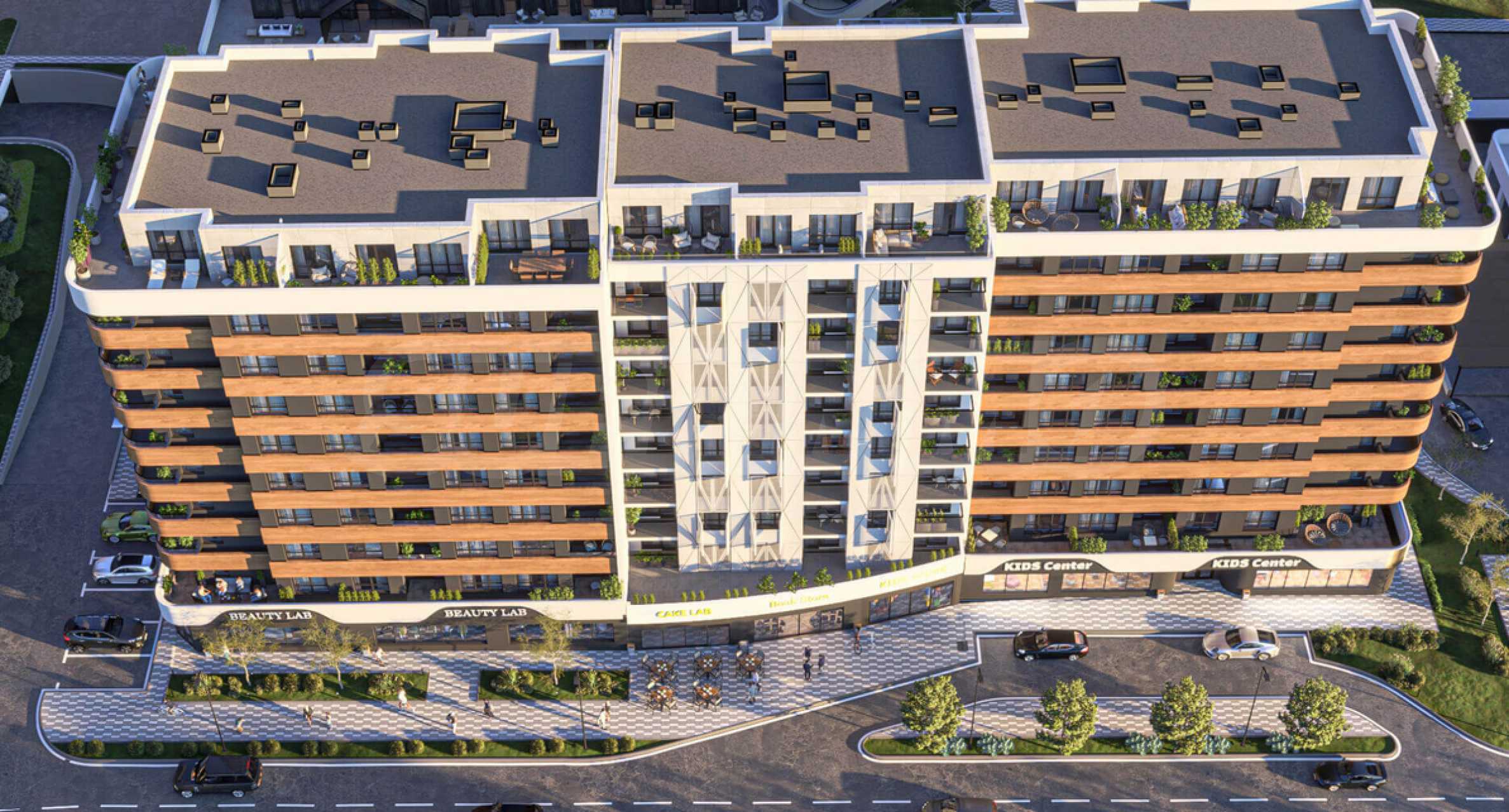 Der Komplex ist gemischt genutzt; im Erdgeschoss sind Gewerbeflächen und Büros geplant.