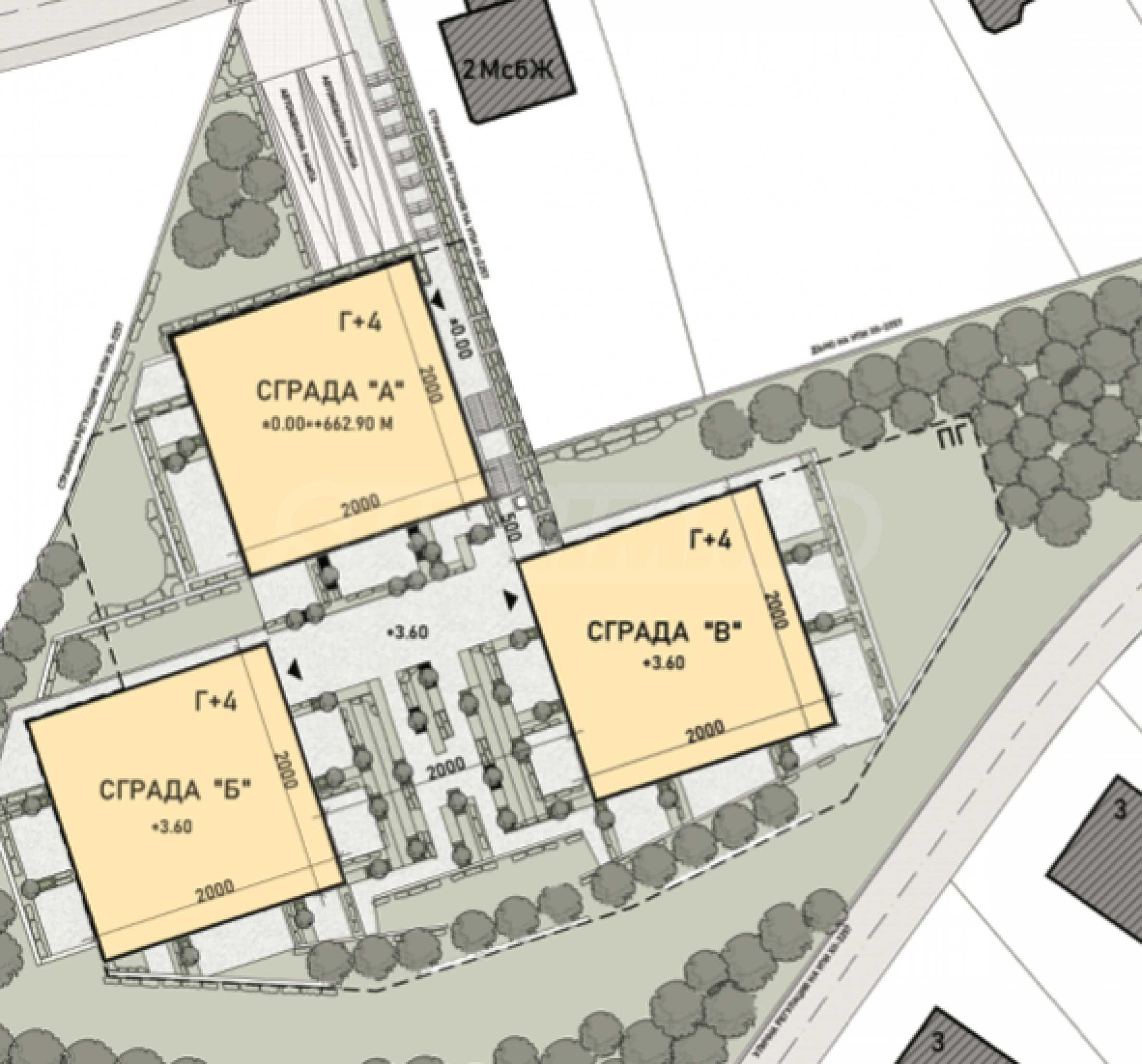 • Drei unabhängige vierstöckige Wohngebäude – A, B und C;