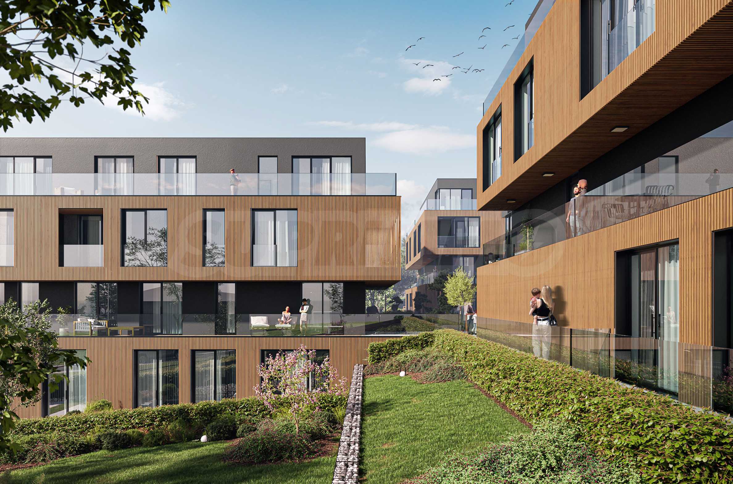• Glasgeländer und moderne Fassadenelemente, die harmonisch in die Umgebung integriert sind;