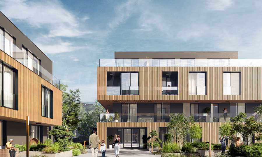 • Fassade aus Holzverbundwerkstoff und anthrazitfarbenem Putz, die sich harmonisch in die Umgebung einfügt.