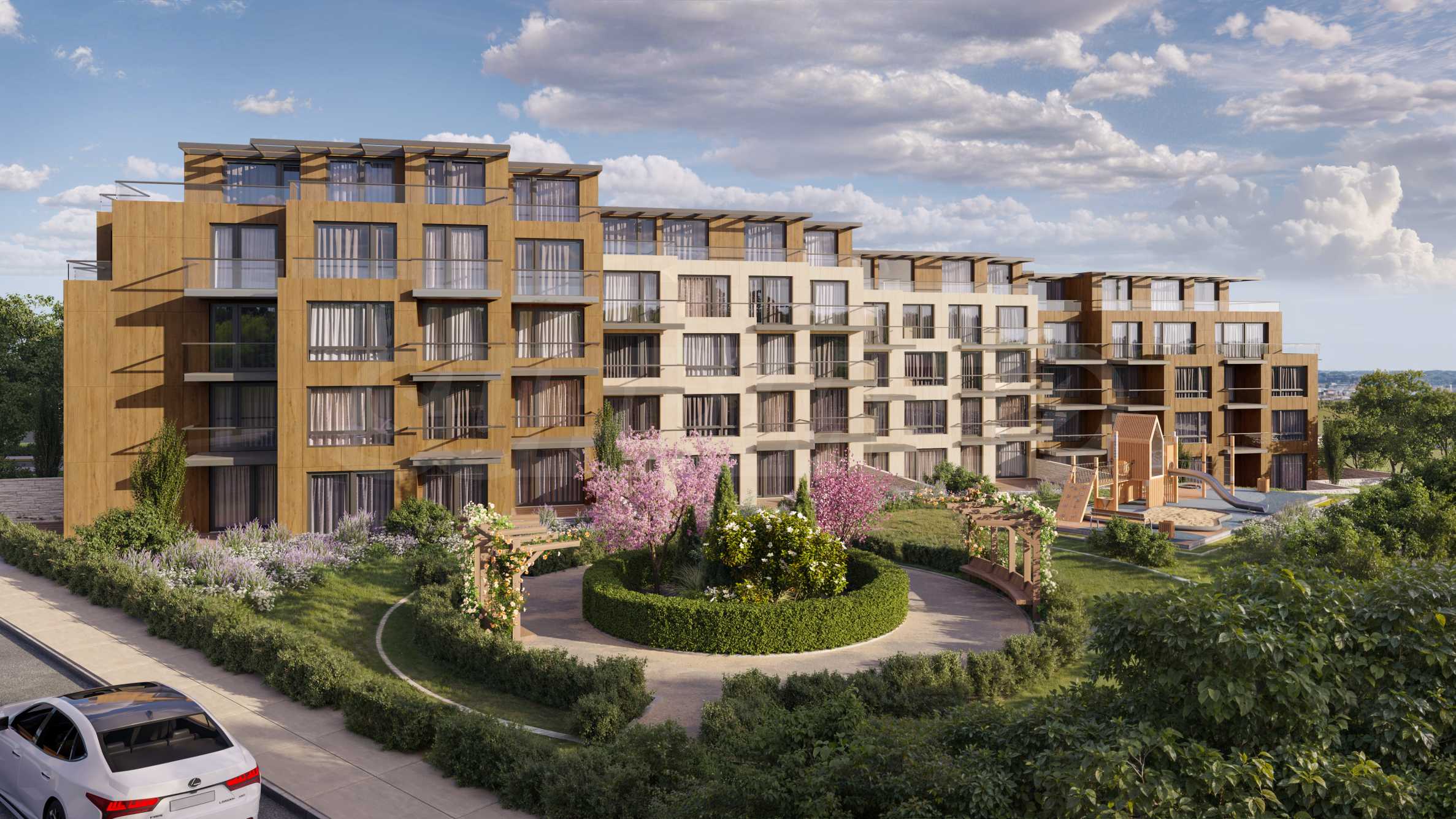 Die Anlage erstreckt sich über ein 21.000 m² großes Grundstück und bietet eine Vielzahl an Wohnungen mit praktischen Grundrissen, Tiefgaragenstellplätzen und üppig gestalteten Gemeinschaftsflächen. Die Räume sind so angeordnet, dass sie ein Gefühl von Komfort, Licht und Großzügigkeit vermitteln.