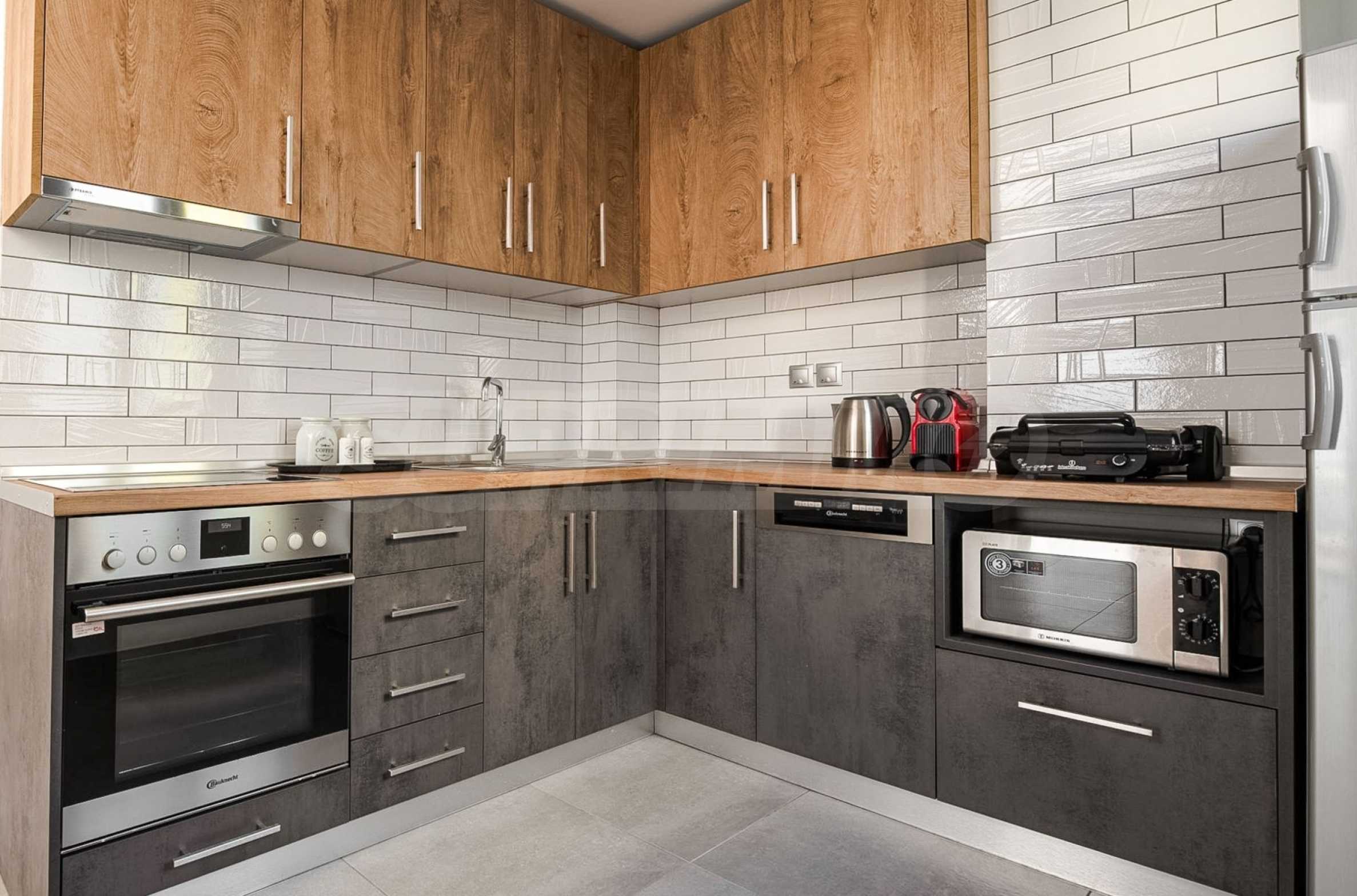 Die Küche: Der Traum eines jeden Feinschmeckers – anthrazitfarbene Oberflächen, Holztexturen und Einbaugeräte, bereit für die Zubereitung der frischesten Meeresfrüchte vom lokalen Markt.