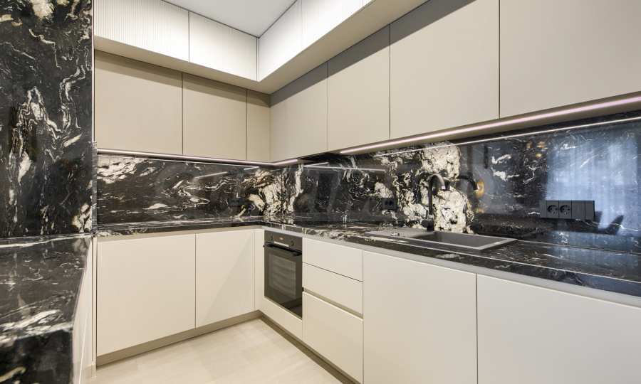Die Wohnung ist Teil eines modernen Wohnkomplexes mit beeindruckender Architektur, darunter eine abgehängte Fassade aus großformatigen Laminam-Platten und hochwertigen Materialien.