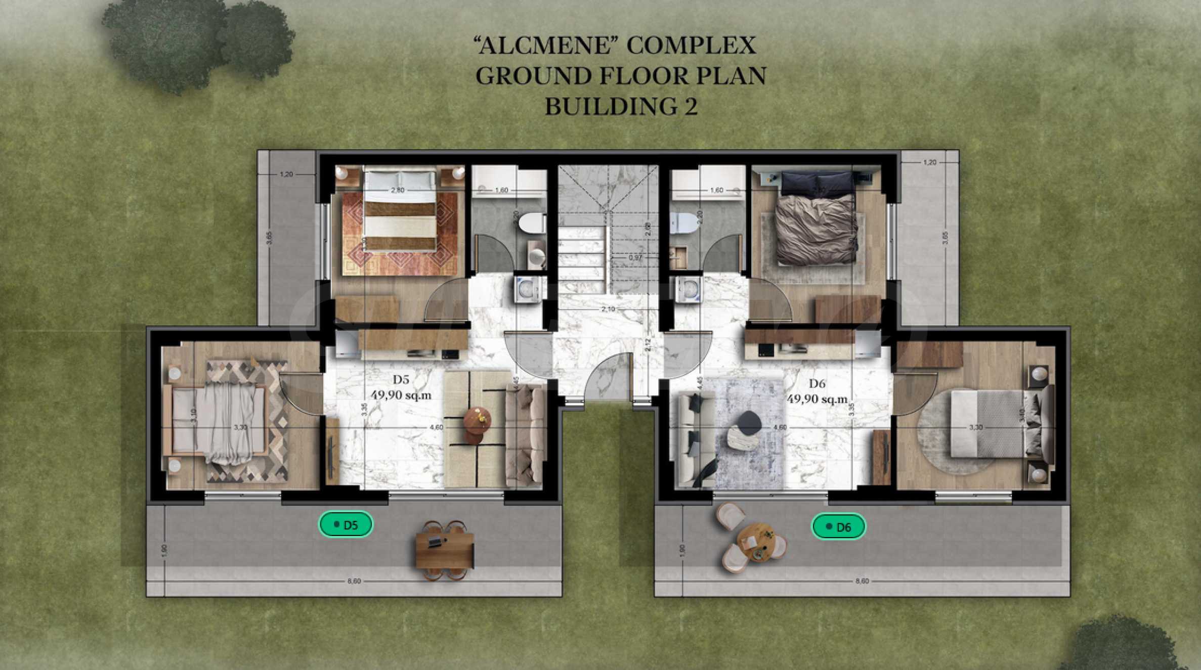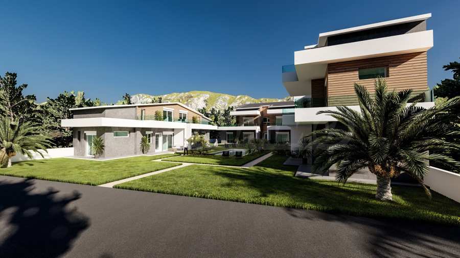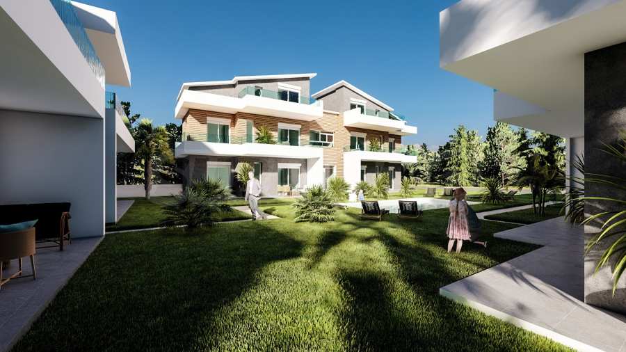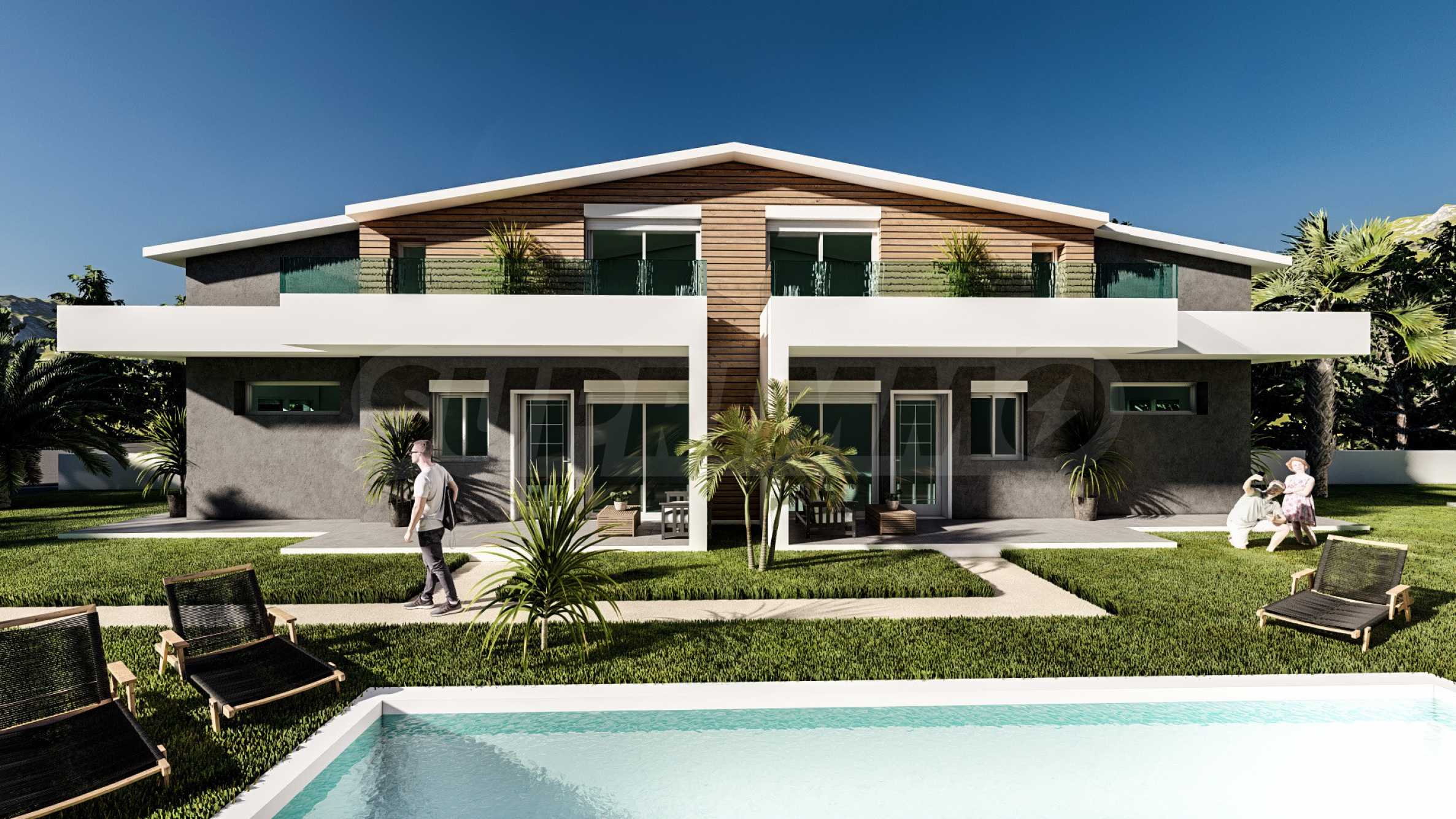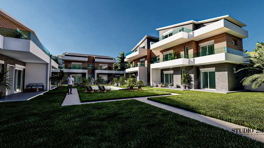 Die Anlage wurde mit Fokus auf Privatsphäre und Komfort konzipiert und besteht aus drei Gebäuden – zwei mit je vier Wohnungen und einem mit zwei Wohnungen. Dies sorgt für ein ruhiges und harmonisches Wohnumfeld. Den Bewohnern steht ein Gemeinschaftspool zur Verfügung, der in den Sommermonaten für angenehme Abkühlung sorgt. Die Anlage bietet Zwei- und Dreizimmerwohnungen mit funktionalen Grundrissen, die auf die Bedürfnisse eines modernen Lebensstils zugeschnitten sind. Die Zweizimmerwohnungen befinden sich im Erdgeschoss und verfügen über Veranden und direkten Zugang zum Garten, während die Dreizimmerwohnungen sonnige Terrassen im ersten und zweiten Obergeschoss bieten.