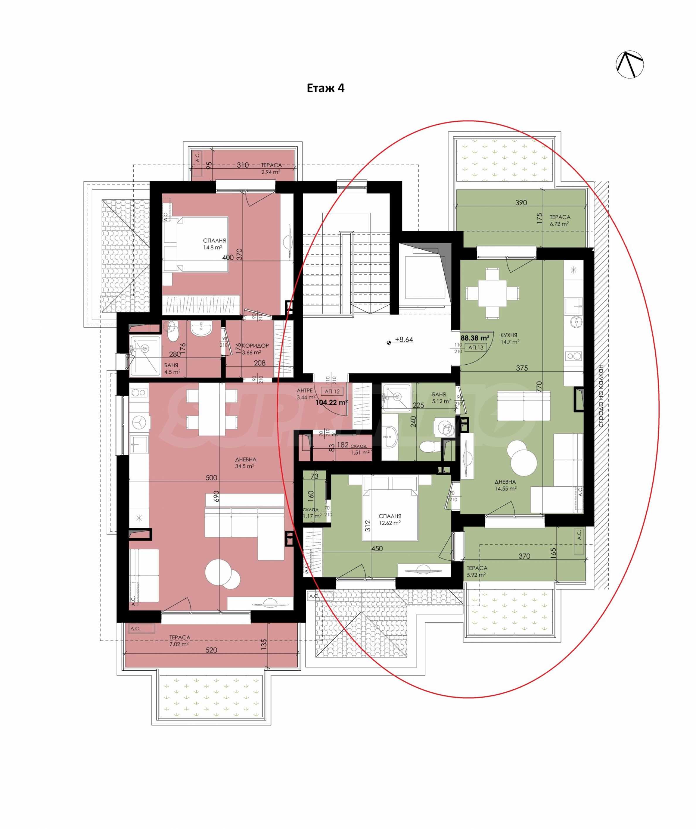 Das Objekt hat eine Gesamtfläche von 95,49 m² und befindet sich im vierten Stock mit Südwestausrichtung.