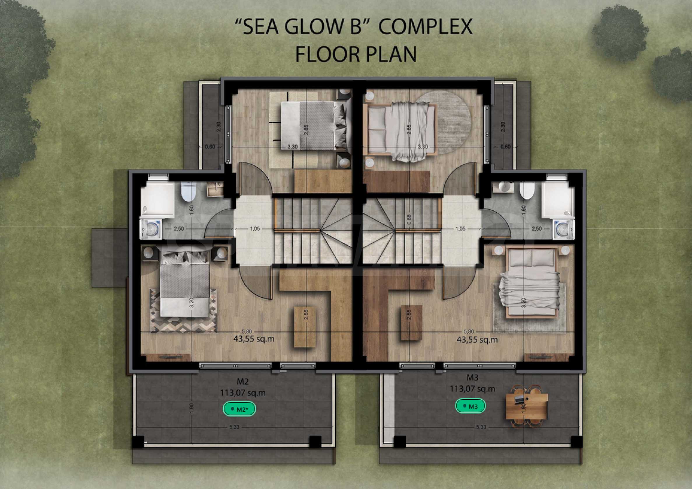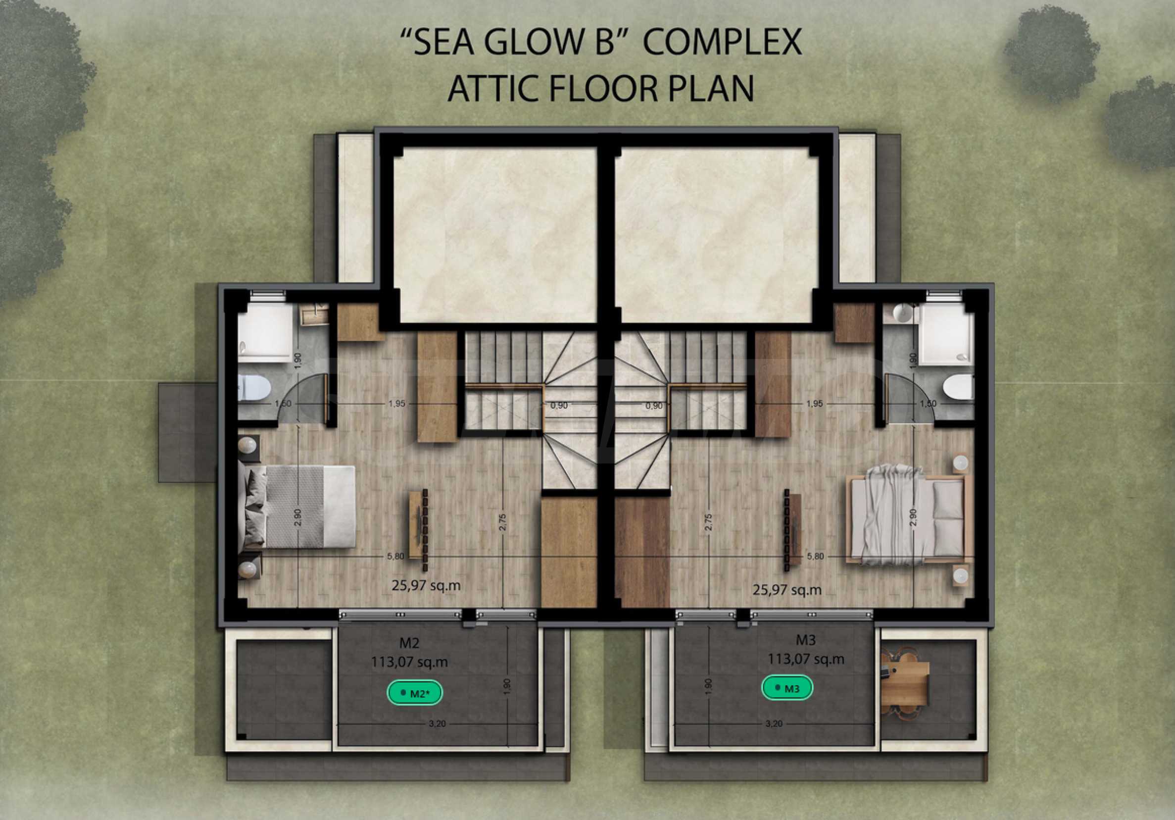 • Zweite Ebene: zwei Schlafzimmer, jeweils mit eigenem Badezimmer und Zugang zu einer Terrasse;