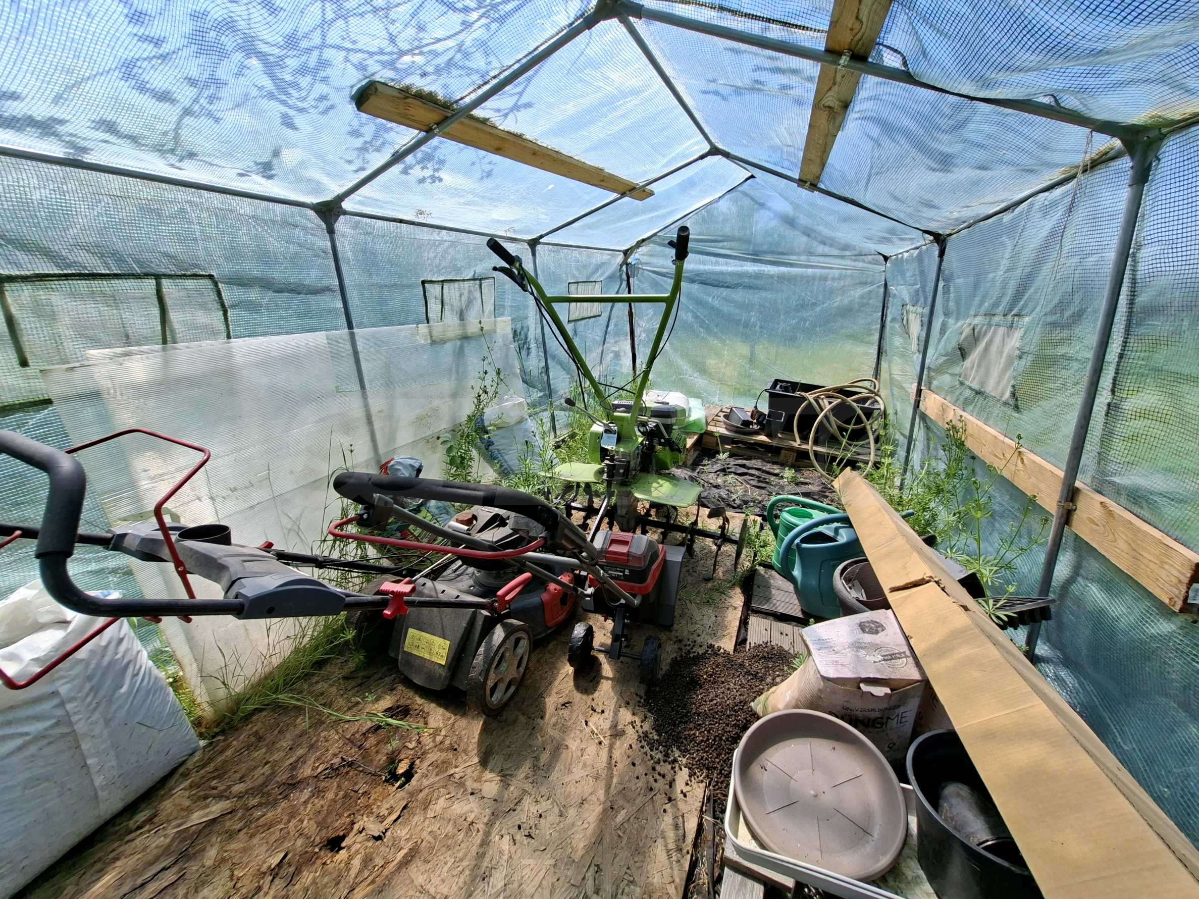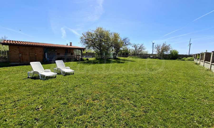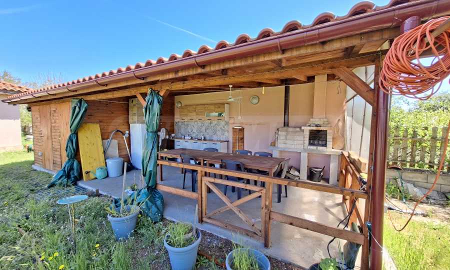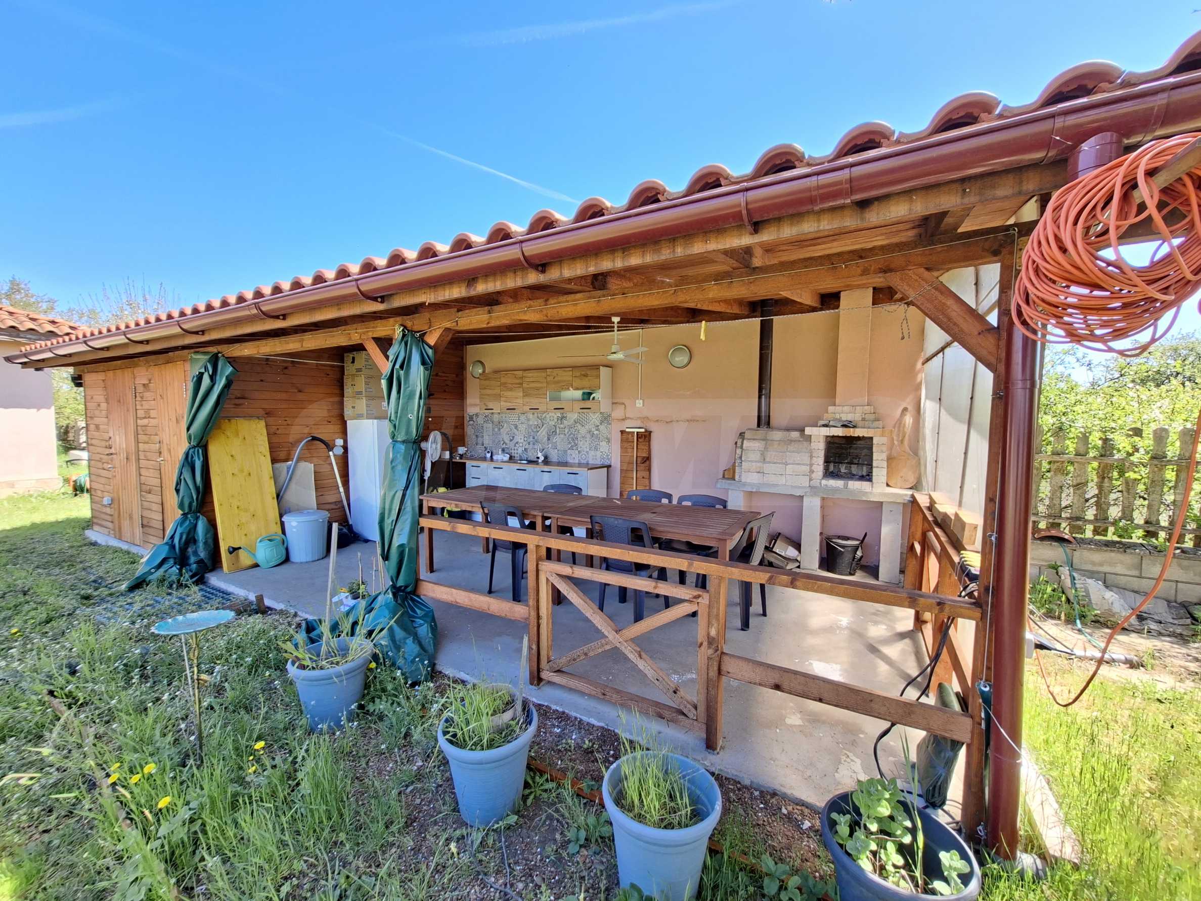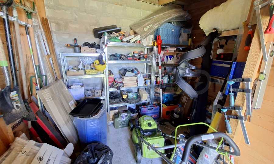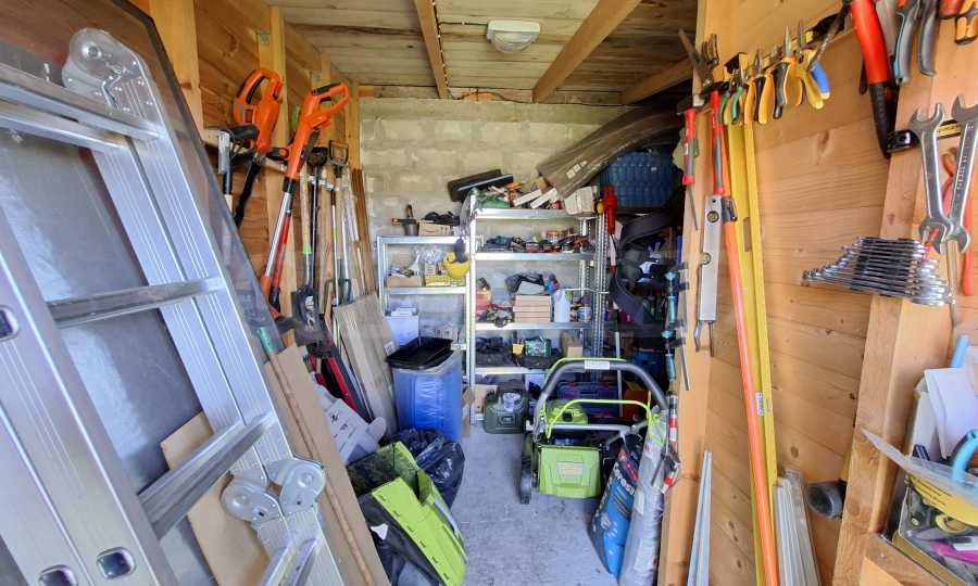 Der 1000 m² große Garten ist gepflegt und schön angelegt. Er verfügt über eine voll ausgestattete Sommerküche (40 m²), eine Toilette und eine Werkstatt mit verschiedenen Werkzeugen. Außerdem gibt es ein kleines mobiles Gewächshaus. Am Eingang befindet sich ein überdachter Parkplatz.